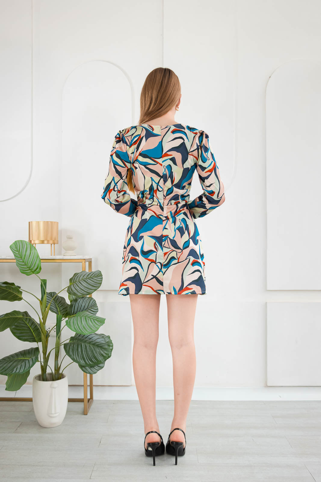 Vestido corto confeccionado en seda con un brillo sutil, cuello cerrado y mangas largas con detalle de pinzas en la cintura.