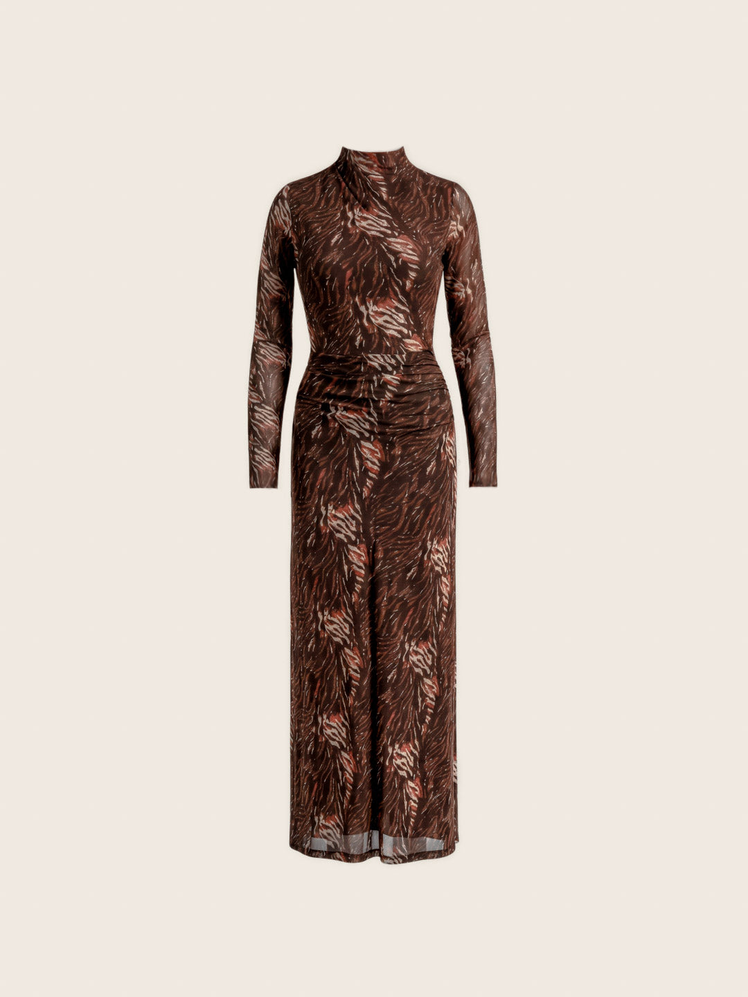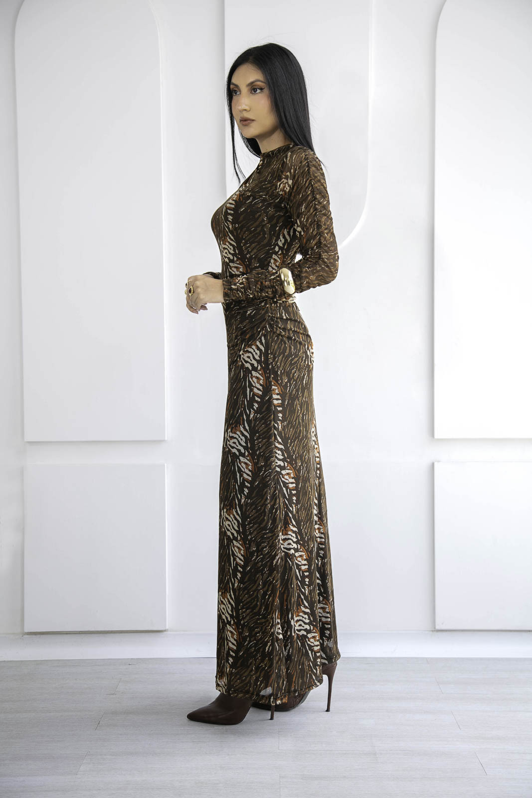 Vestido largo con mangas largas y detalle drapeado en la parte del cuello y caderas, elaborado de malla forrada perfecto para esta temporada.