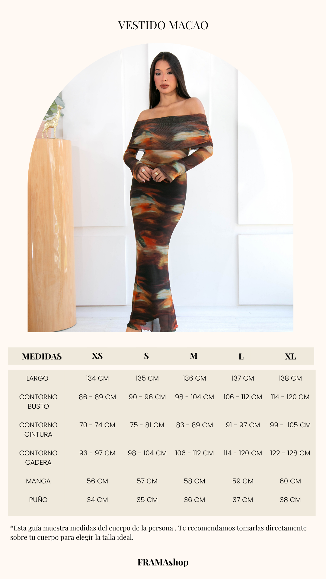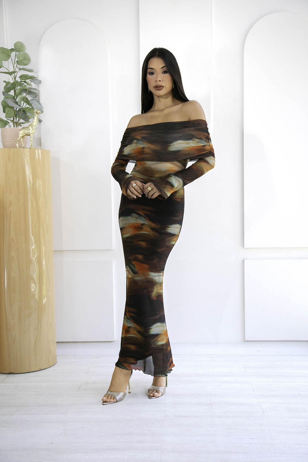 Un vestido que roba miradas. Macao es una pieza elegante y sofisticada que combina el mix de tonos tierra, verdes profundos y matices cálidos efecto degradado que envuelve el cuerpo con sutileza y sensualidad. Su diseño off shoulder resalta los hombros, mientras que su silueta ceñida al cuerpo estiliza y alarga la figura.