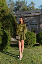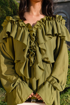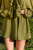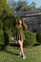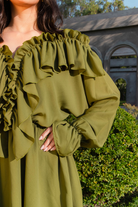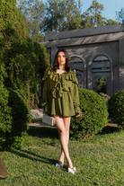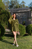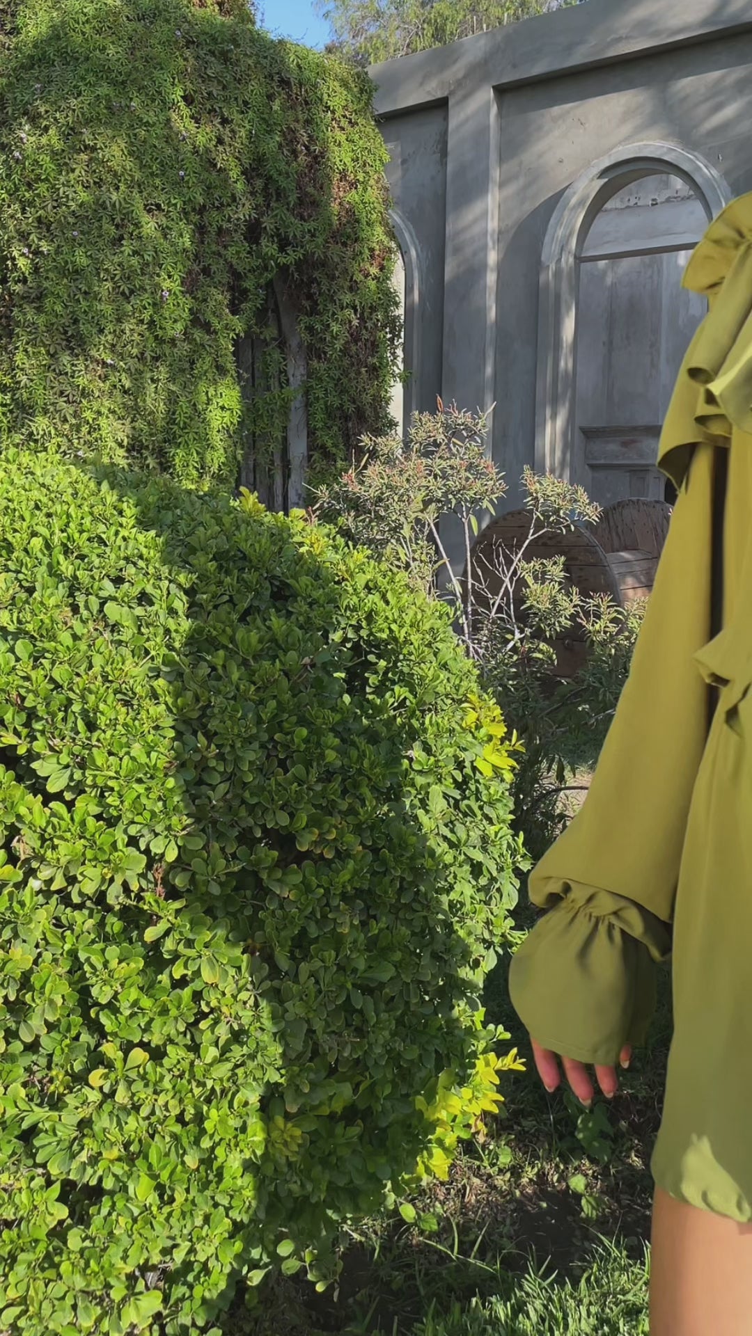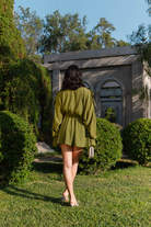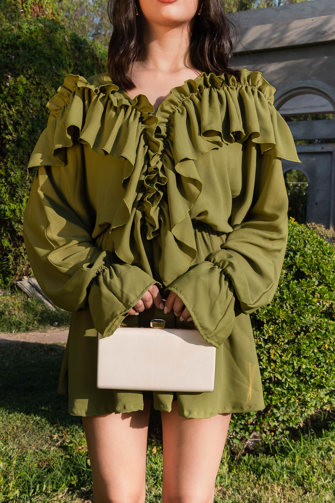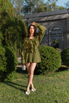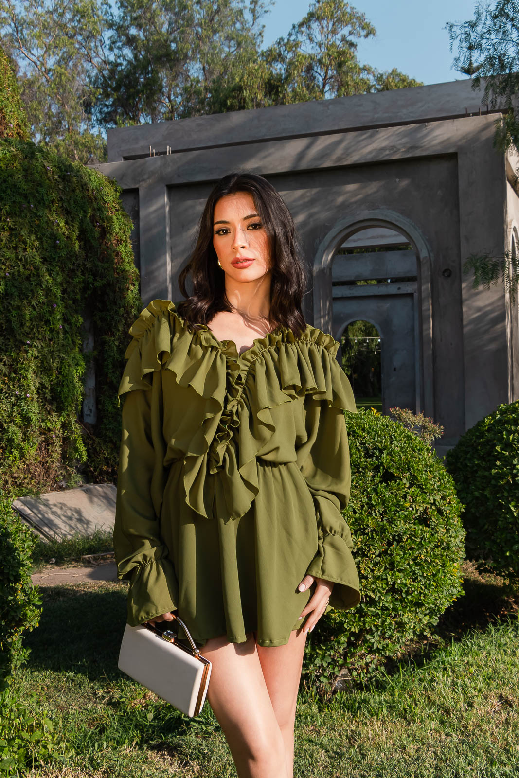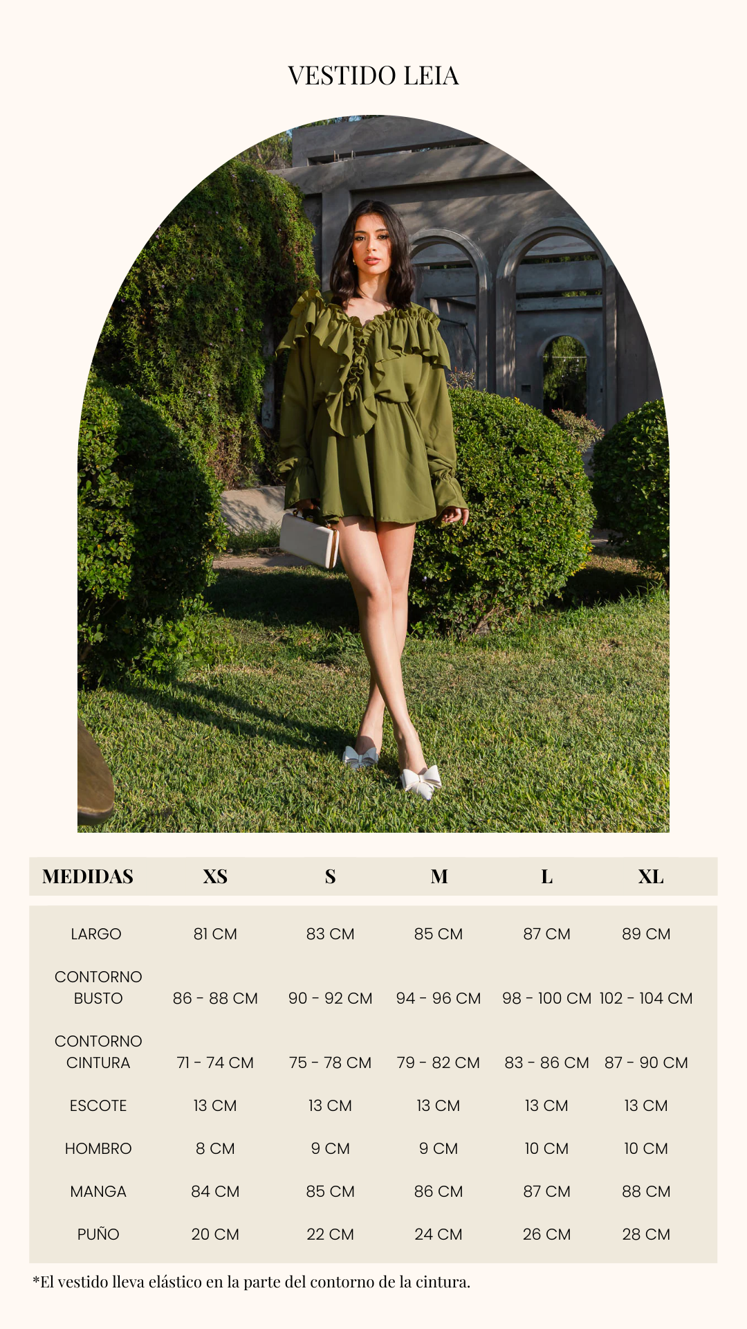 Leia se presenta en un tono verde oliva, fresco y sofisticado, que evoca la esencia de la naturaleza y resalta la feminidad con elegancia de estilo boho. Diseño fluido con vuelos en el escote y mangas, evoca una elegancia que equilibra lo romántico con lo contemporáneo.