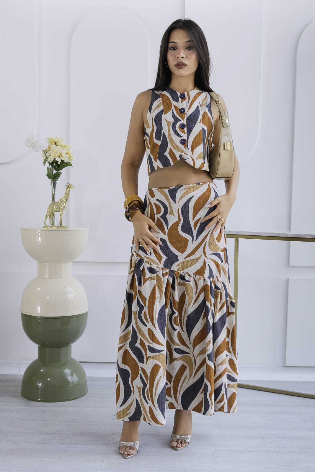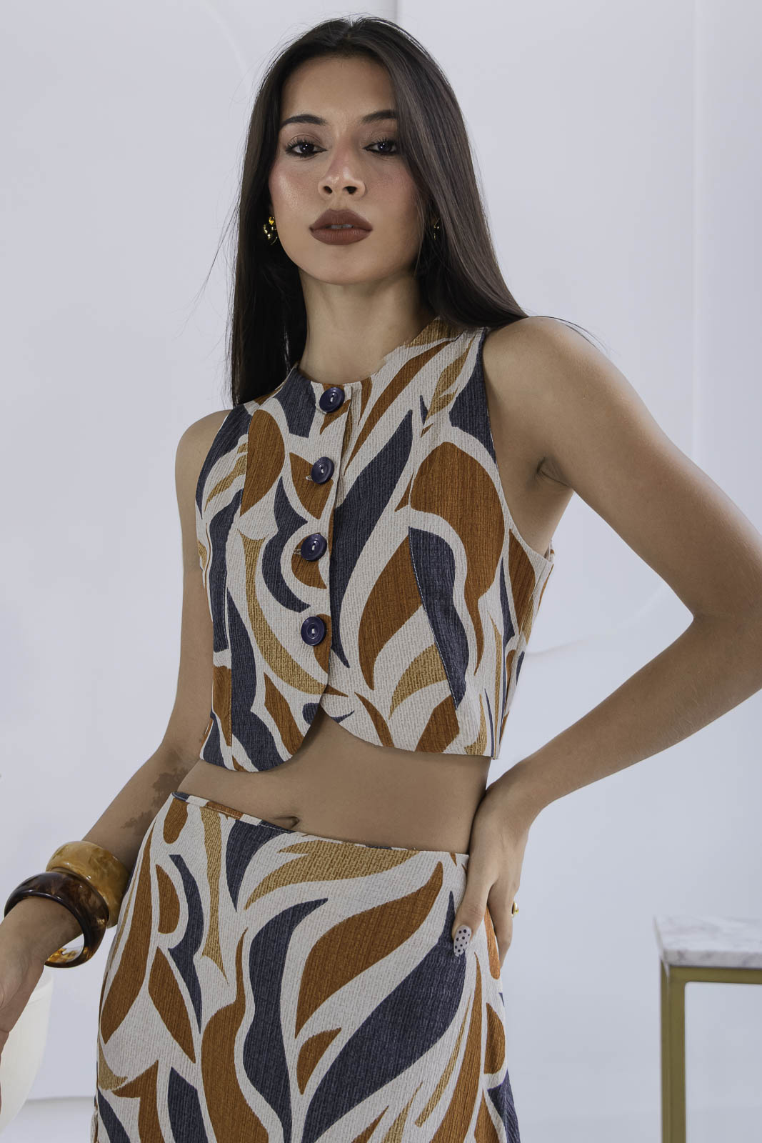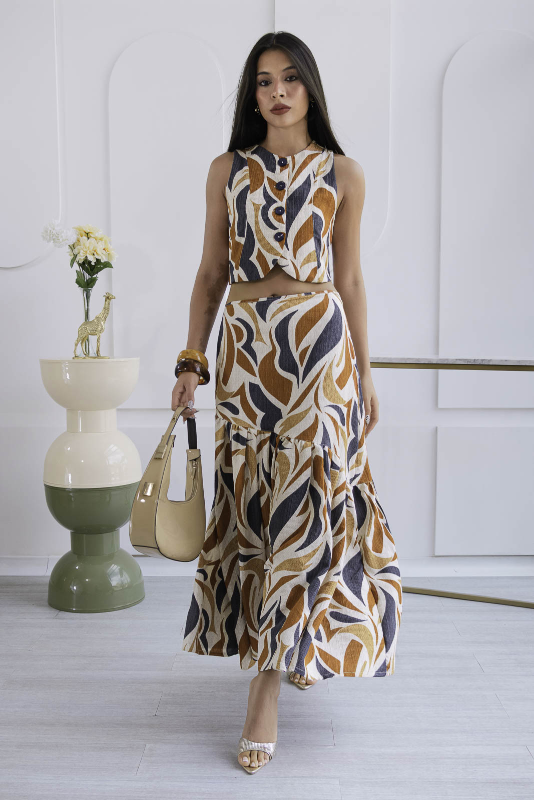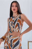 Un conjunto que enamora a primera vista. Set 2 de piezas, en tonos estampado en tonos ámbar, marfil y negro creando un contraste sofisticado y elegante.