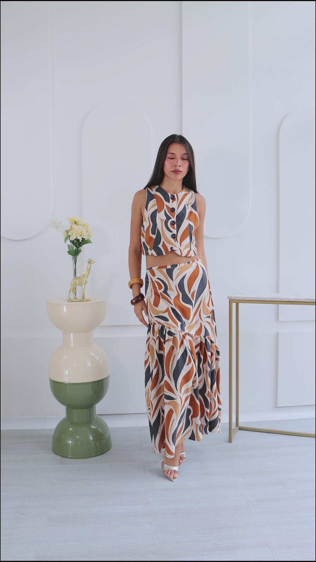 Chaleco de silueta estructurada y corte limpio, estiliza la parte superior y enmarca el torso de manera favorecedora. Falda larga con pliegues de caída amplia crea un movimiento ligero y elegante.