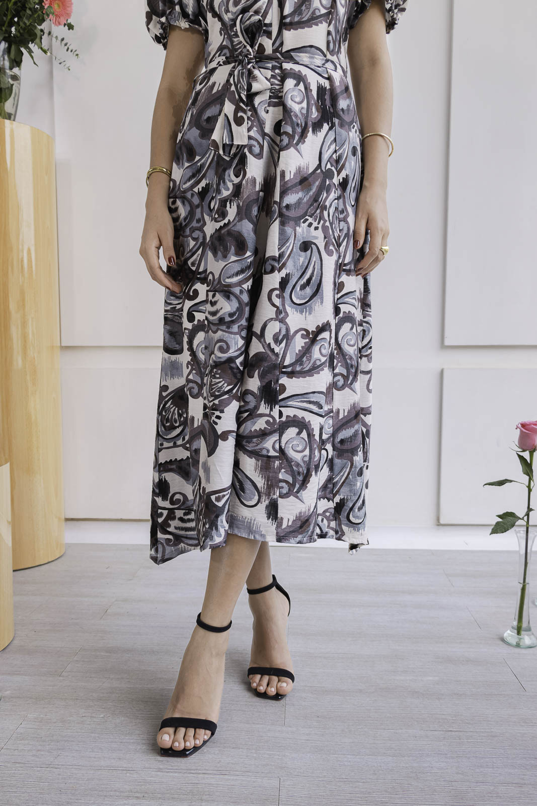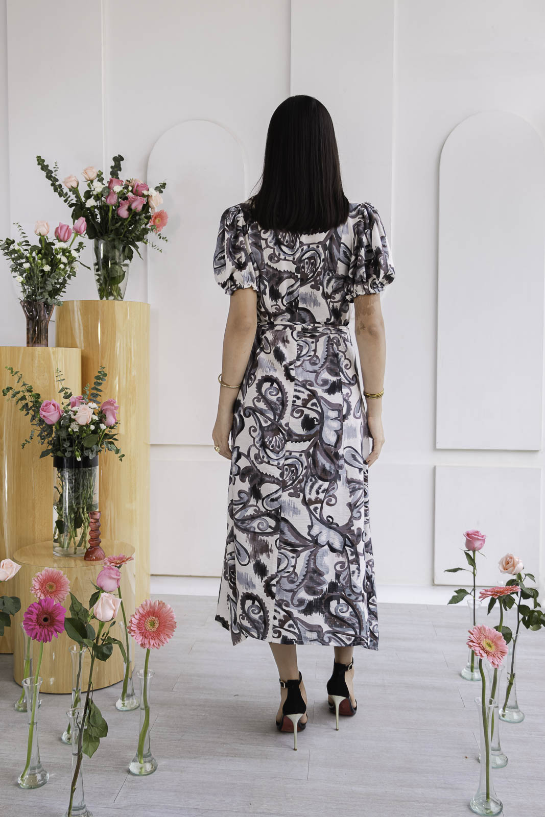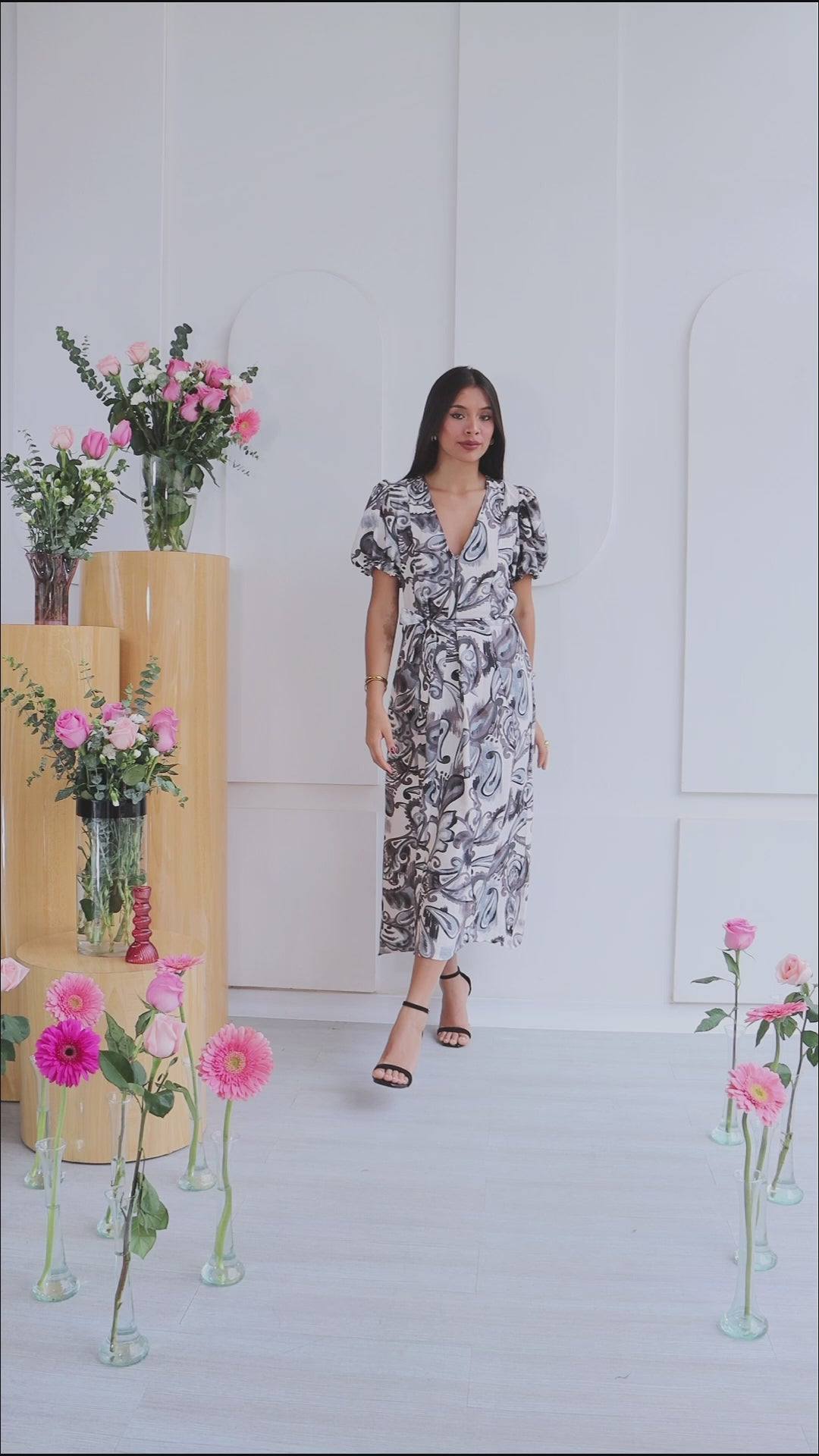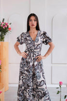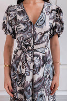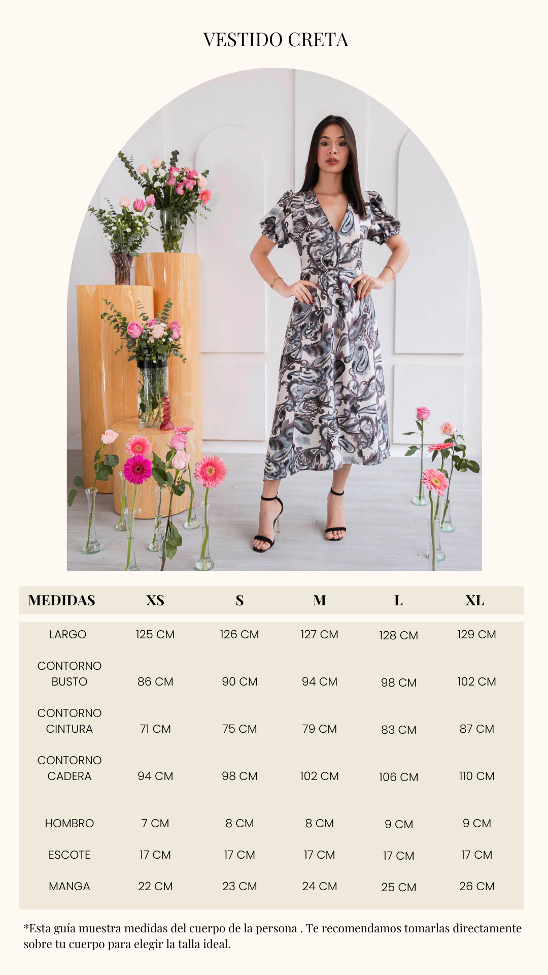 Con estampado en tonos neutros, una combinación de grises, negros y suaves toques de blanco, le dan un contraste sofisticado y elegante. Las mangas abullonadas aportan volumen sutil y un toque romántico, mientras que el escote en “V” estiliza el cuello y el elástico en la cintura define la silueta de forma favorecedora y cómoda.