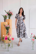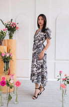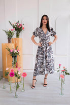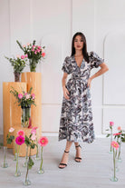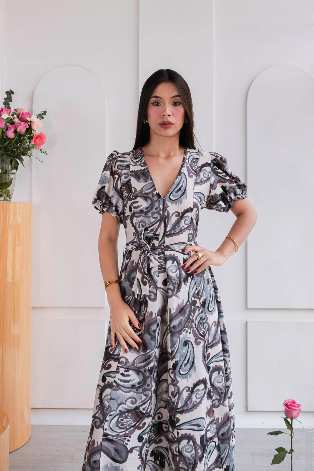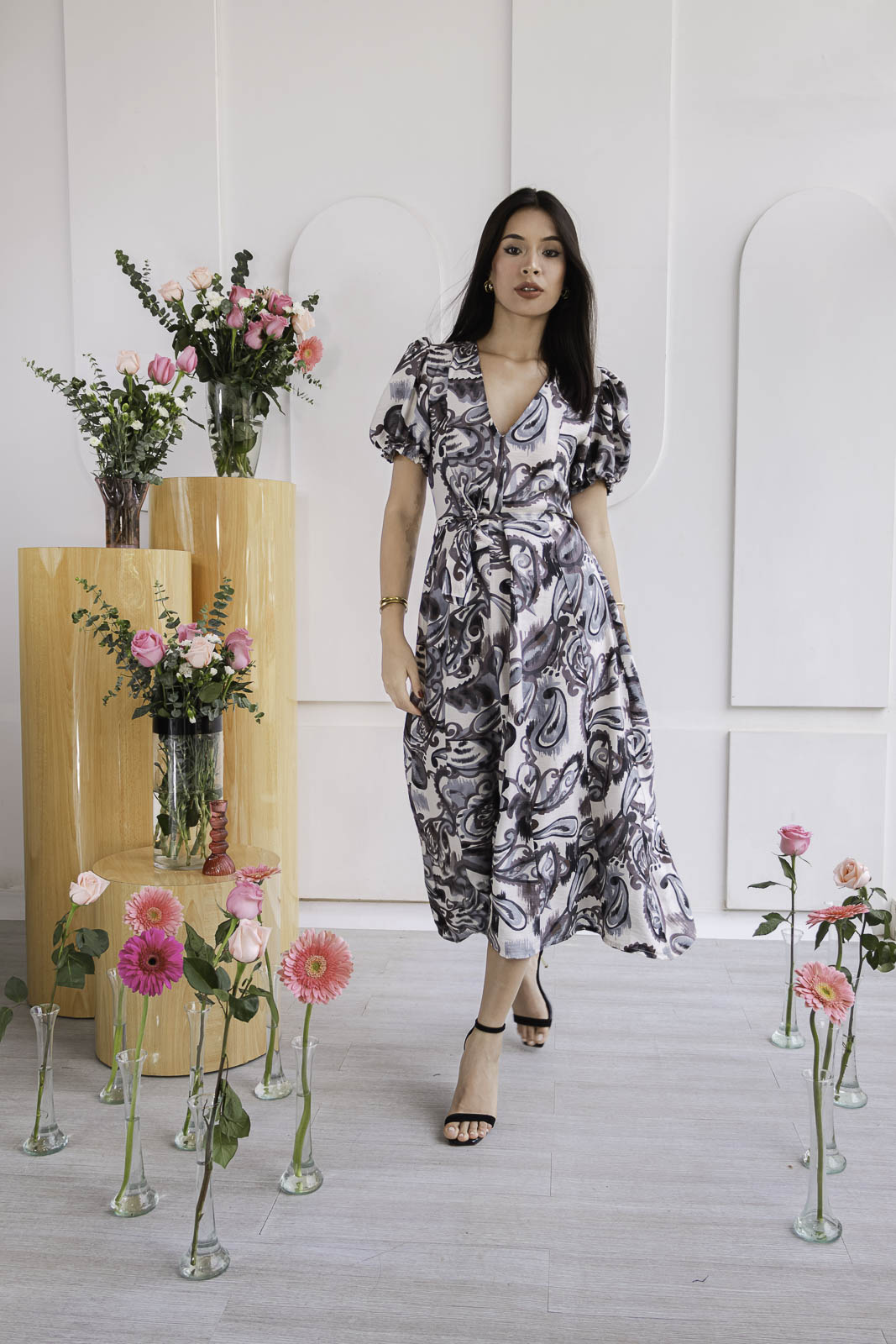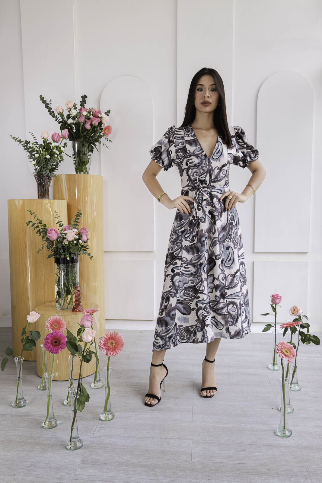 Con estampado en tonos neutros, una combinación de grises, negros y suaves toques de blanco, le dan un contraste sofisticado y elegante. Las mangas abullonadas aportan volumen sutil y un toque romántico, mientras que el escote en “V” estiliza el cuello y el elástico en la cintura define la silueta de forma favorecedora y cómoda.