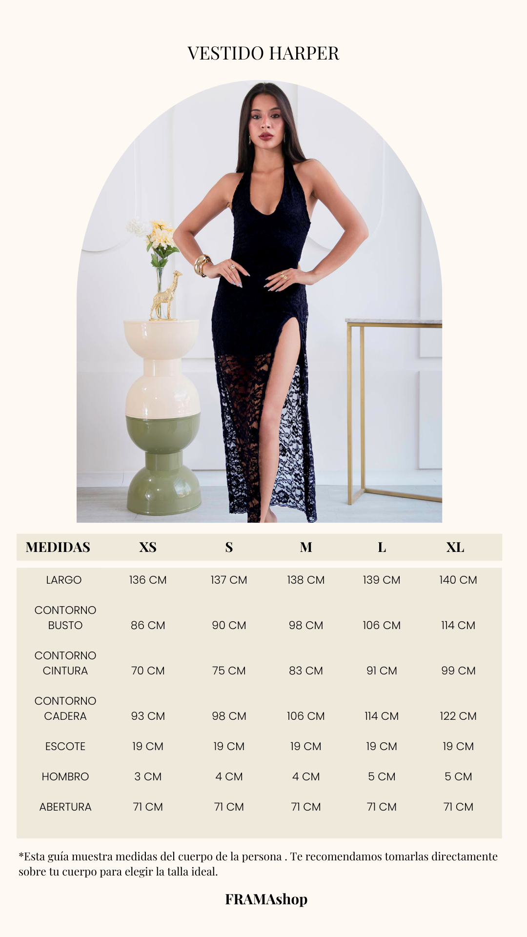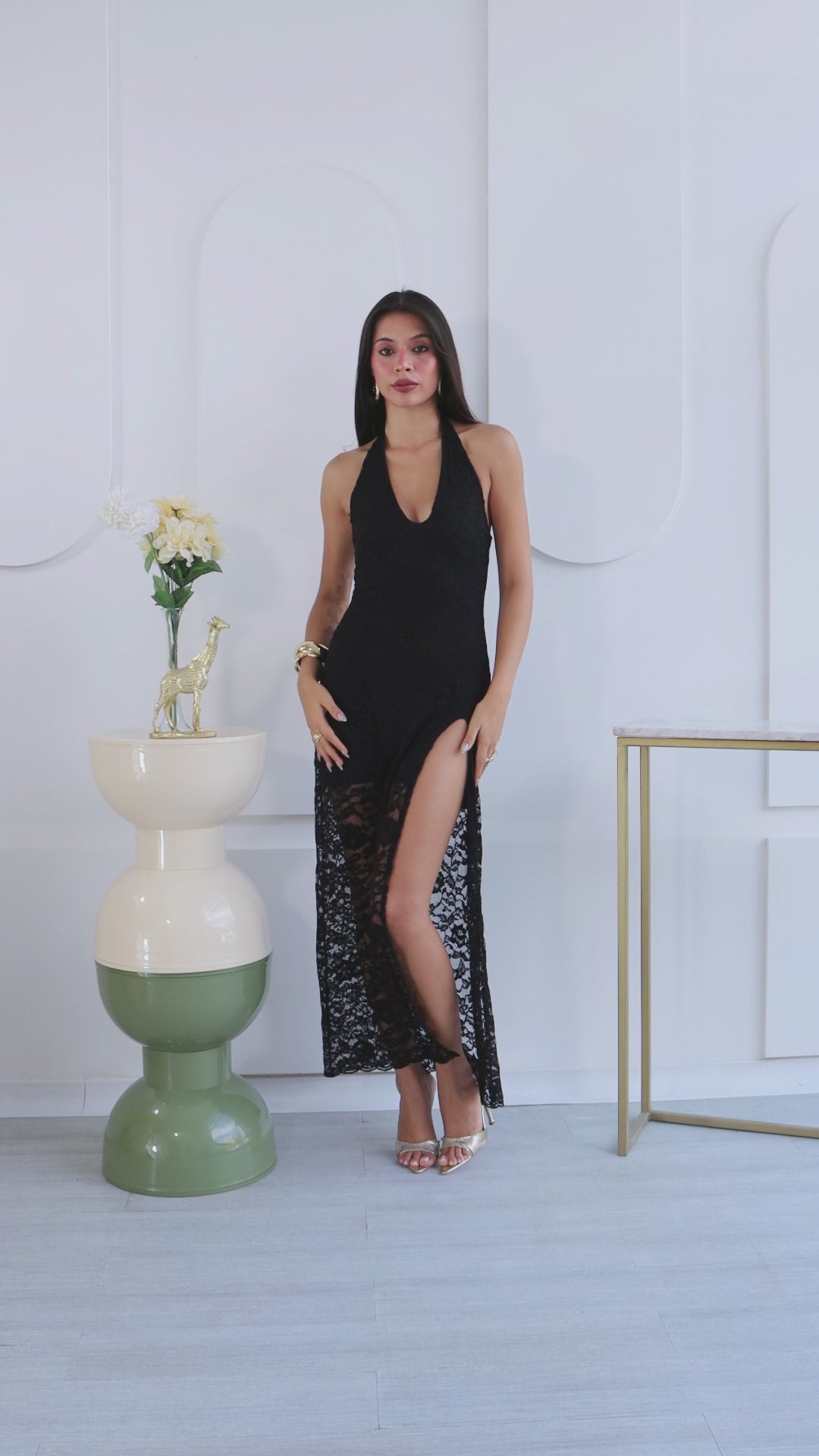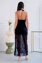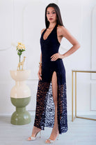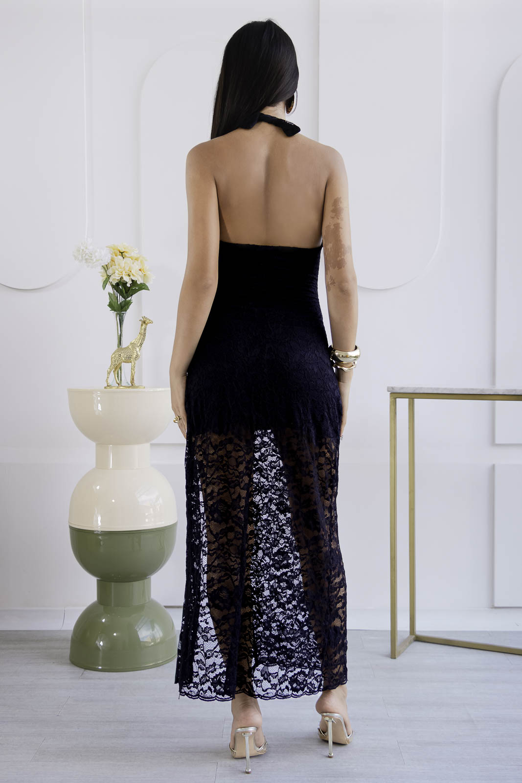 Confeccionado en encaje, este diseño destaca por sus finos detalles que aportan textura y romanticismo a la prenda. El escote halter estiliza la parte superior del cuerpo, mientras que la silueta fluida y la abertura lateral añaden movimiento y un toque sutilmente sensual, logrando un equilibrio perfecto entre delicadeza y sofisticación.