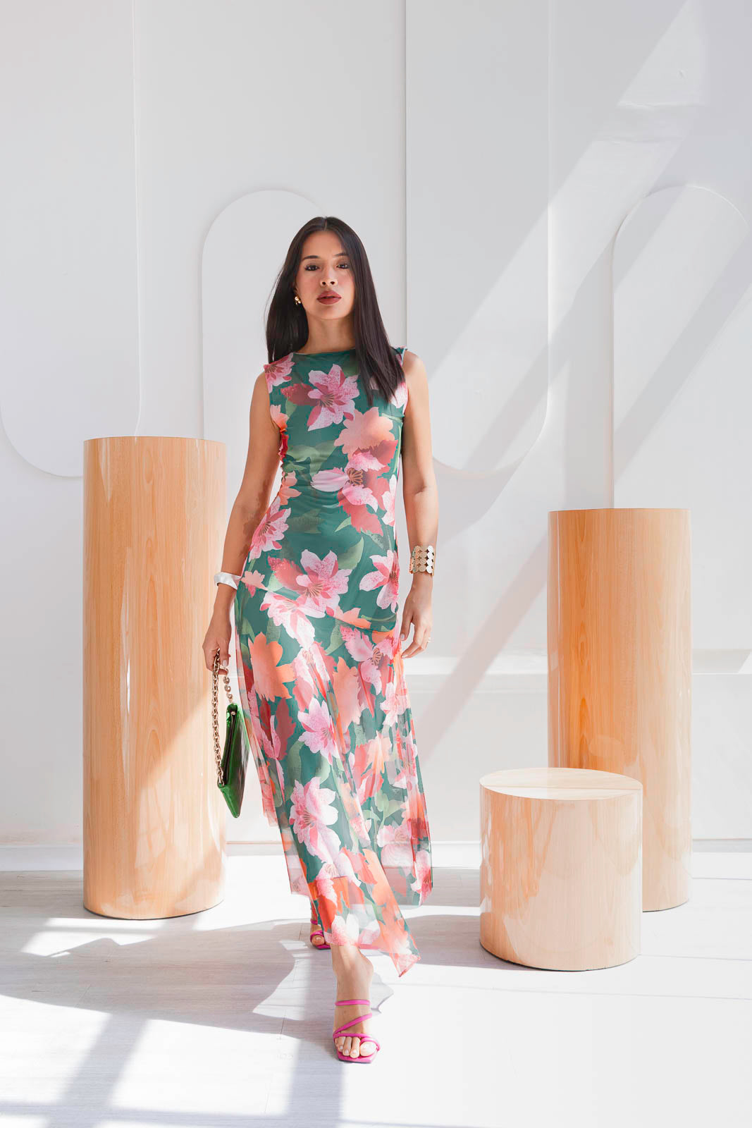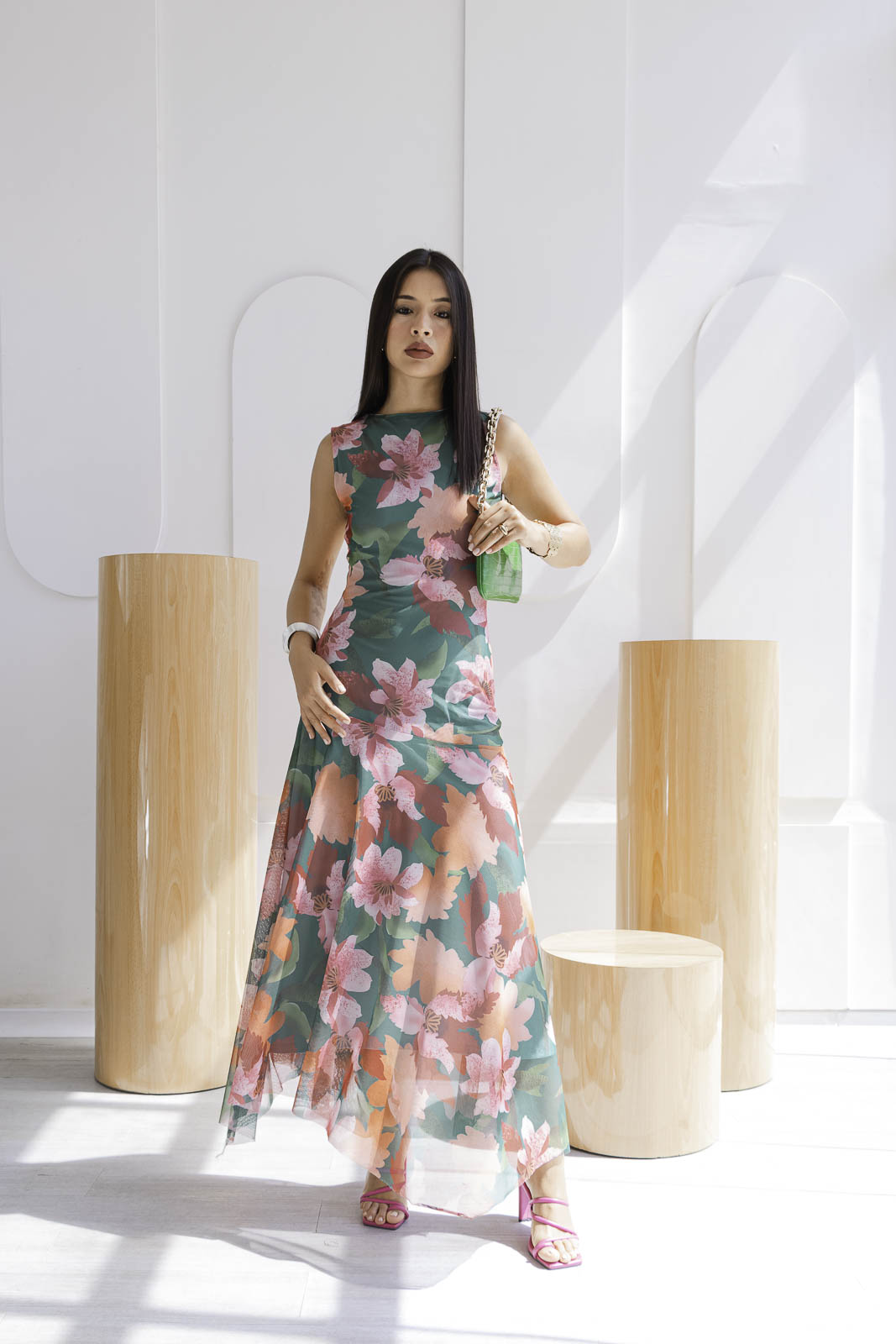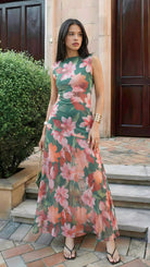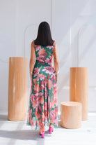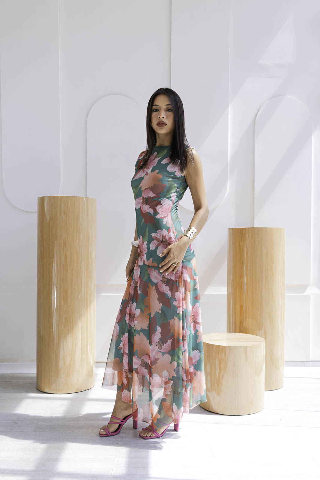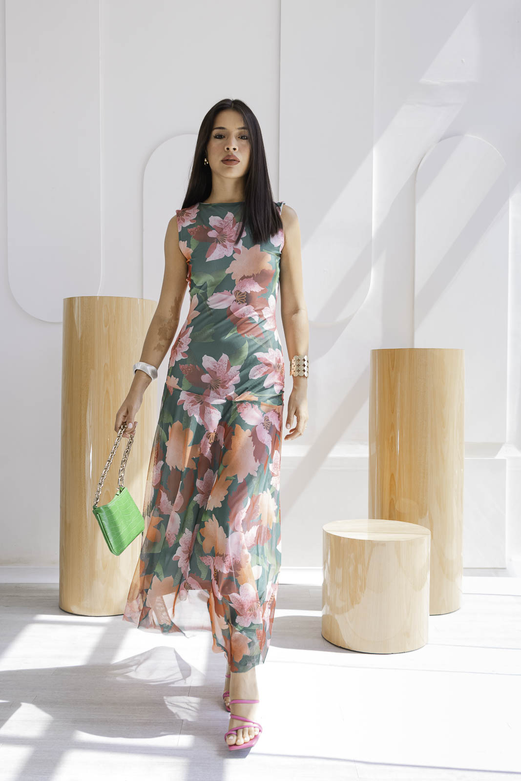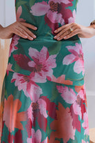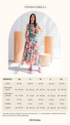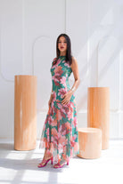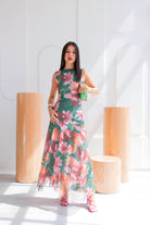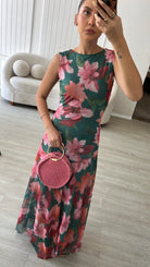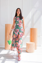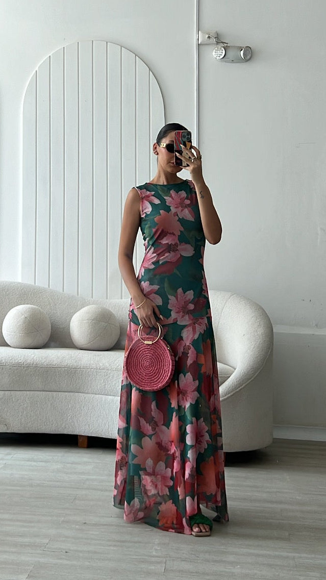 El estampado floral combina tonos verdes intensos, rosados suaves y acentos coral una paleta vibrante pero equilibrada que ilumina la piel. De silueta fluida y caída ligera, el diseño sin mangas estiliza el torso, mientras que la falda con transparencias sutiles añade un toque romántico.