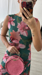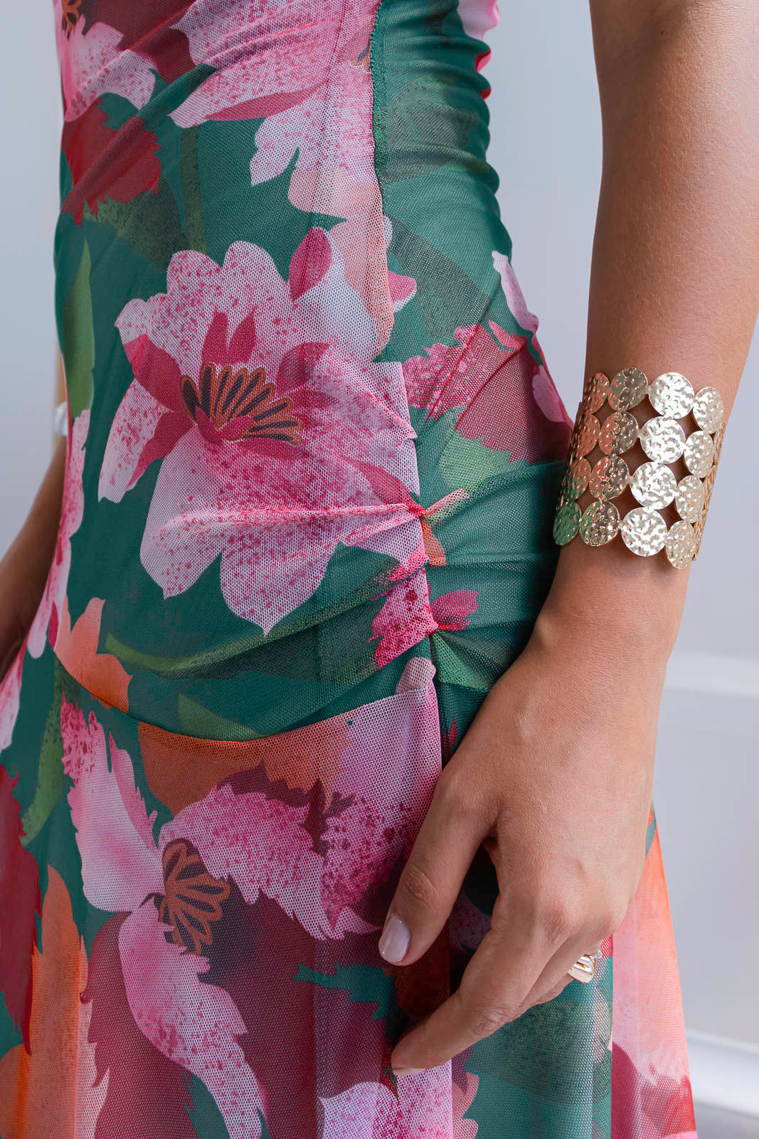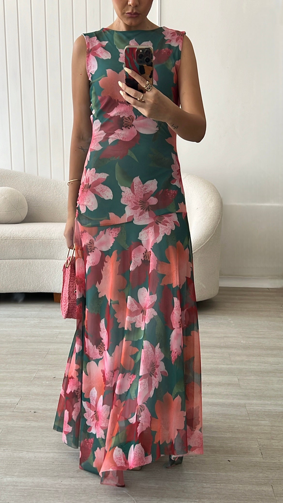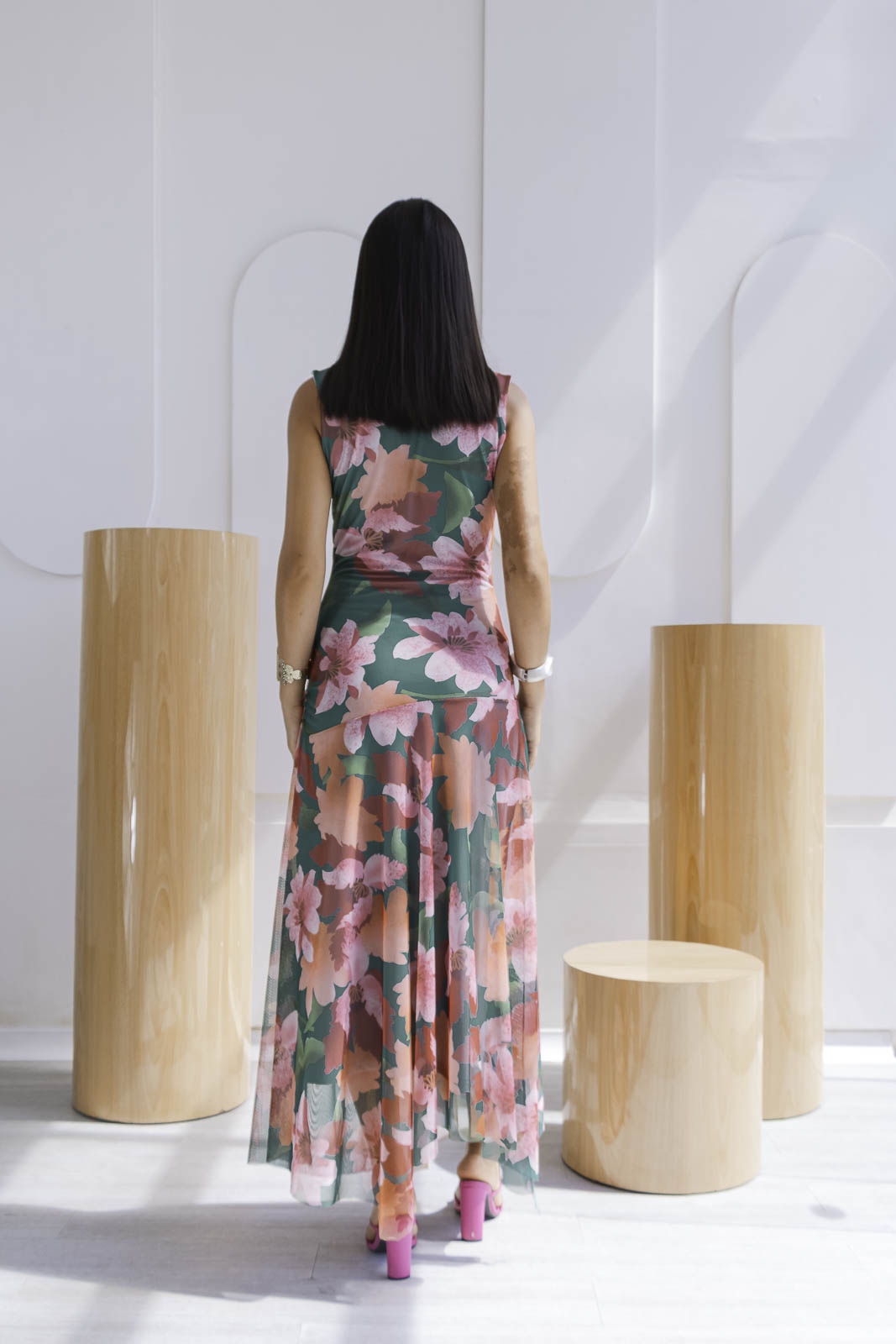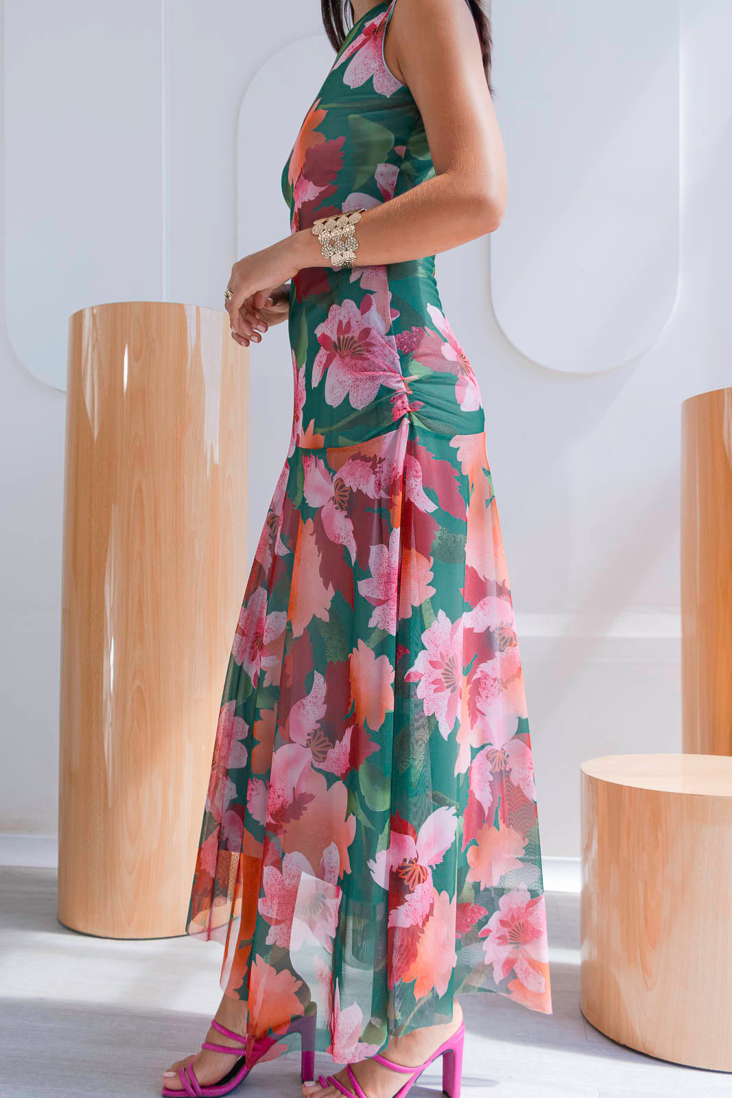 El estampado floral combina tonos verdes intensos, rosados suaves y acentos coral una paleta vibrante pero equilibrada que ilumina la piel. De silueta fluida y caída ligera, el diseño sin mangas estiliza el torso, mientras que la falda con transparencias sutiles añade un toque romántico.