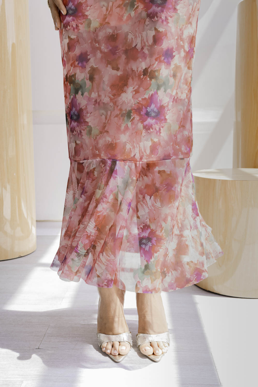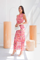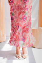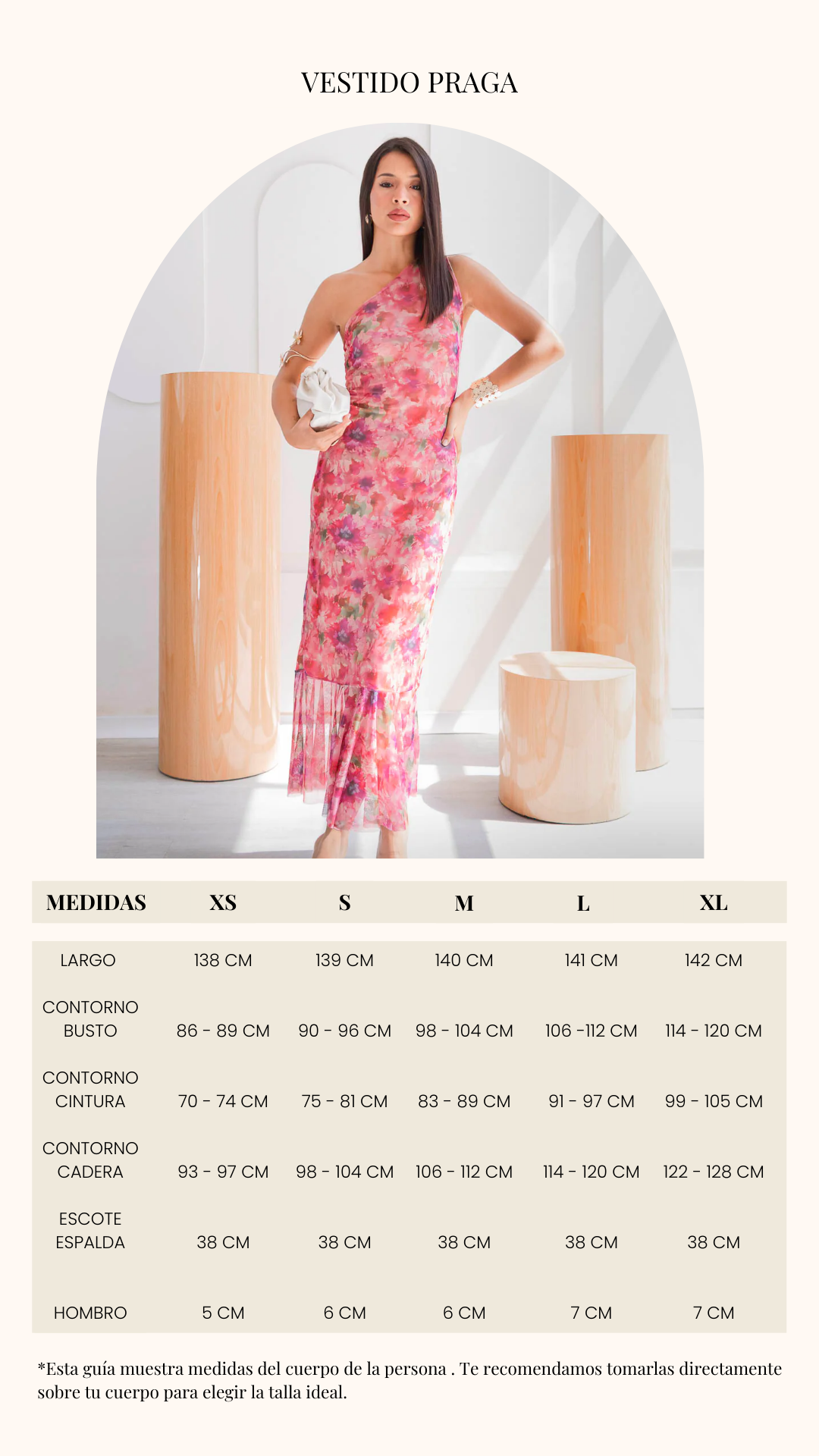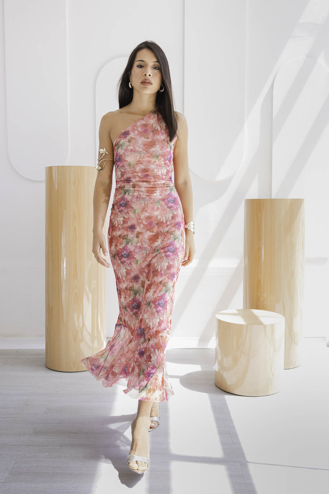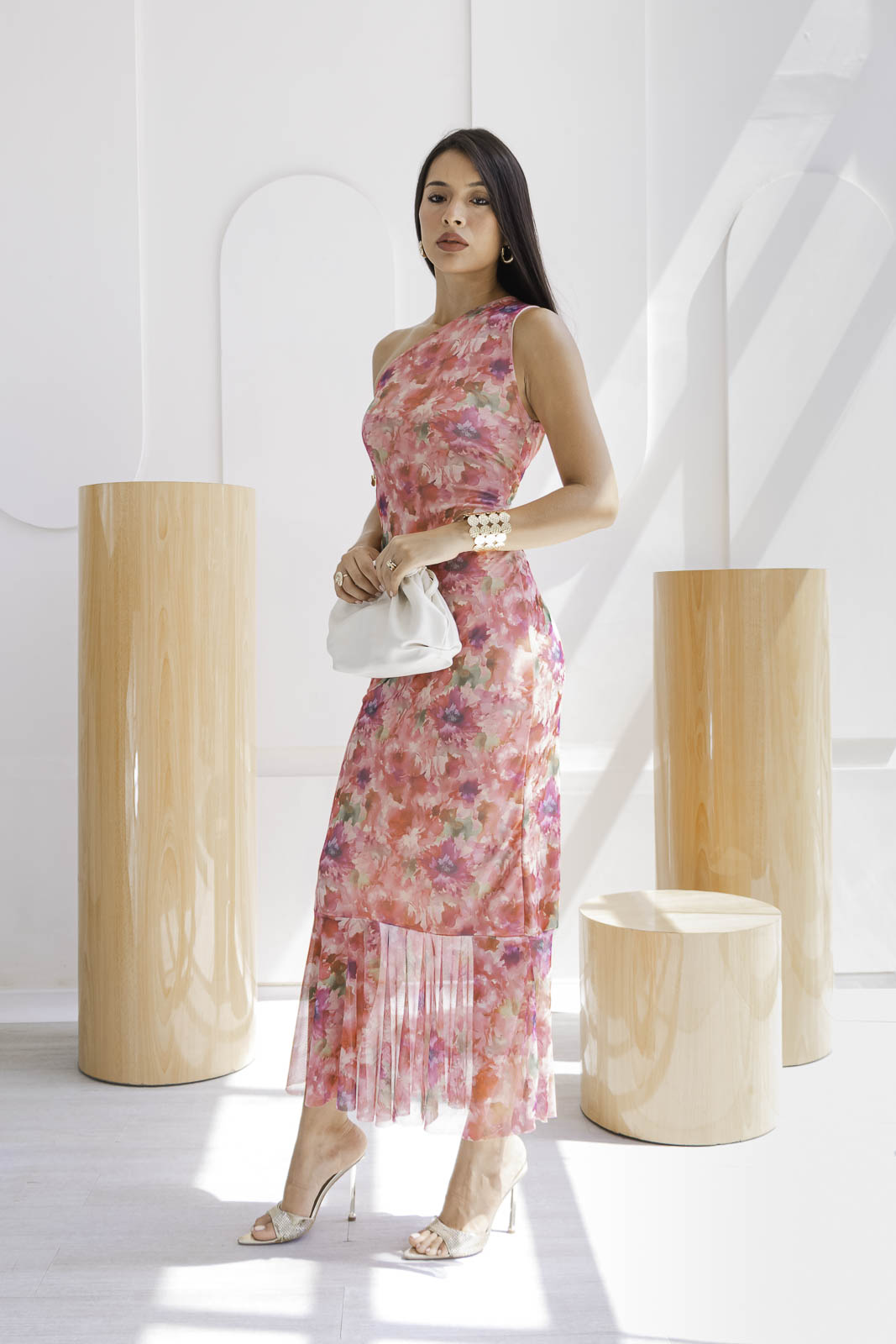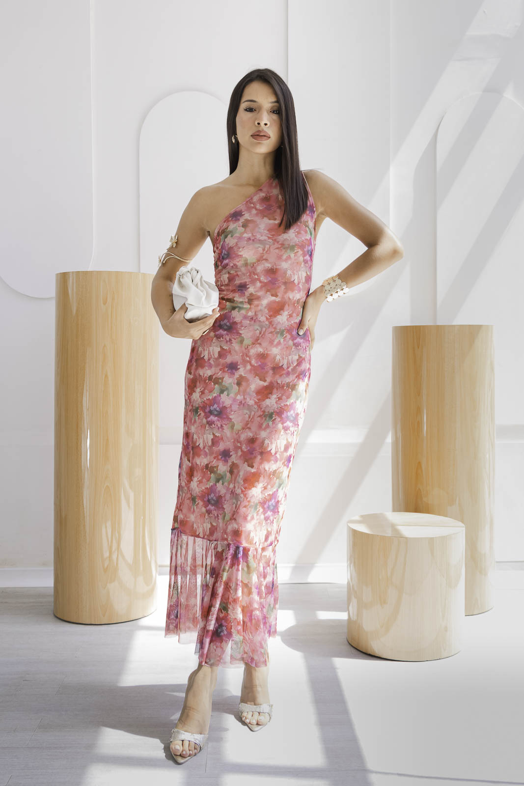 El estampado floral en tonos rosados, coral y suaves matices verdosos, su diseño largo, de silueta entallada y escote asimétrico, resalta la figura femenina con elegancia y carácter. El detalle de la caída en el bajo aporta movimiento y fluidez, convirtiéndo en una opción ideal para celebraciones o cenas especiales.