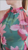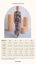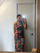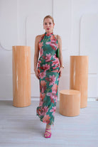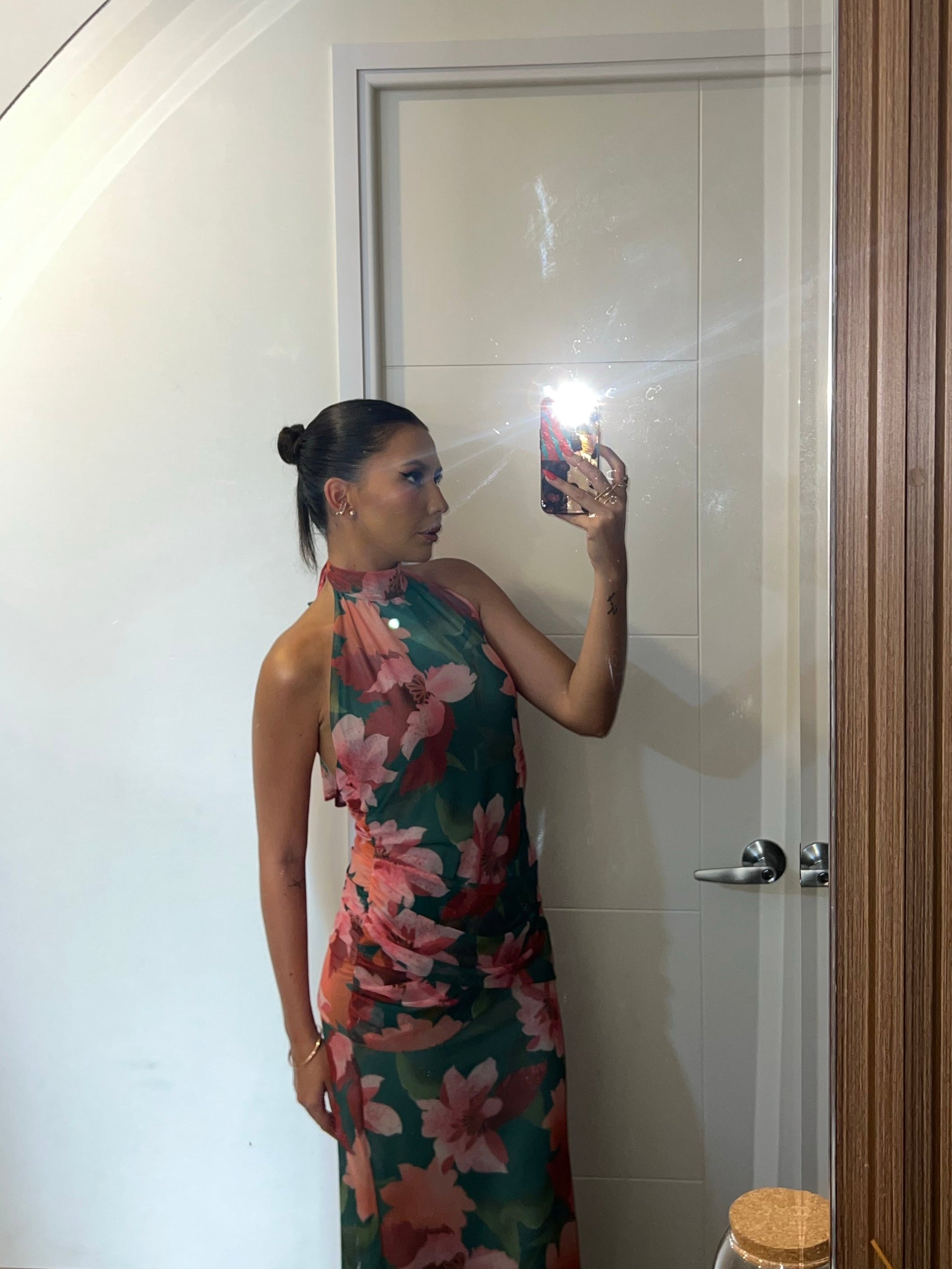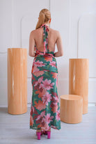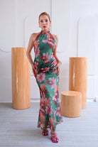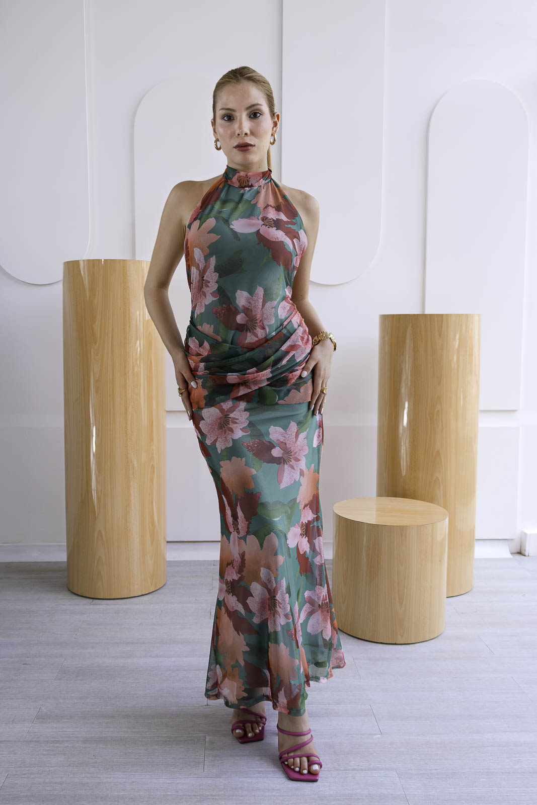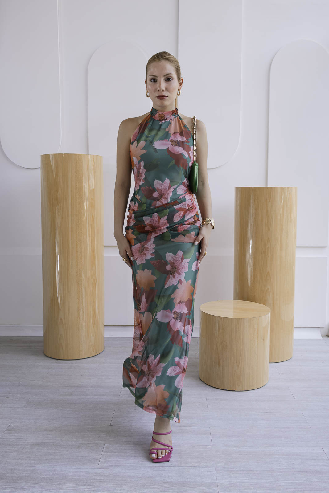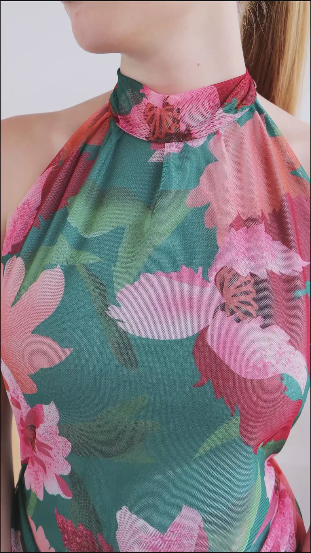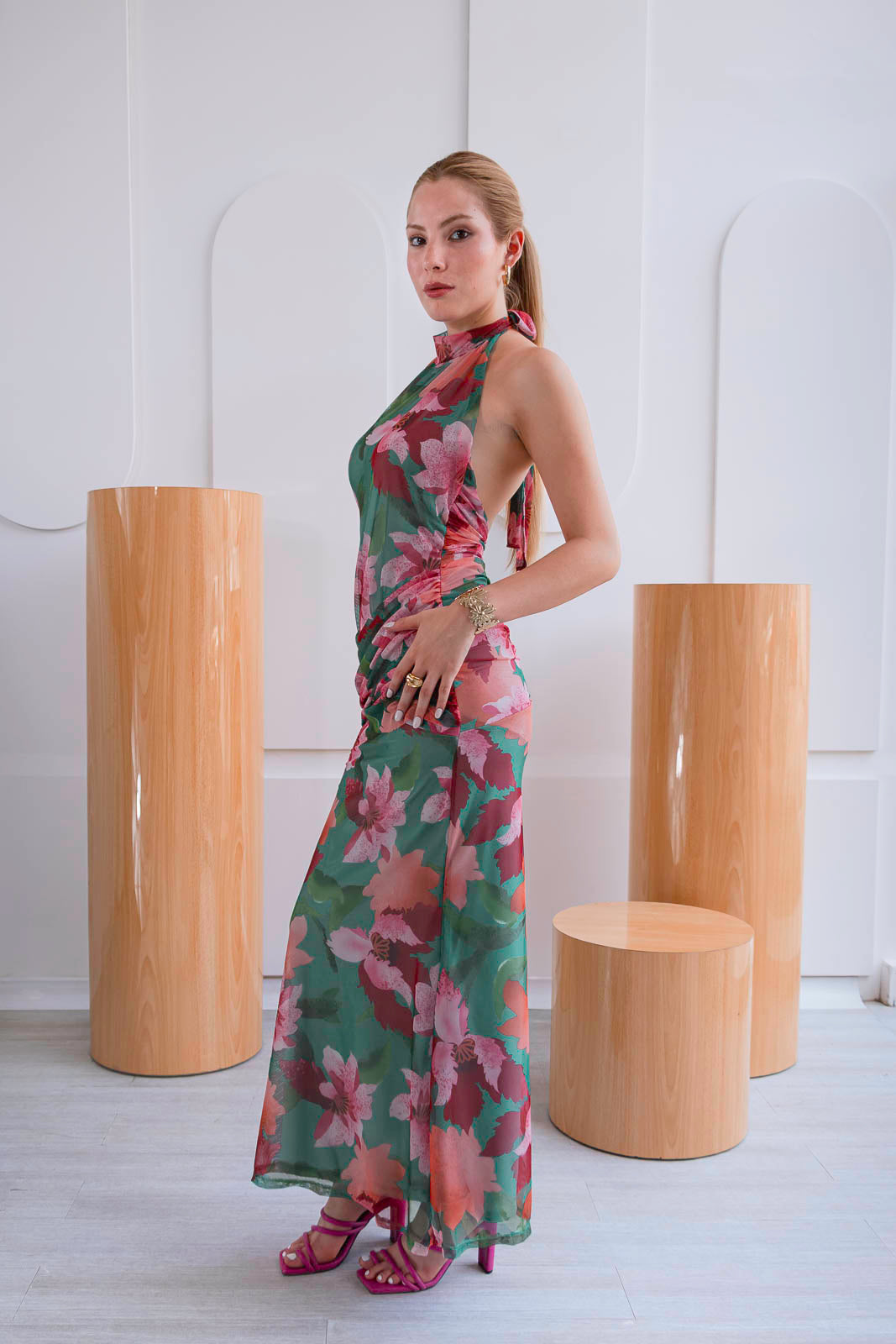 Estampado floral en tonos verde esmeralda, rosa empolvado y acentos terracota. El diseño destaca por su escote halter, que enmarca los hombros y alarga visualmente el cuello, aportando un aire femenino y elegante.