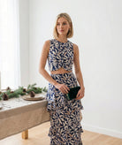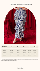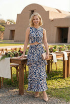 Un conjunto que enamora a primera vista. Set 2 de piezas, print botánico en tonos azul profundo y blanco, transmite frescura sin perder elegancia, crea un contraste sofisticado y elegante. El top sin mangas + falda larga con detalle de pliegues de caída amplia y movimiento.