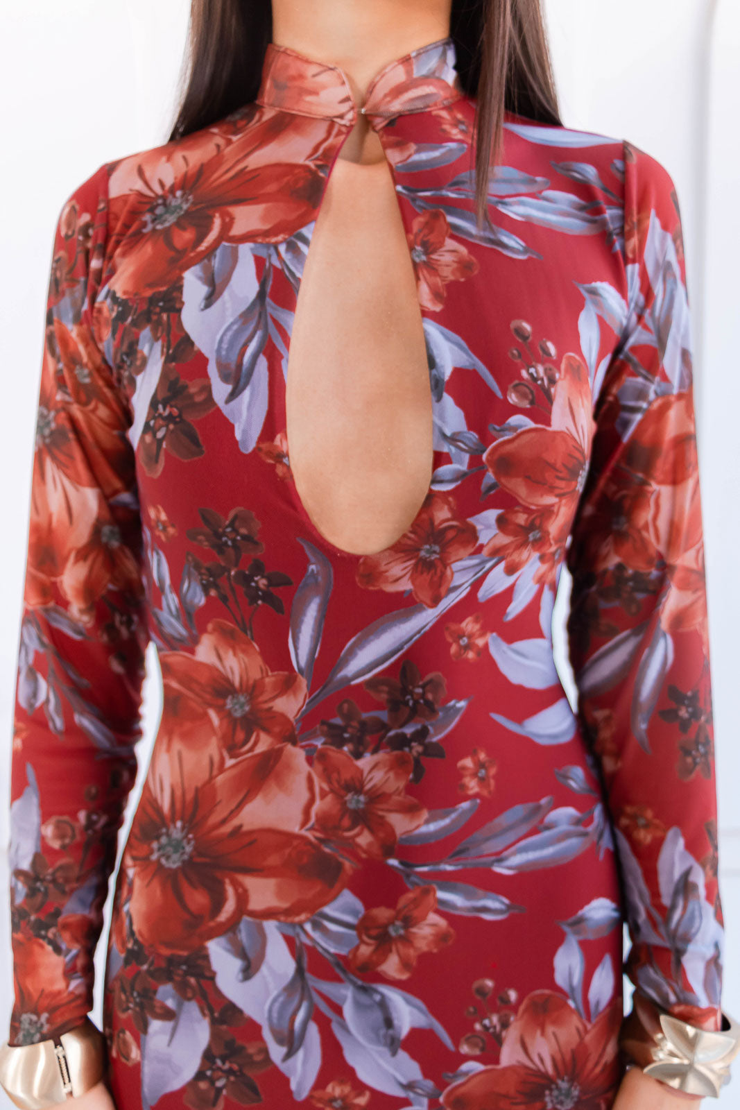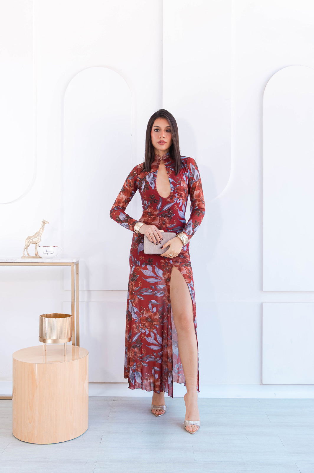 El diseño de este vestido largo ceñido al cuerpo hasta el muslo, mangas largas, escote keyhole, cuello alto con un broche y abertura en la pierna; te encantará.