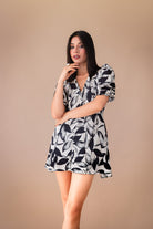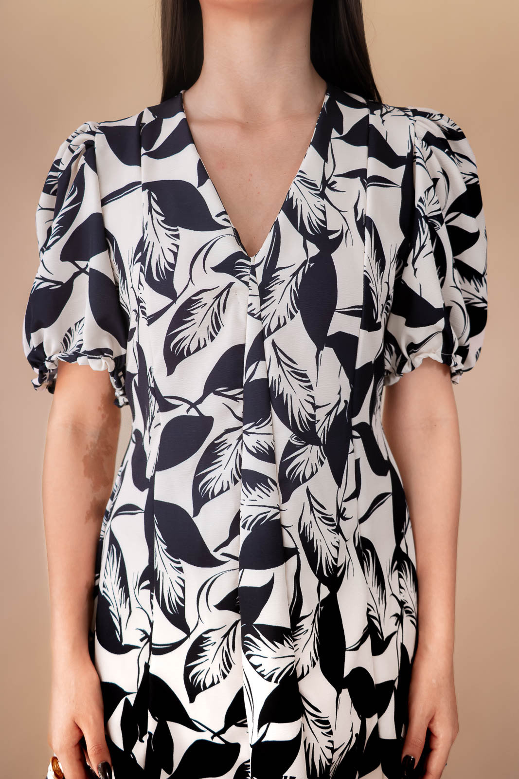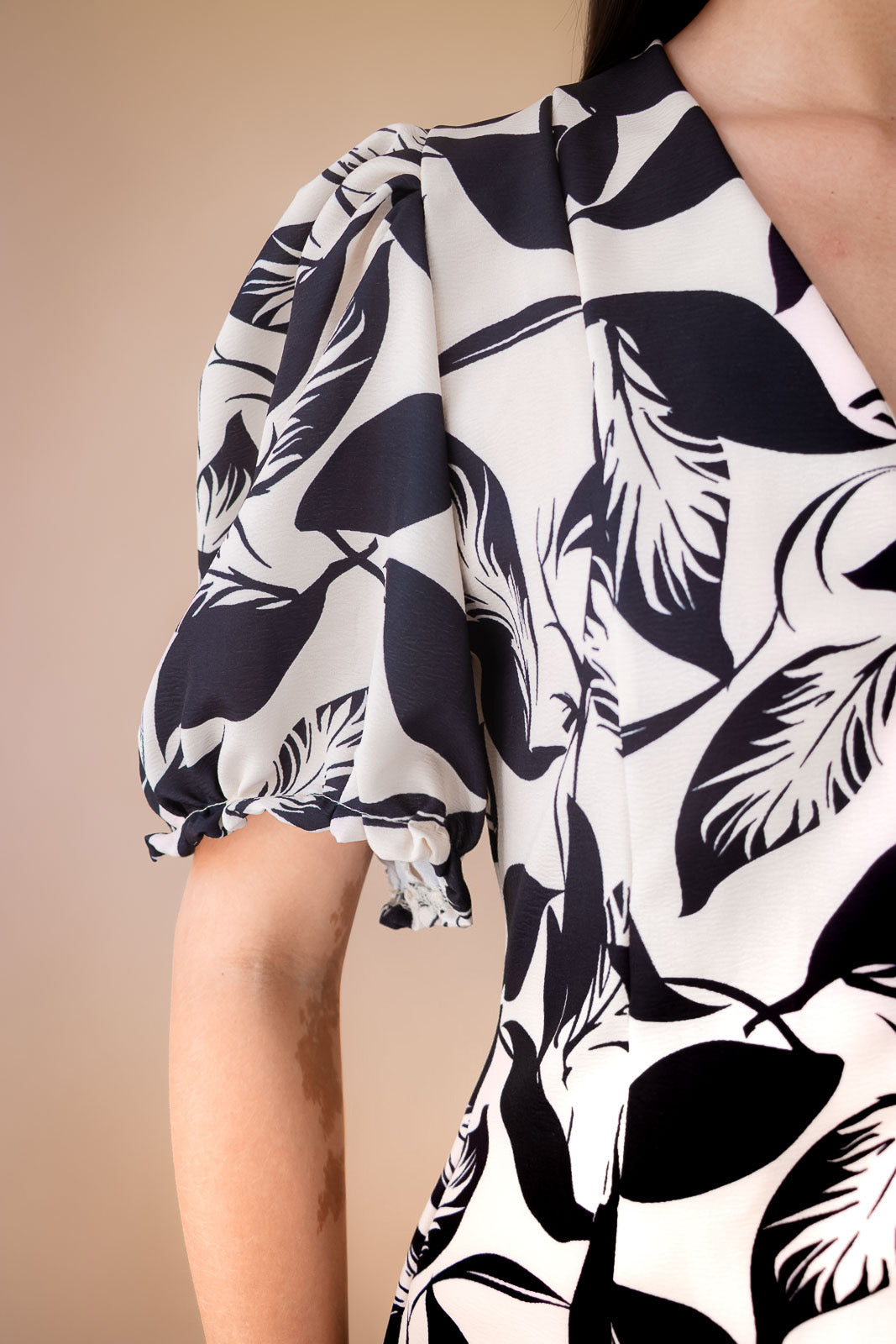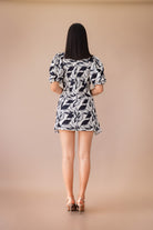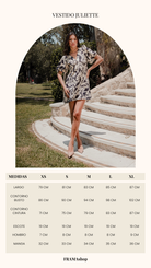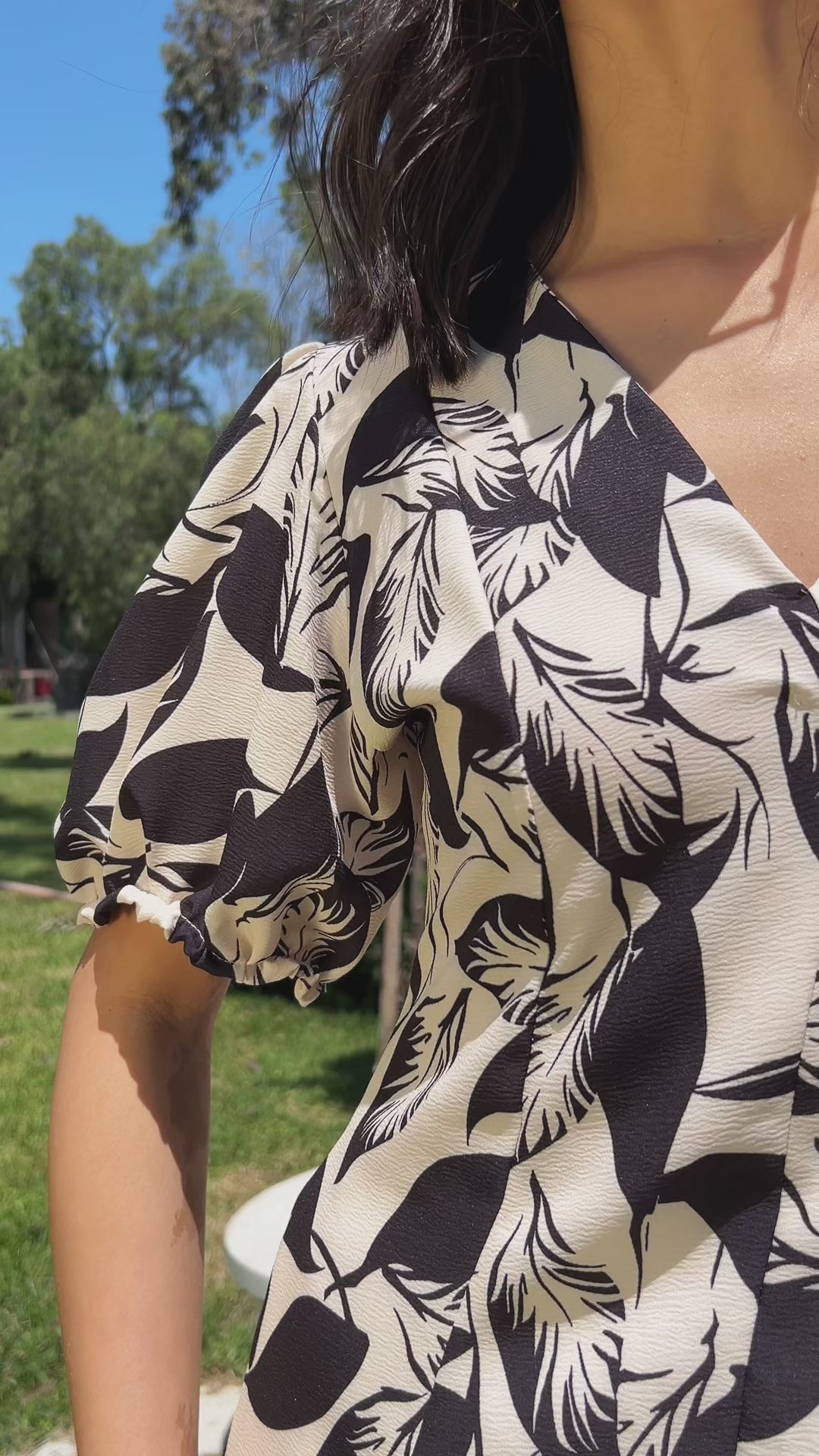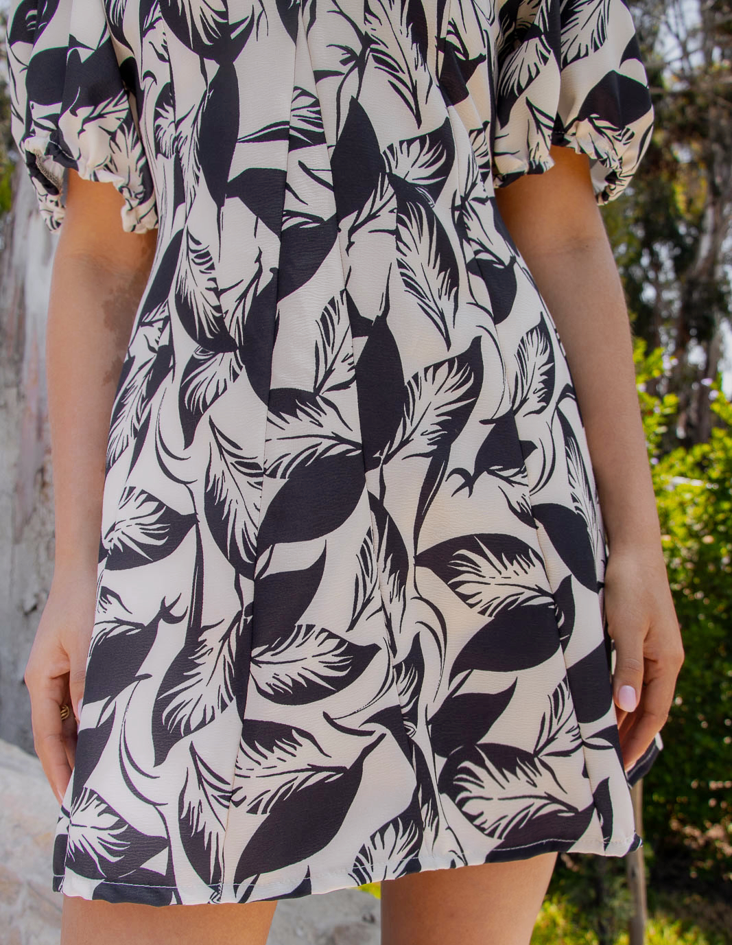 Juliette: vestido corto de estampado botánico en tonos neutros y contrastes sutiles , creando un efecto sofisticado con elegancia. Su diseño con mangas abullonadas y escote en V le aporta un toque romántico y femenino, ideal para realzar la silueta con sutileza.