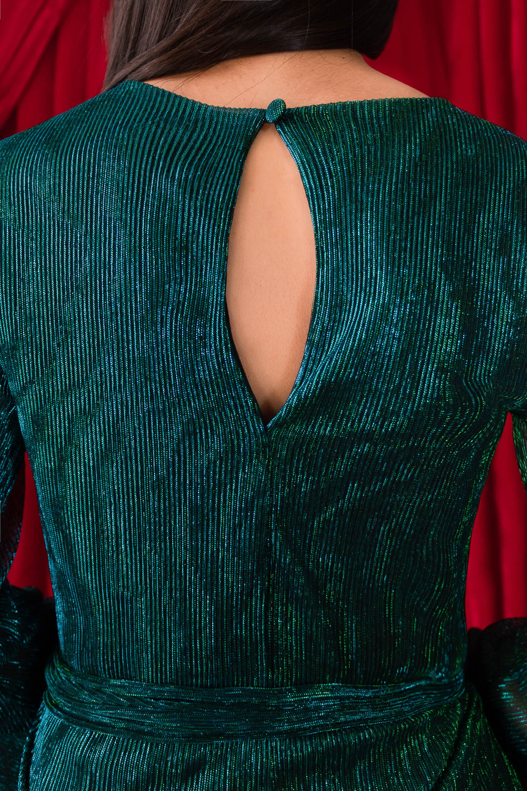 Diseño elegante de tono tornasol ilumina la temporada que recuerda al brillo de las noches festivas de fin de año con un corte en línea A que estiliza la figura y aporta movimiento con detalle de abertura en forma de gota en la parte de la espalda. Este diseño realza la cintura gracias a su cinturón del mismo material.