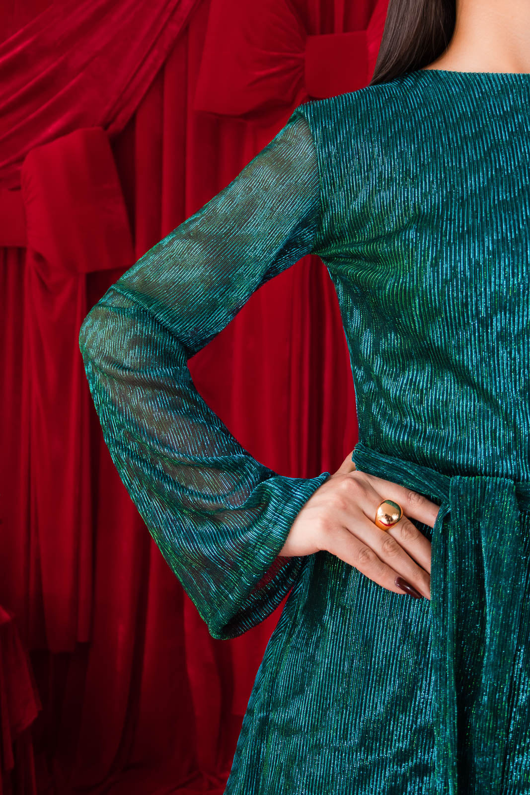 El color lo convierte en una elección ideal para cenas especiales, fiestas navideñas, celebraciones de Año Nuevo y las mangas largas con caída ligera le otorgan un toque femenino.