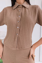 Detalle de botones frontales que añaden un toque femenino y delicado.