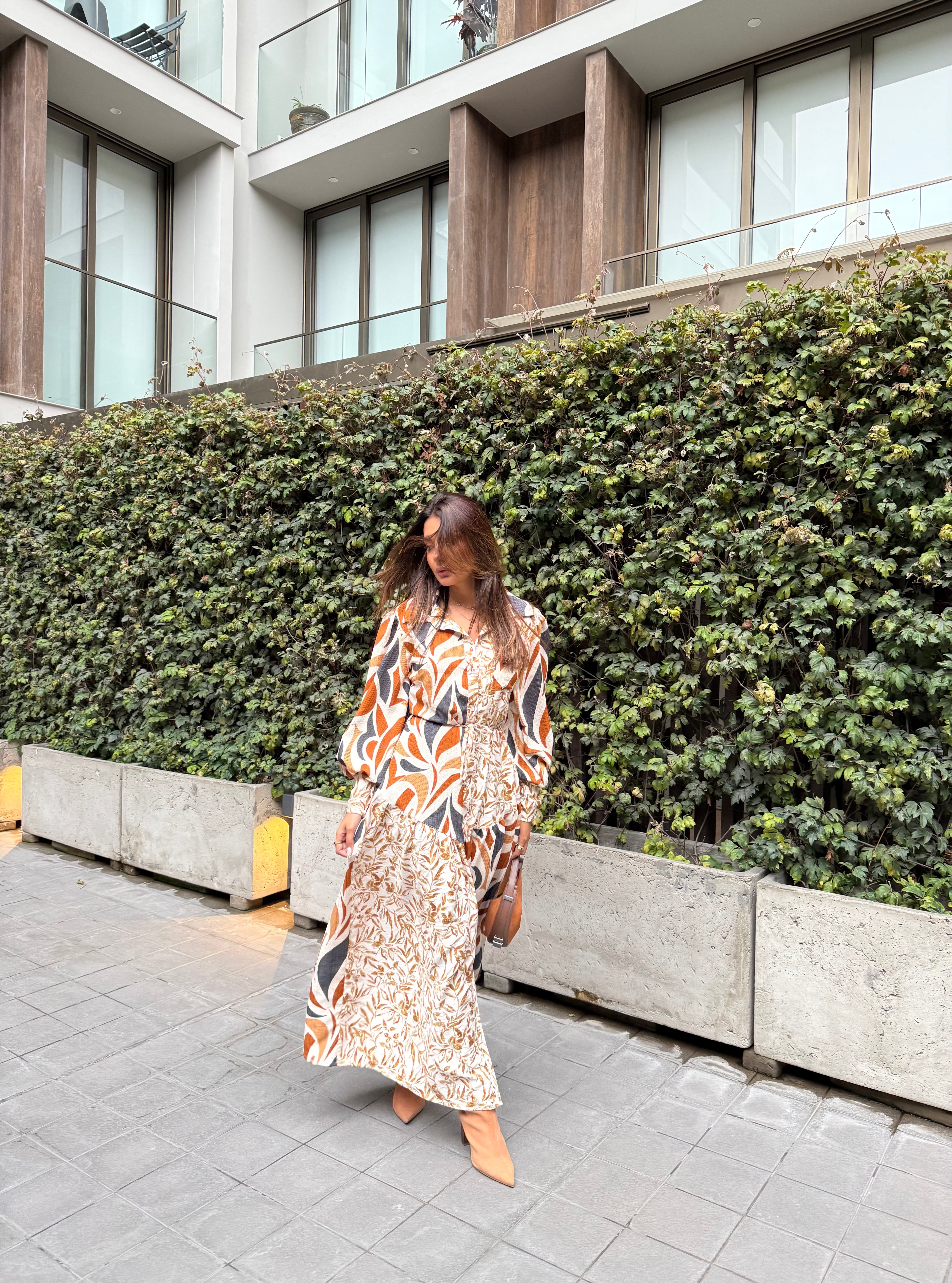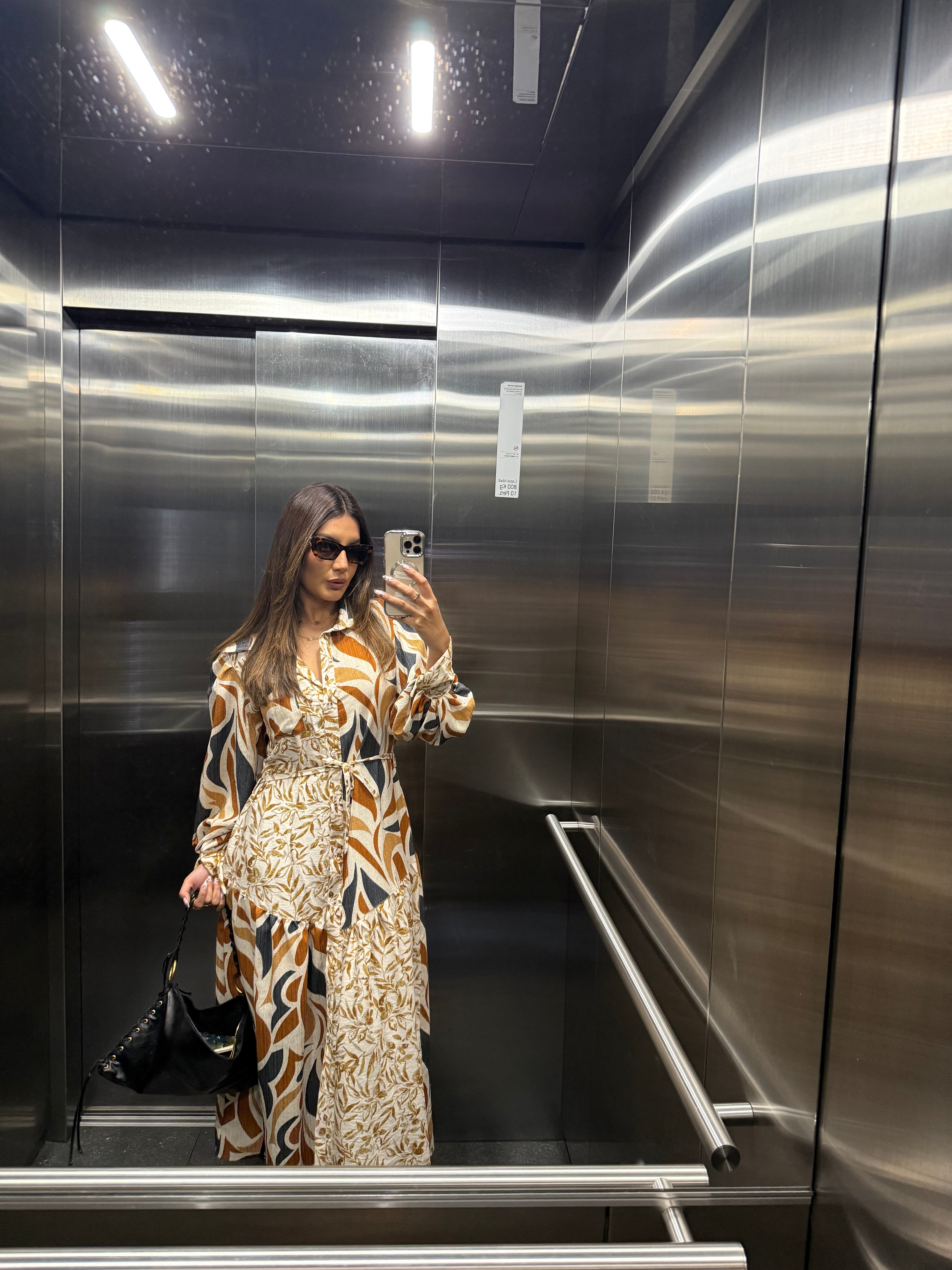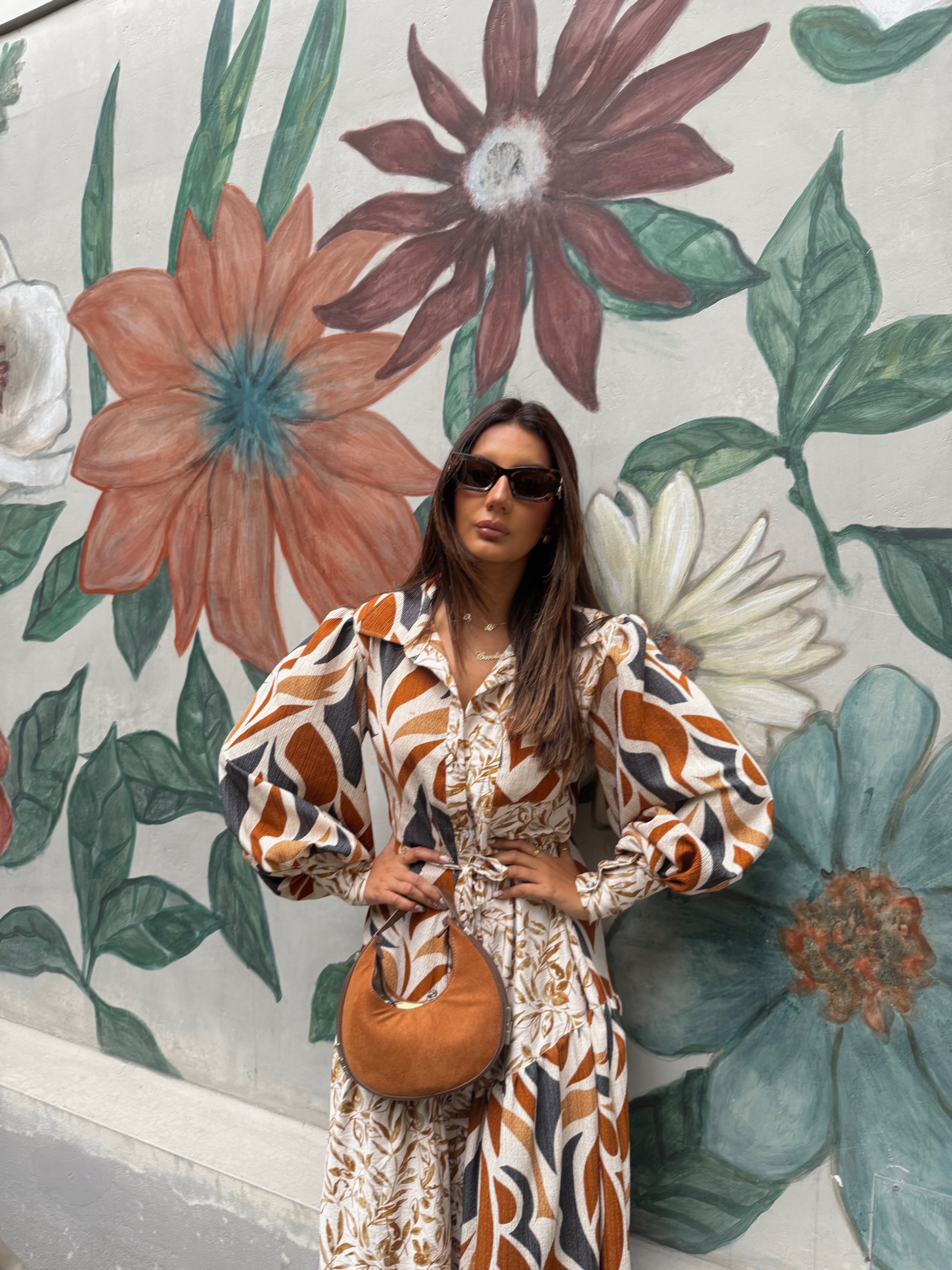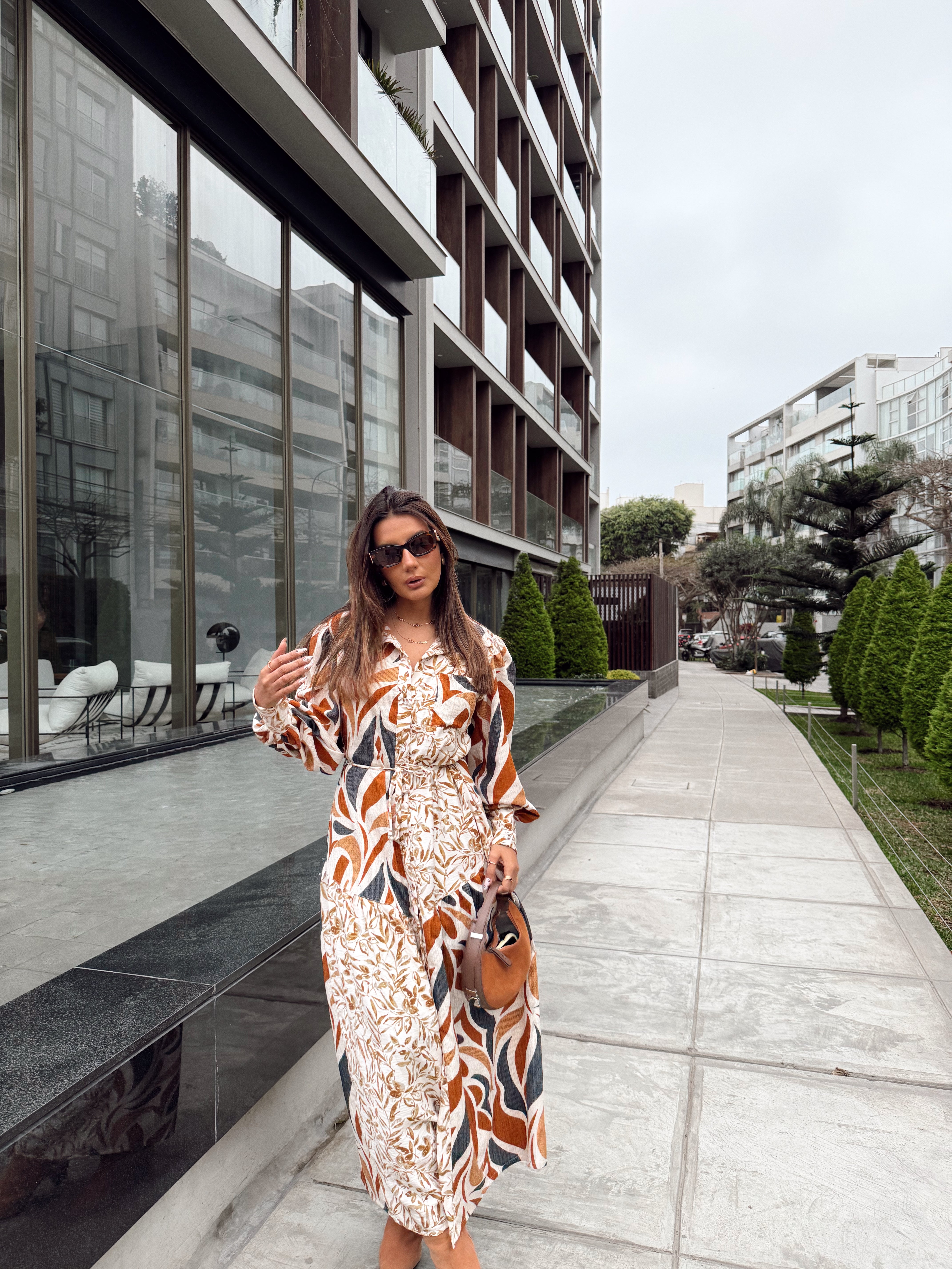 El vestido Artemisa combina elegancia y naturalidad en un diseño bohemio que destaca por su estampado en tonos tierra, beige y gris, creando un contraste armonioso y sofisticado. Su corte largo y fluido estiliza la figura, mientras que la cintura elasticada realza delicadamente las formas sin perder comodidad.