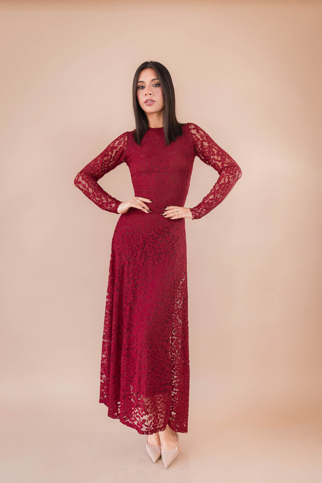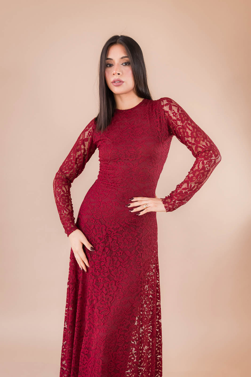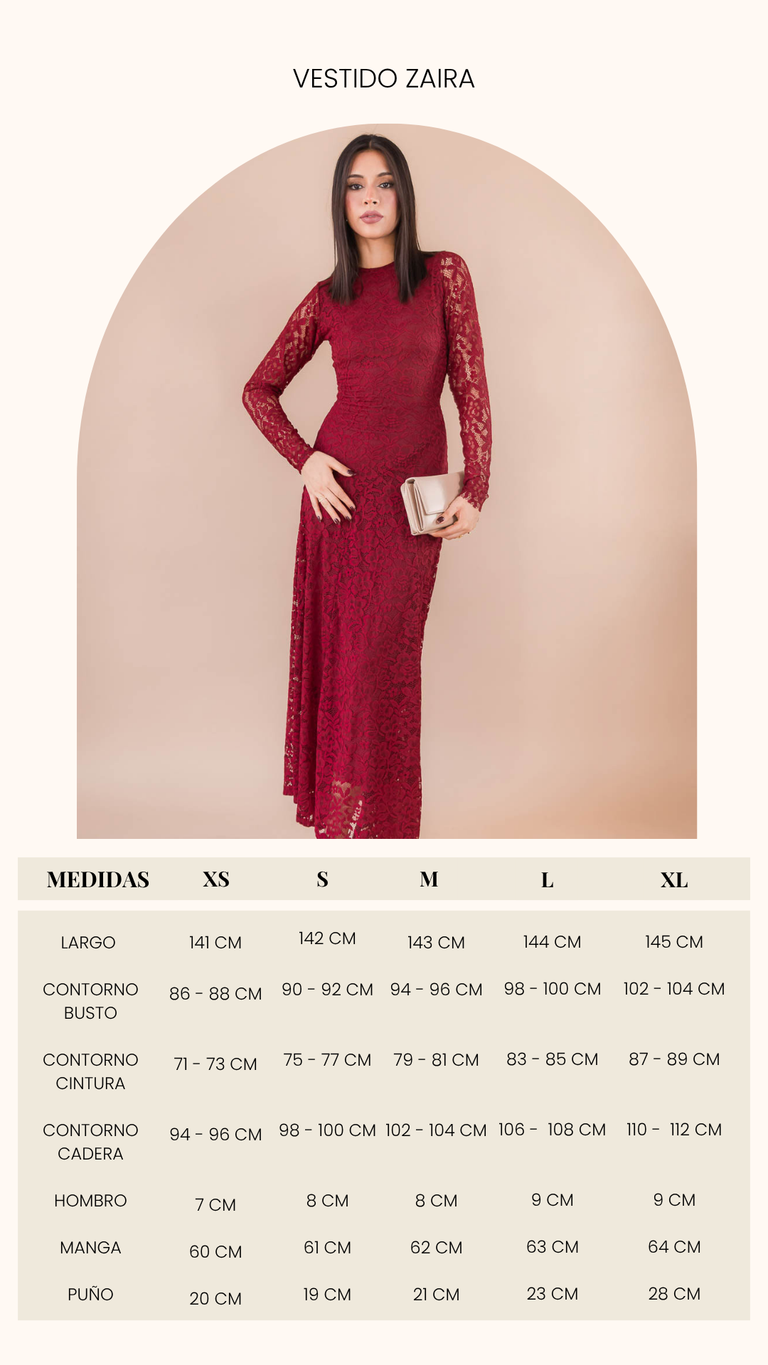 El vestido Zaira fue diseñado como un homenaje a esa historia: un vestido elegante, largo y ceñido al cuerpo, confeccionado en encaje forrado resaltando la feminidad en cada detalle.