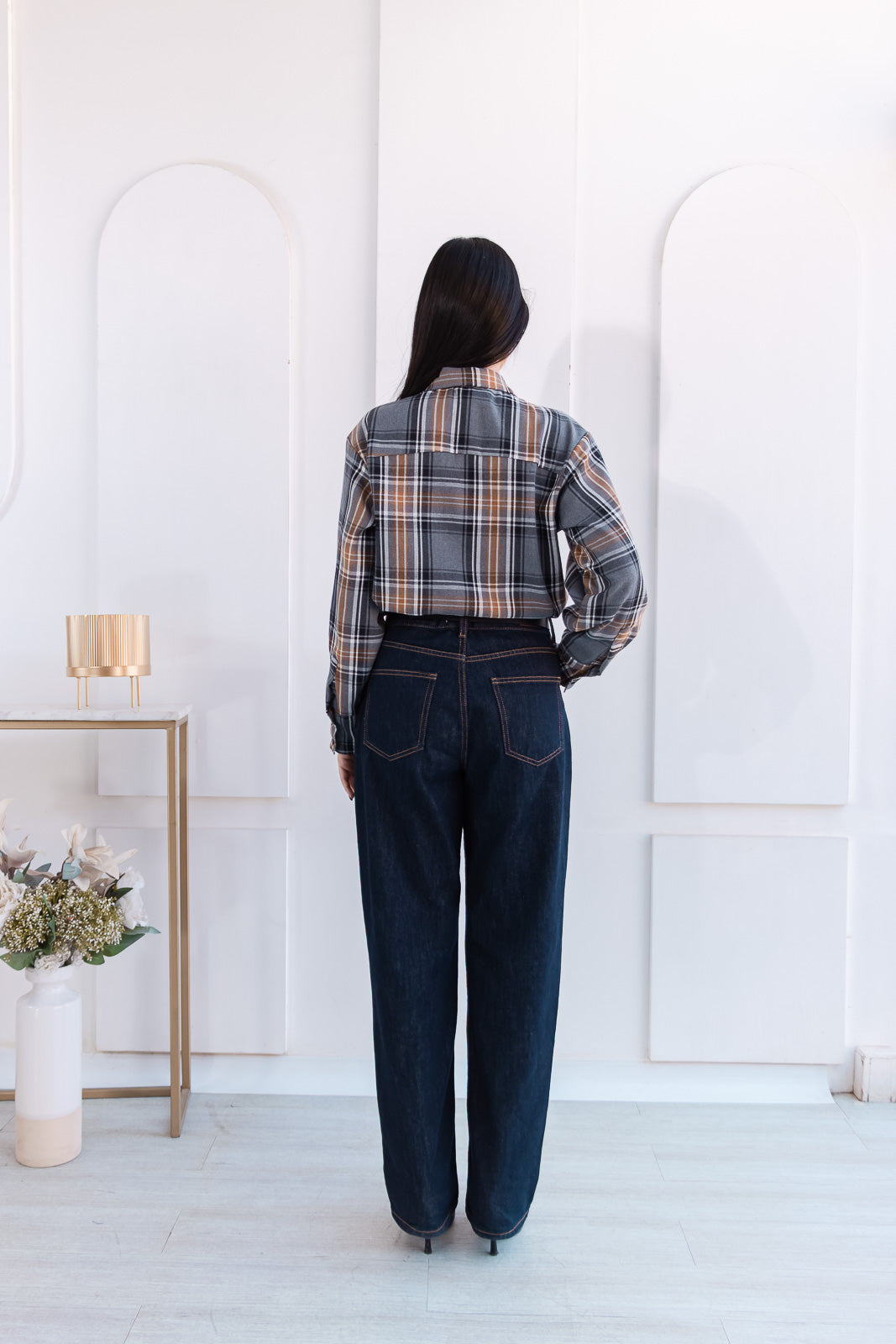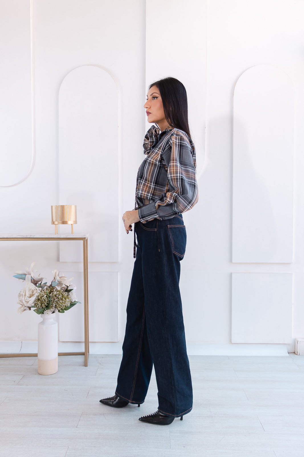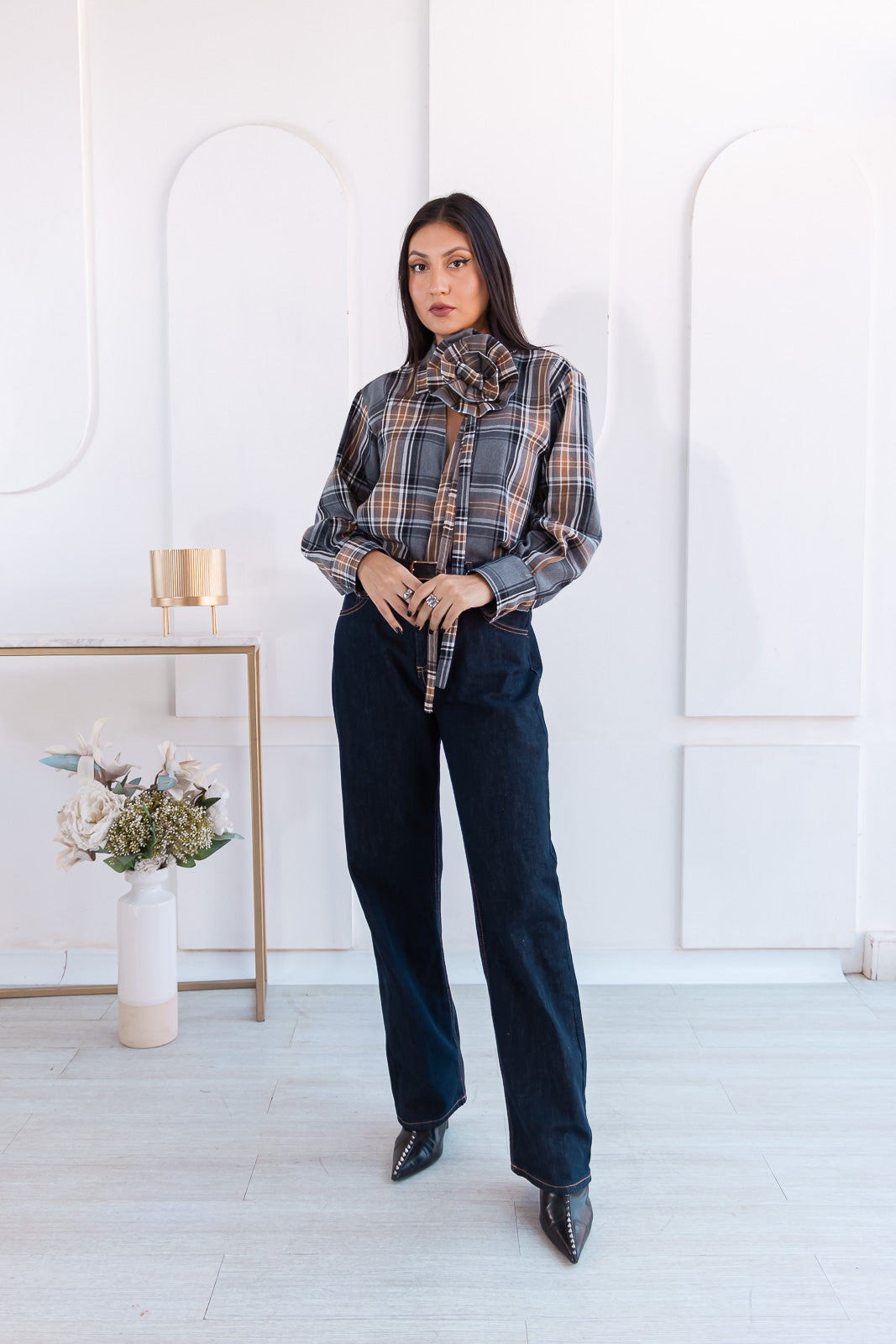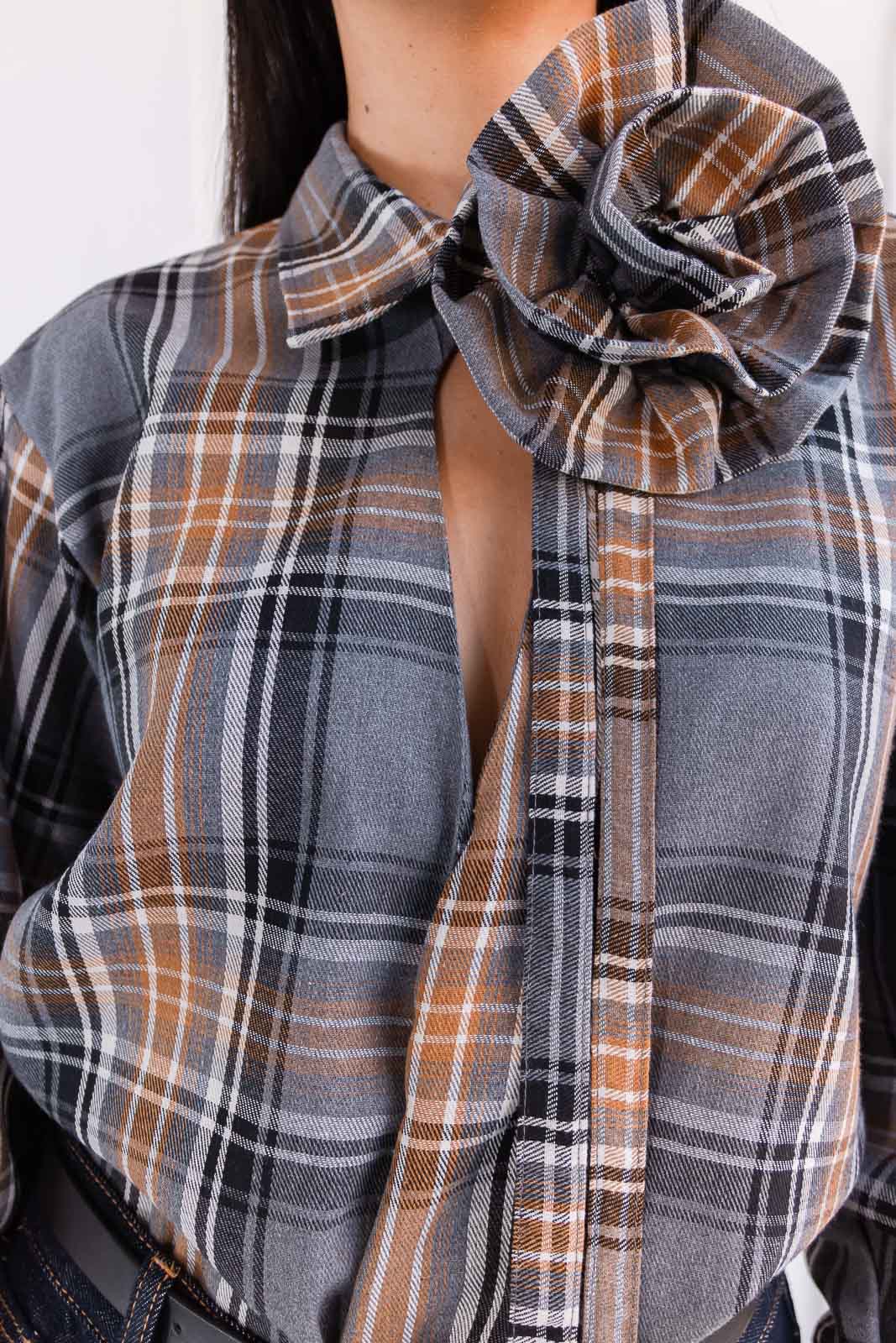 Fleúr es una blusa de cuadros con un twist sofisticado. Confeccionada en tonos tierra, gris y negro, su paleta cálida y versátil  le da ese aire clásico renovado que nunca pasa de moda. El detalle estrella: una flor XL confeccionada en la misma tela que se posa sobre el cuello y le da ese toque femenino, artístico y absolutamente fuera de lo común.