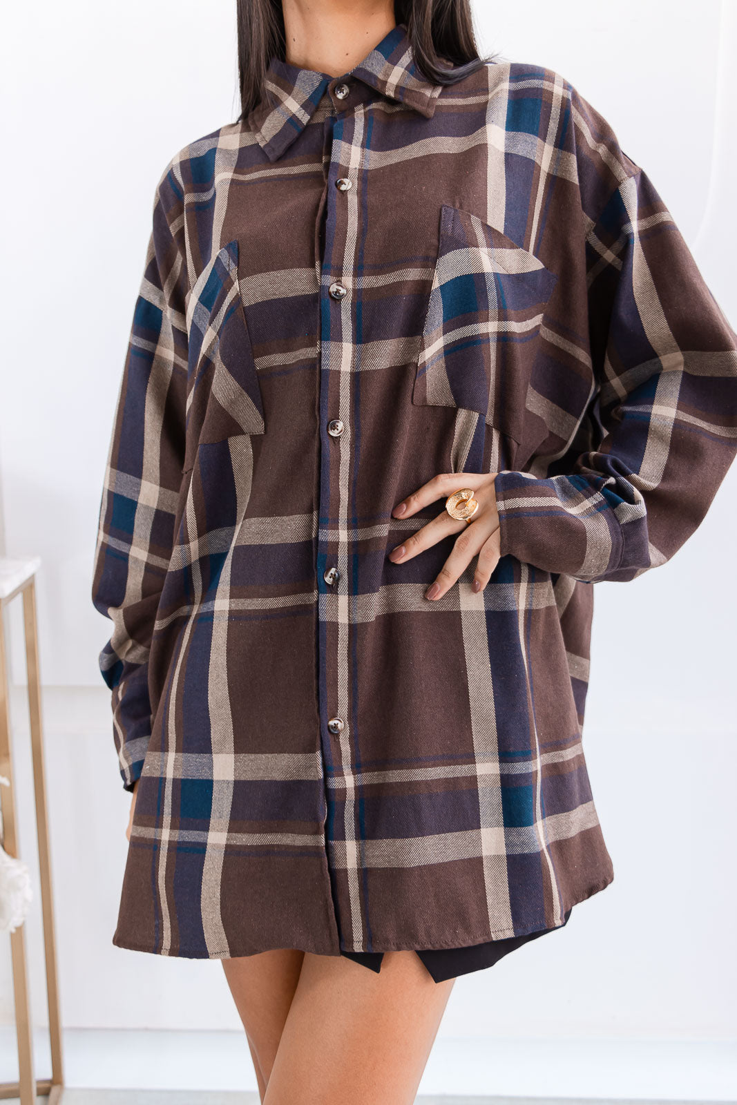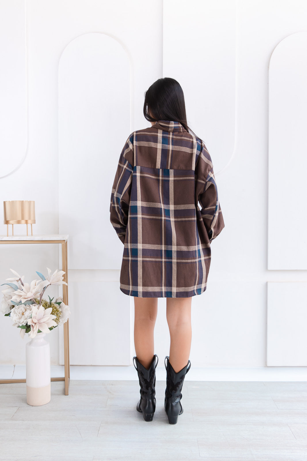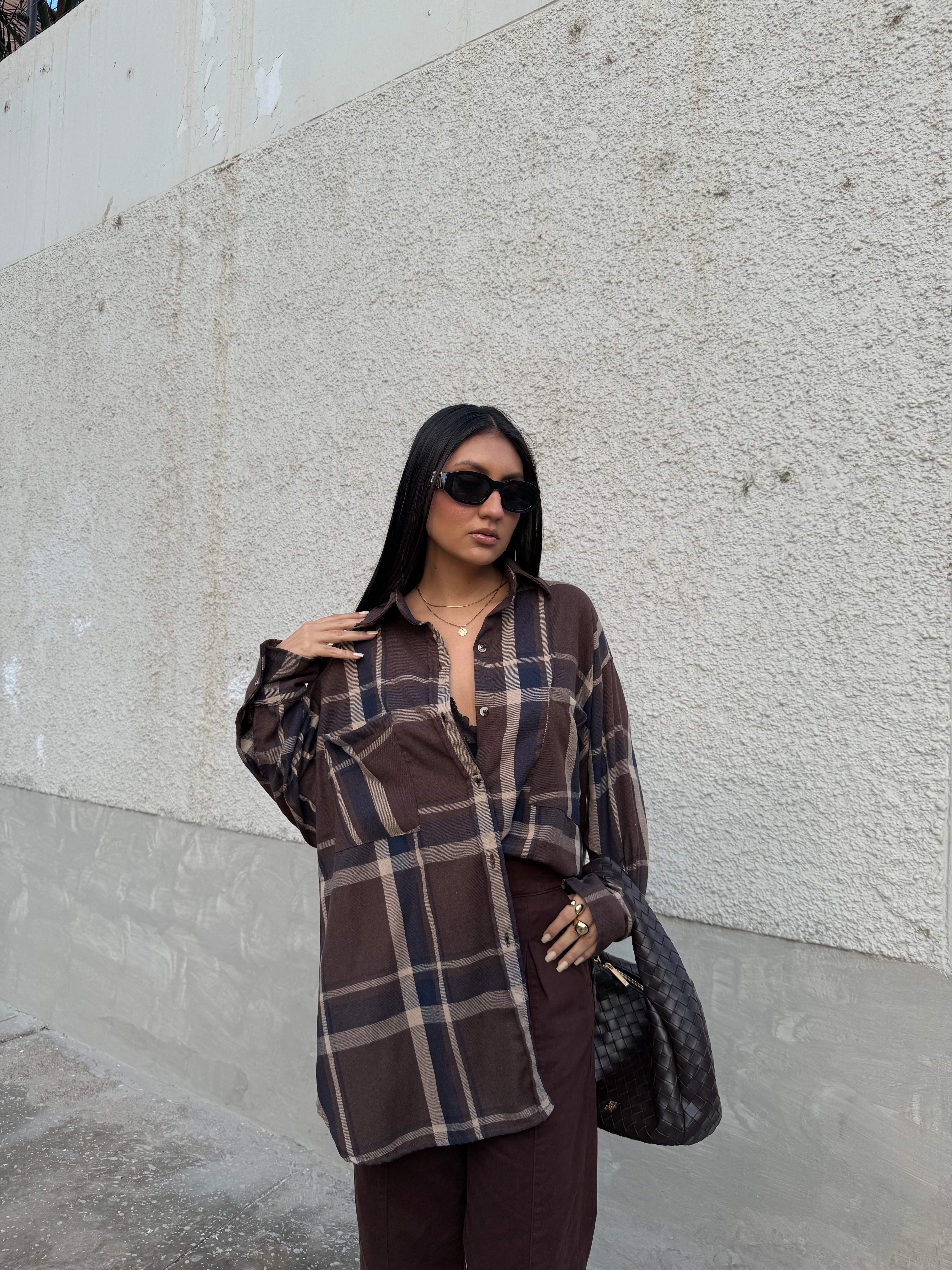 Georgia es esa prenda que transforma cualquier look. Su diseño oversized en estampado tartán marrón con toques cálidos la convierte en una pieza poderosa y versátil que puedes llevar de día o de noche.