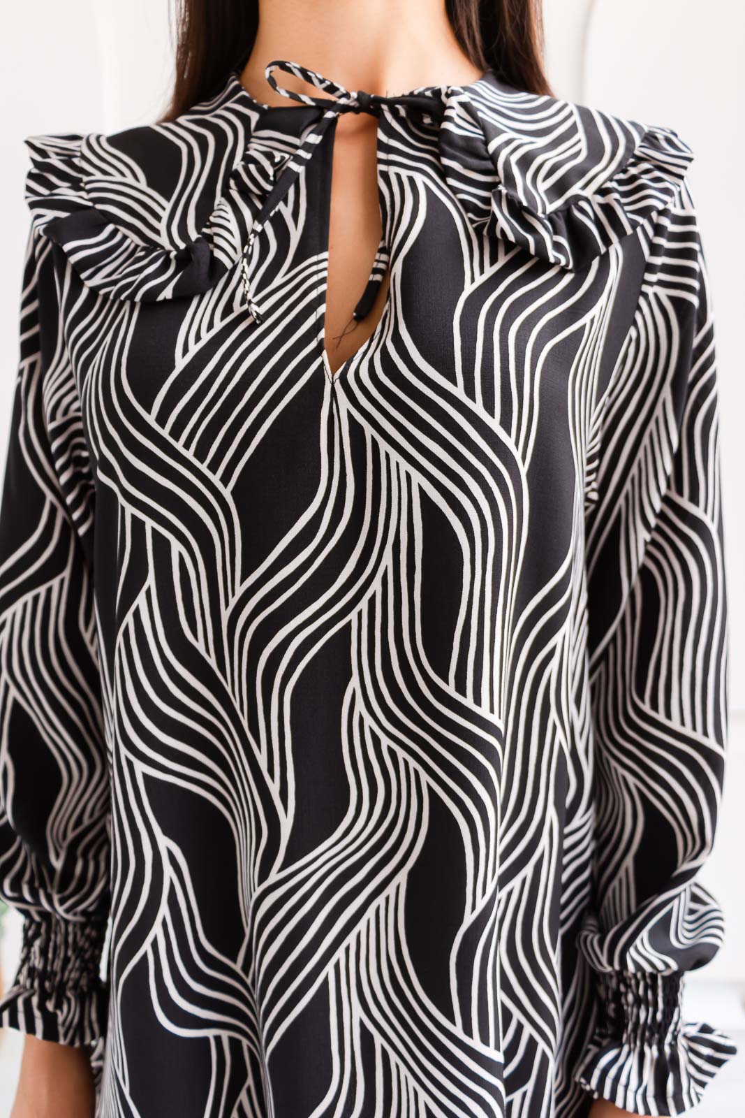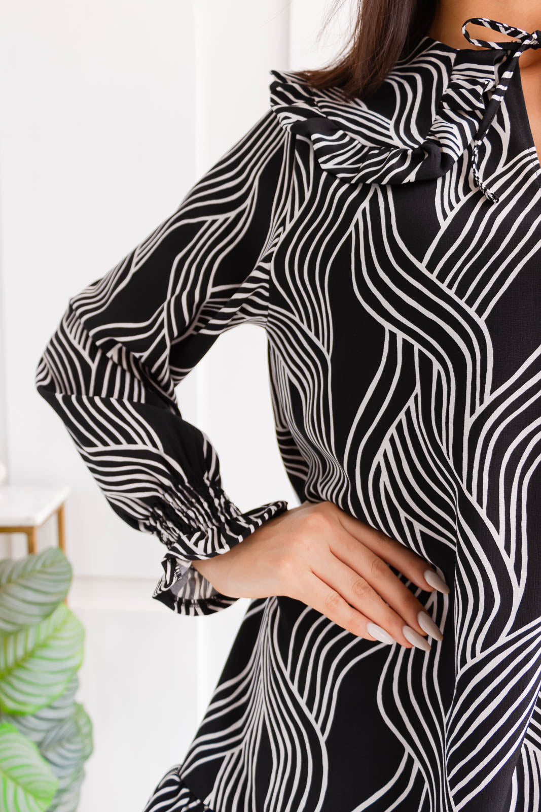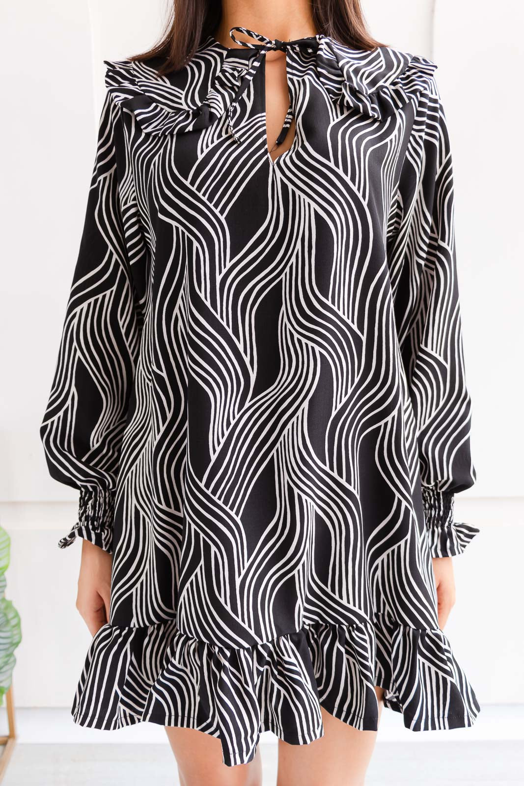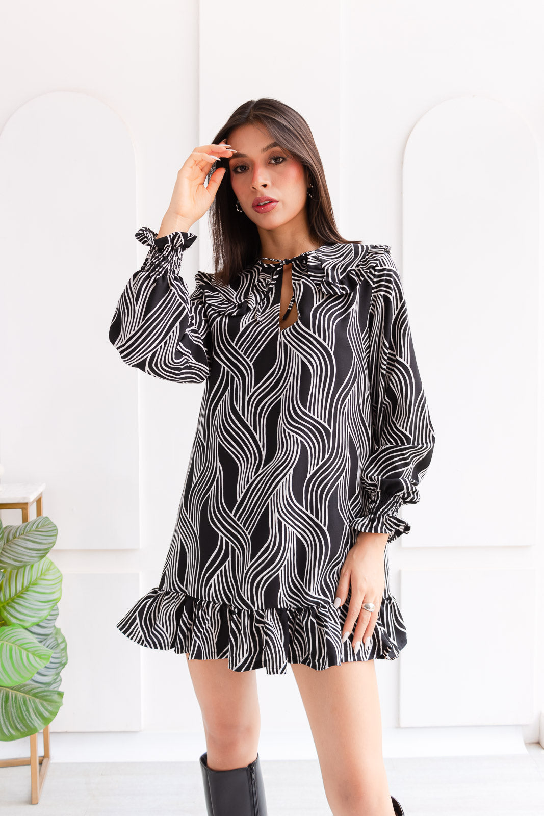 Leticia destaca por su estampado en ondas abstractas en blanco sobre fondo negro, que evocan movimiento y fluidez. Su diseño incluye mangas largas con puño elástico, detalle de lazo en el escote con abertura tipo gota, y un coqueto vuelo en el bajo que aporta feminidad y dinamismo. Ideal para llevar con botas altas o flats según la ocasión, este vestido combina perfectamente la esencia bohemia con un toque chic y moderno.