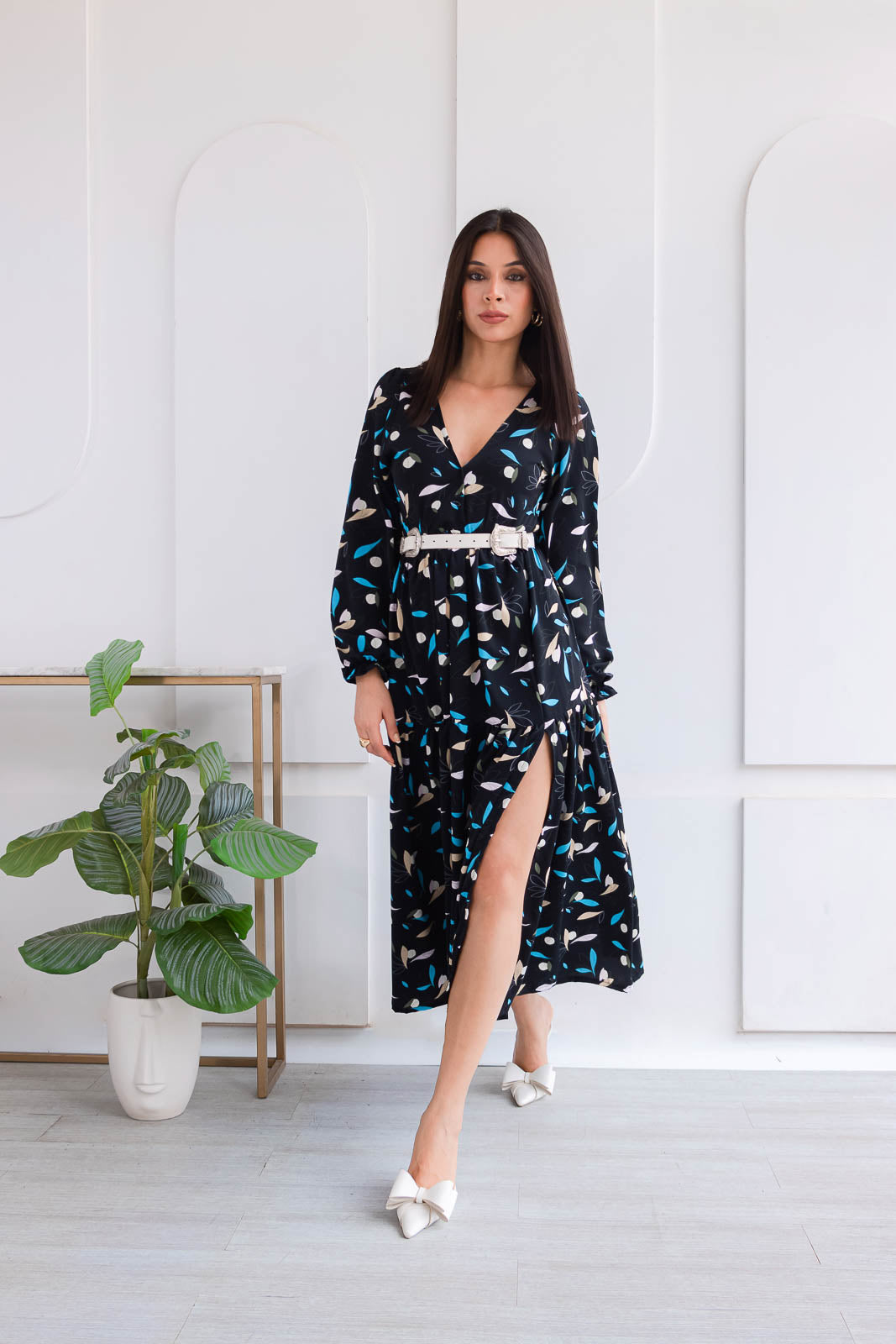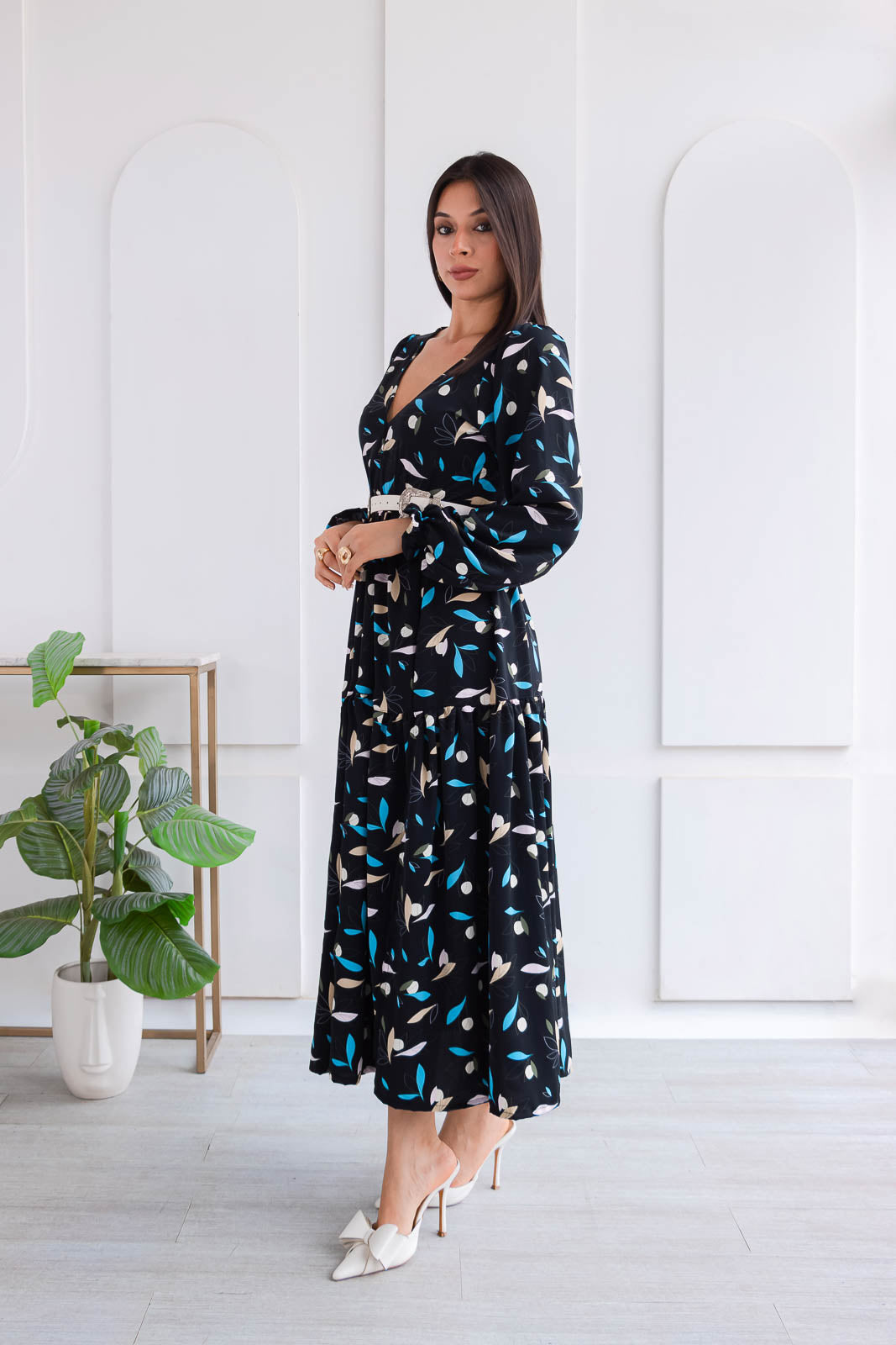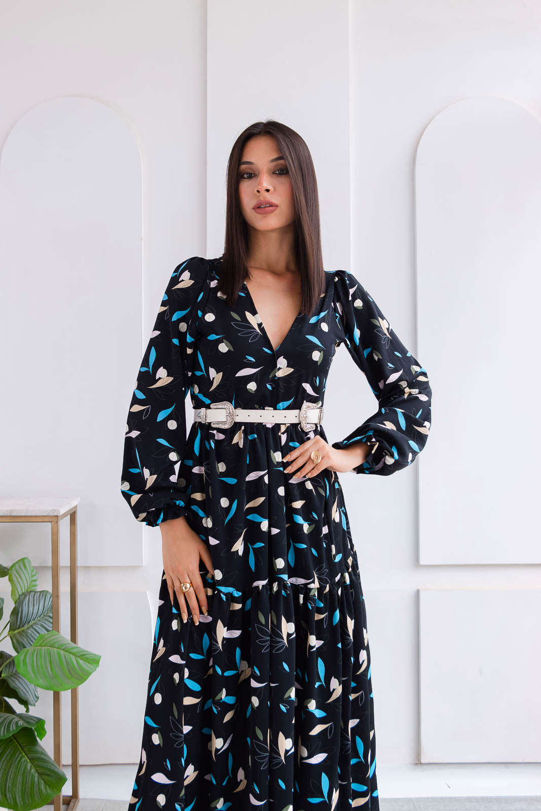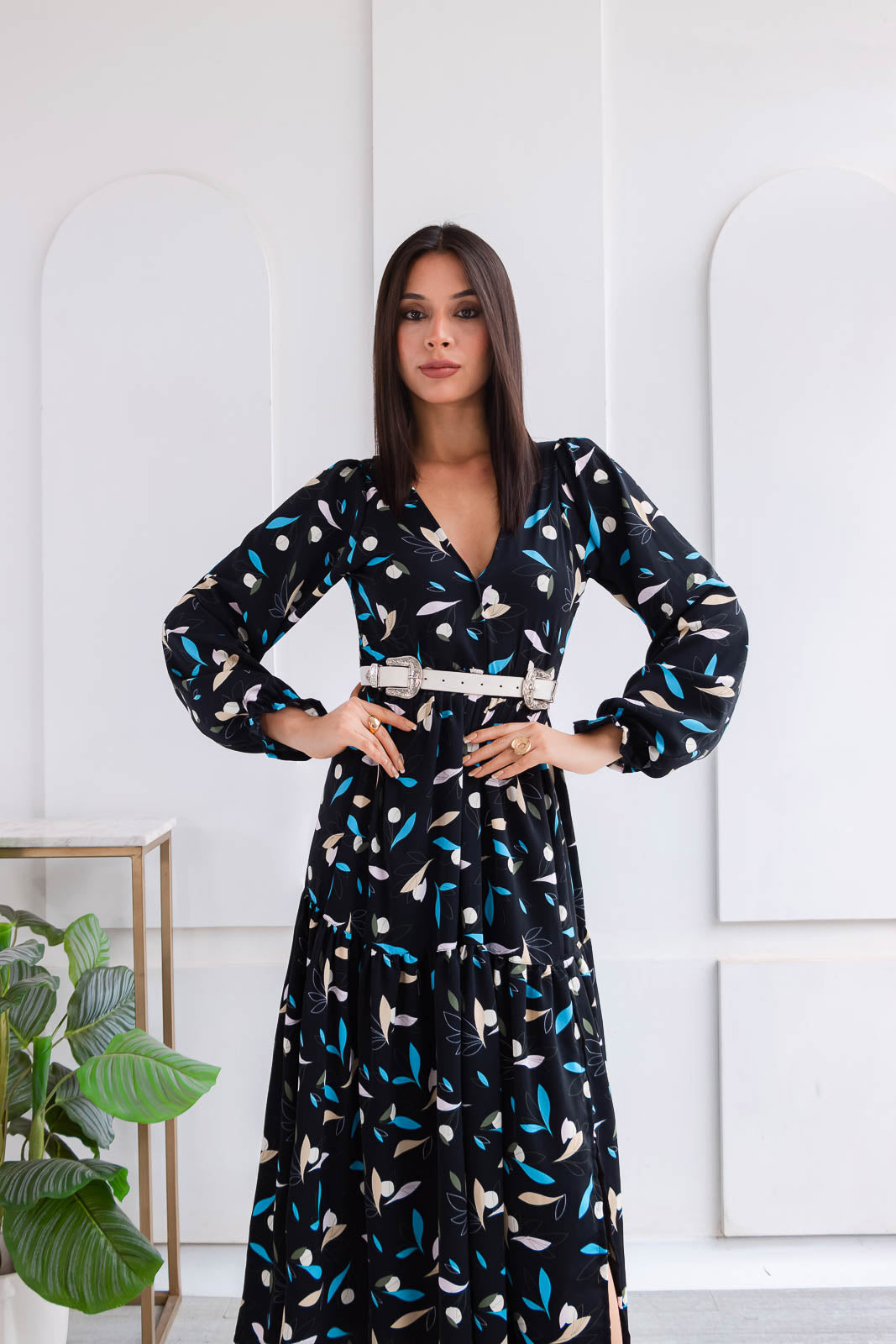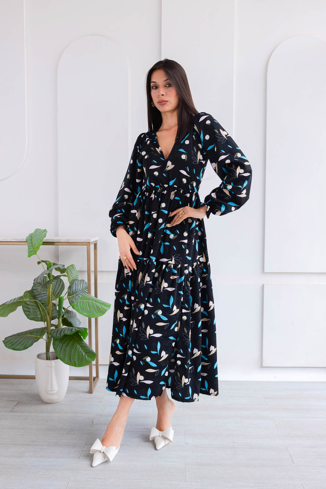 Este vestido midi combina elegancia en delicado fondo estampado floral en tonos cálidos sobre fondo negro, creando un contraste sofisticado y femenino. Su escote en V estiliza la figura, mientras que las mangas largas con ligero volumen aportan un toque romántico. La falda amplia y fluida ofrece movimiento y comodidad, ideal para lucir con estilo durante todo el día.