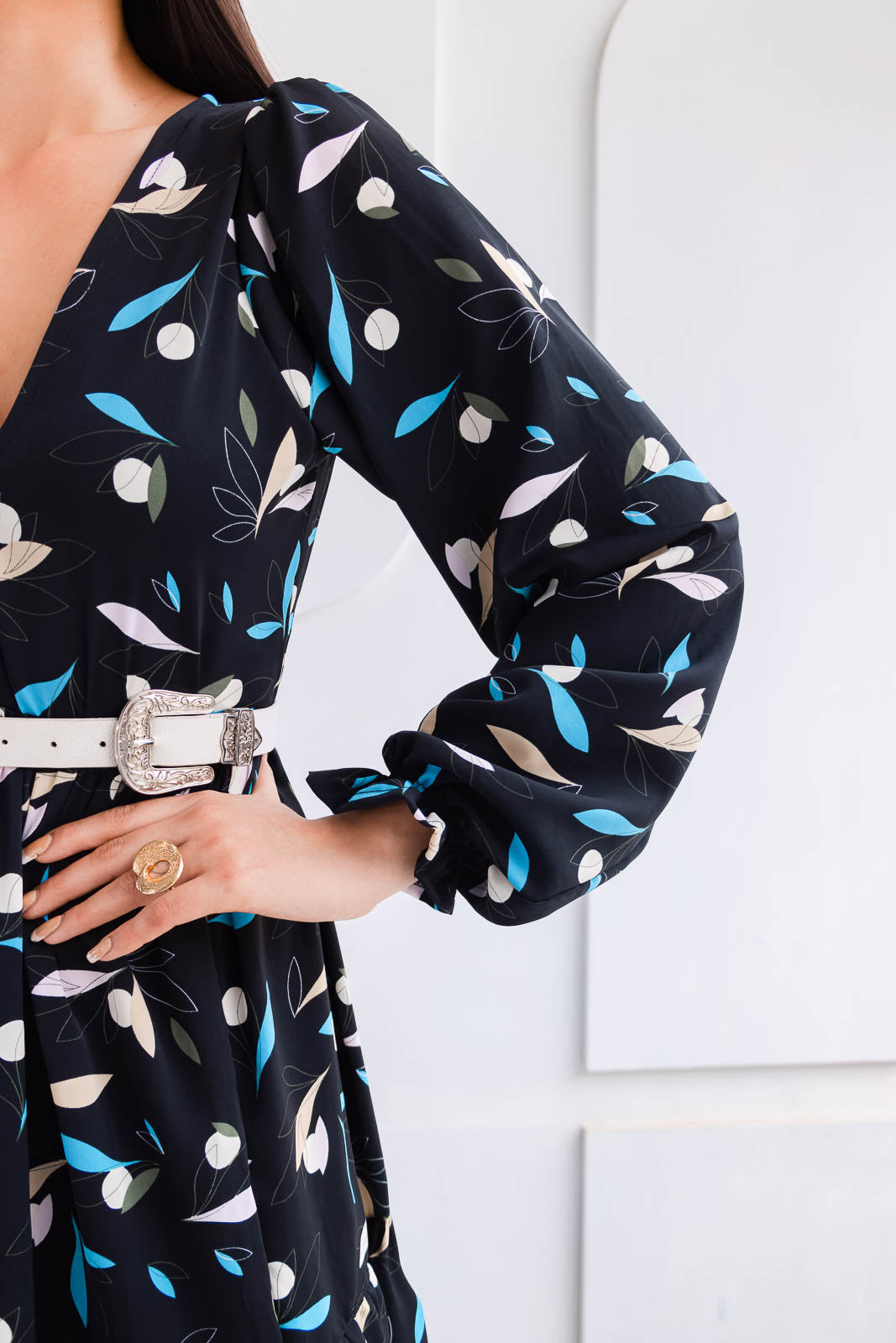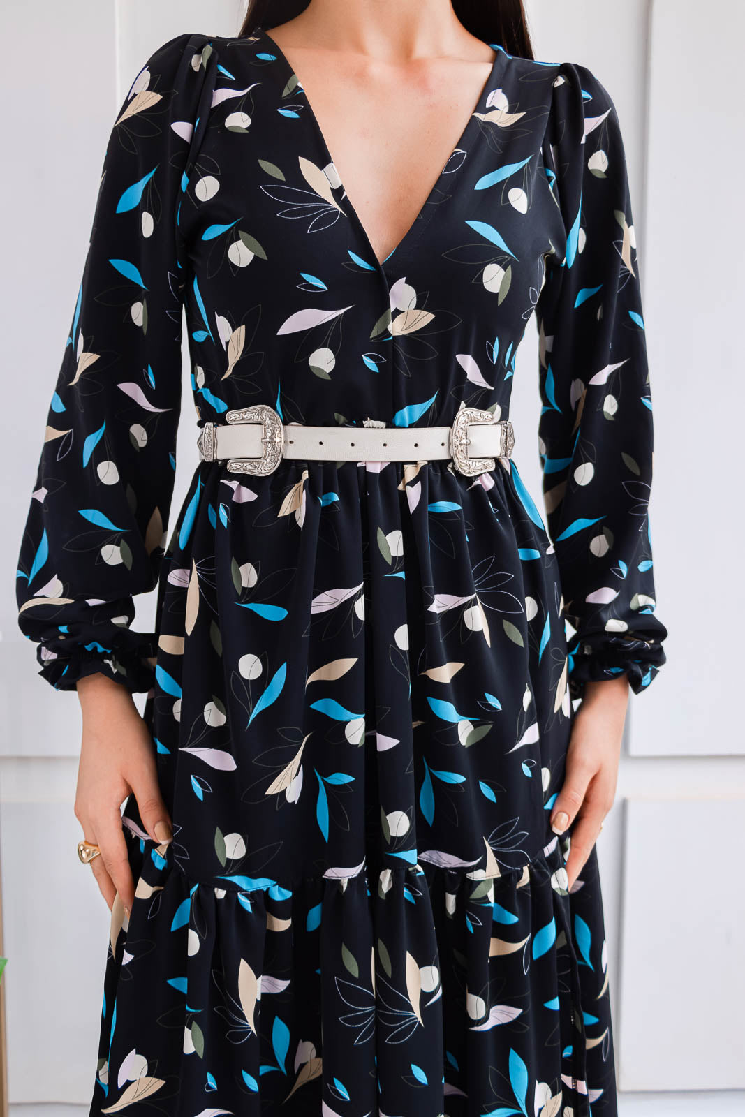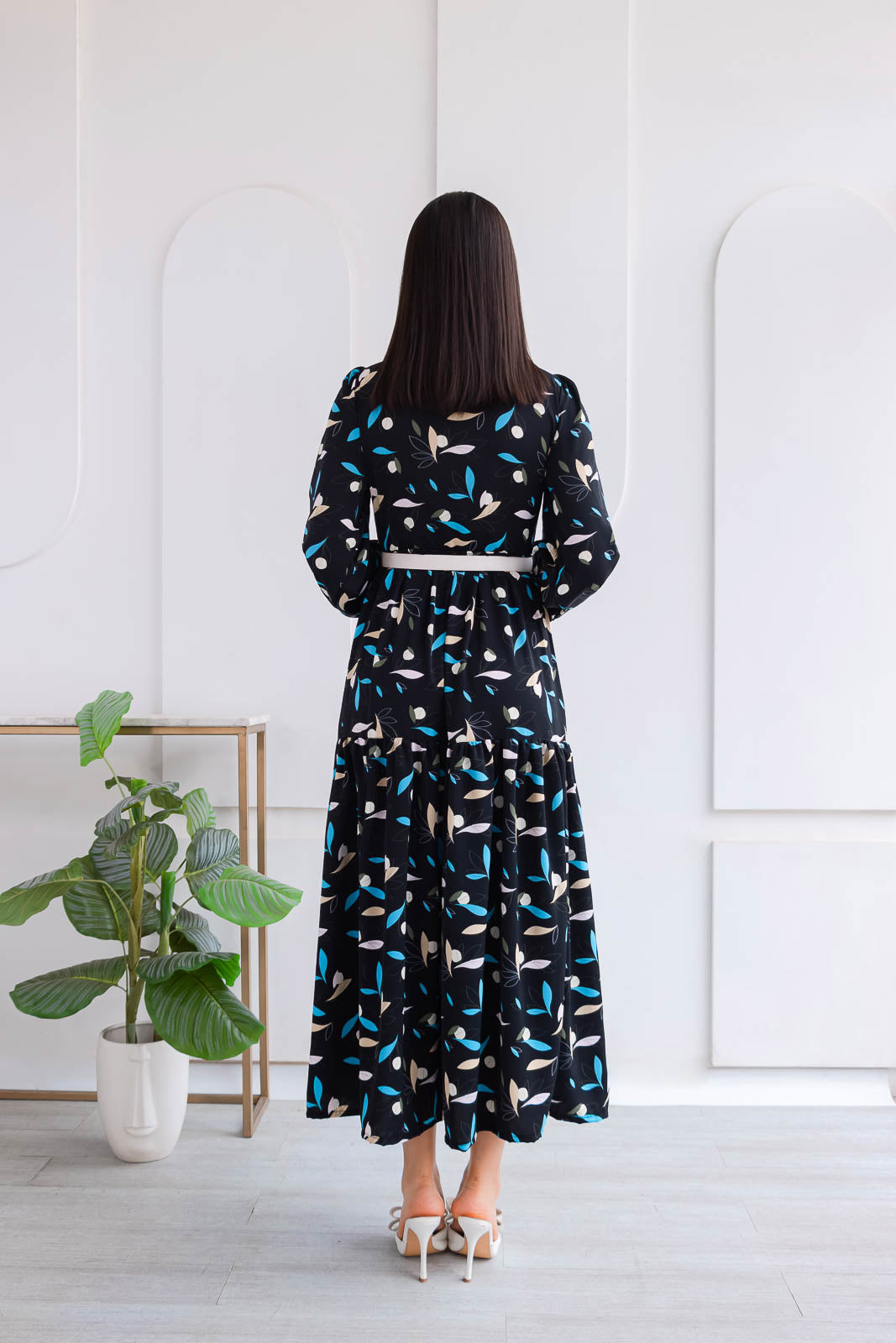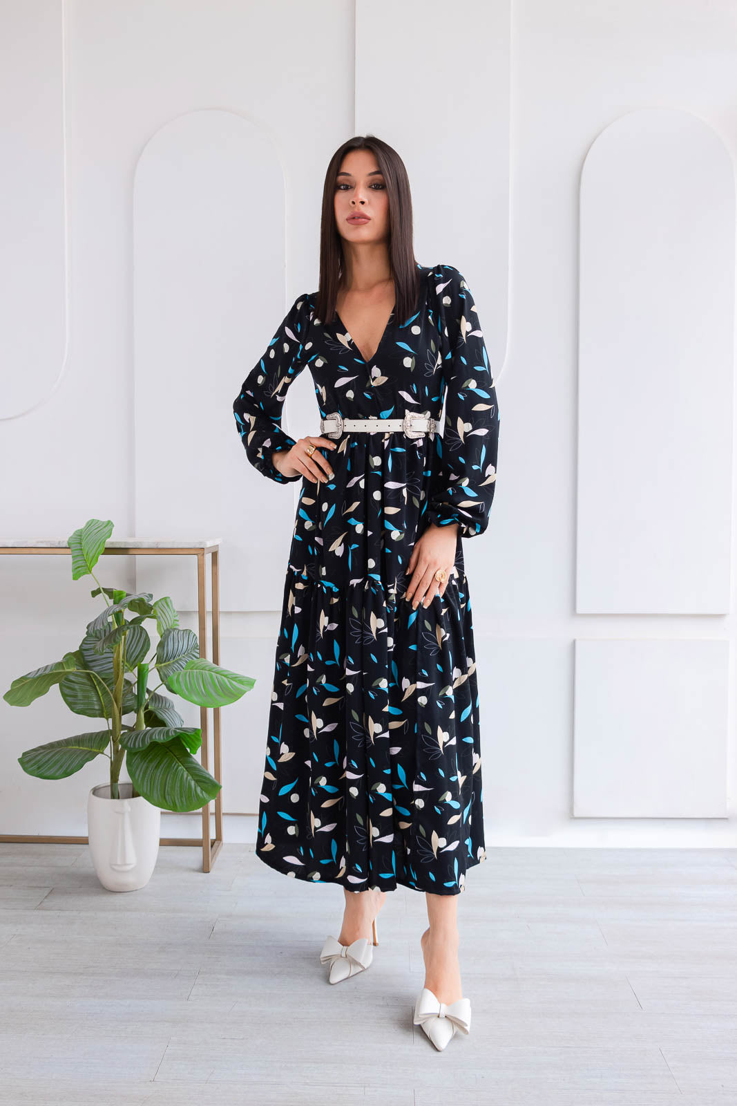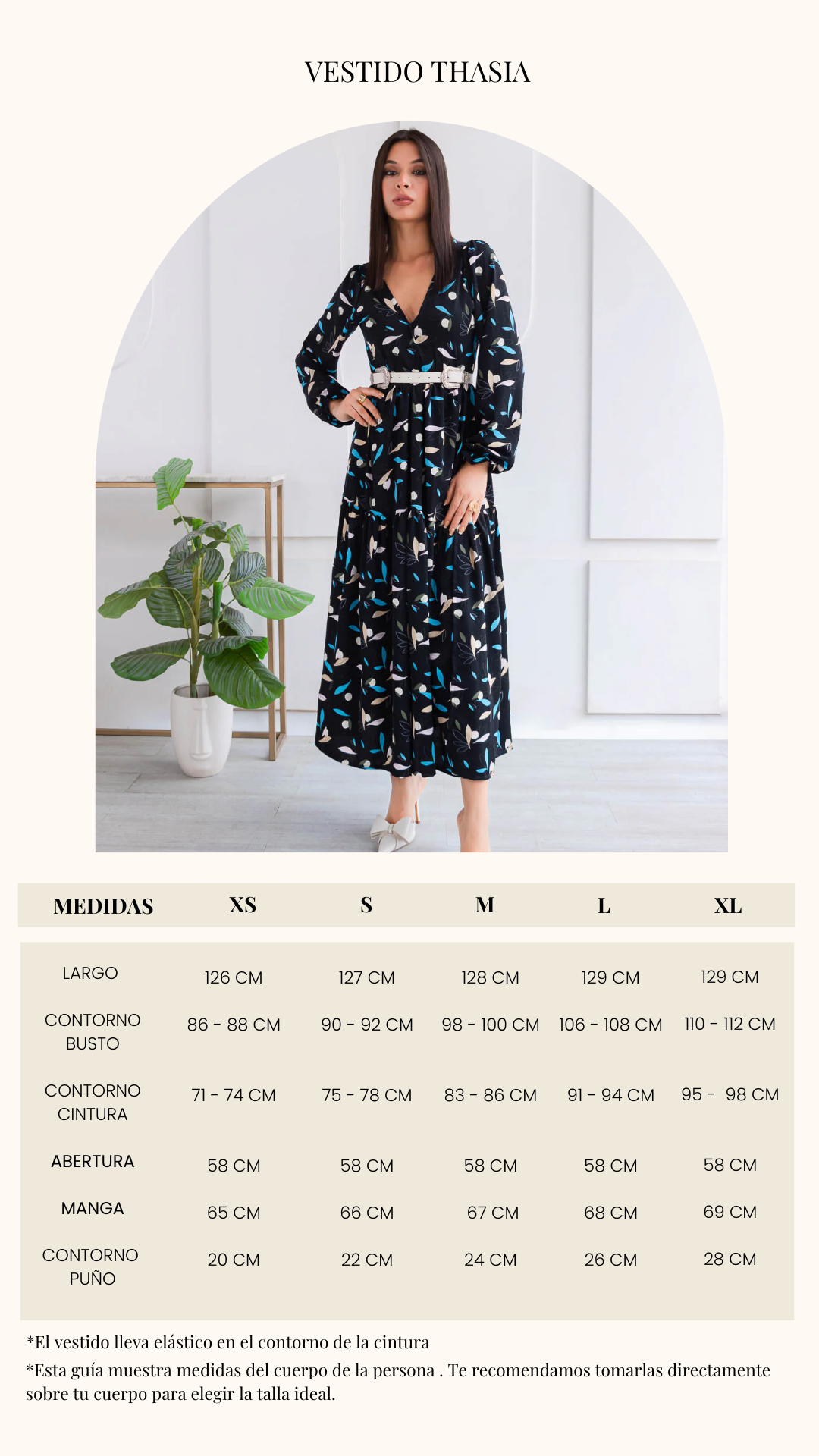 Este vestido midi combina elegancia en delicado fondo estampado floral en tonos cálidos sobre fondo negro, creando un contraste sofisticado y femenino. Su escote en V estiliza la figura, mientras que las mangas largas con ligero volumen aportan un toque romántico. La falda amplia y fluida ofrece movimiento y comodidad, ideal para lucir con estilo durante todo el día.