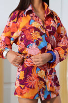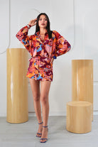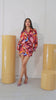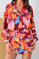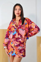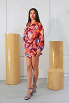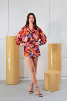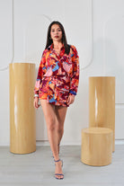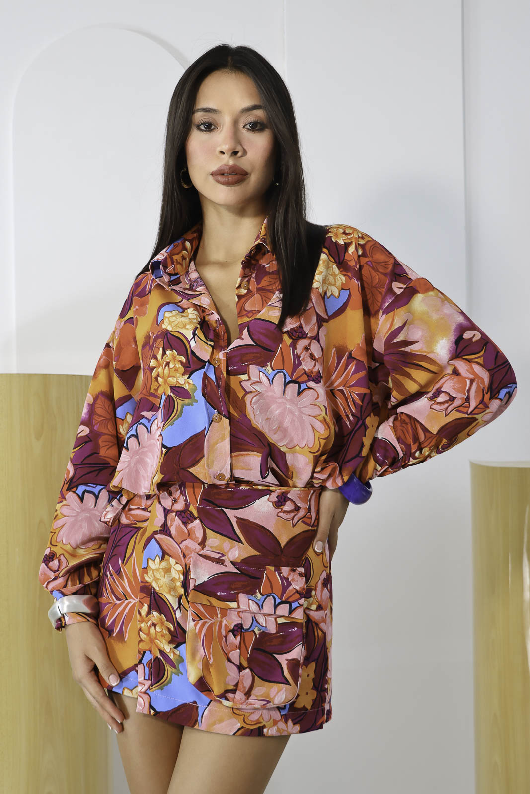 Combina tonos intensos de rojo, fucsia, naranja y acentos en azul, creando un contraste lleno de energía, carácter y sofisticación. Set de 2 piezas. Camisa fluida de manga larga y una falda short de tiro alto con detalle de bolsillo delantero. Su paleta de color lo hace ideal para climas cálidos, y su diseño versátil te permite llevarlo junto o por separado, multiplicando tus opciones de outfit.