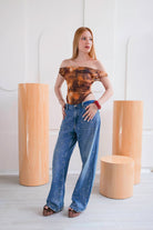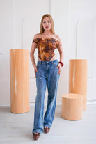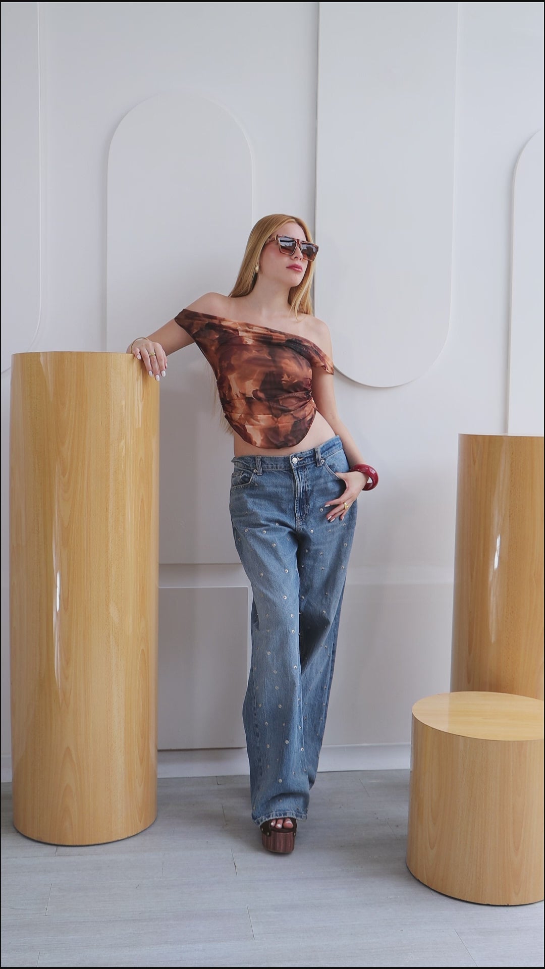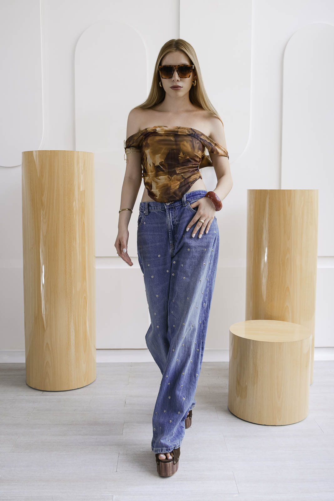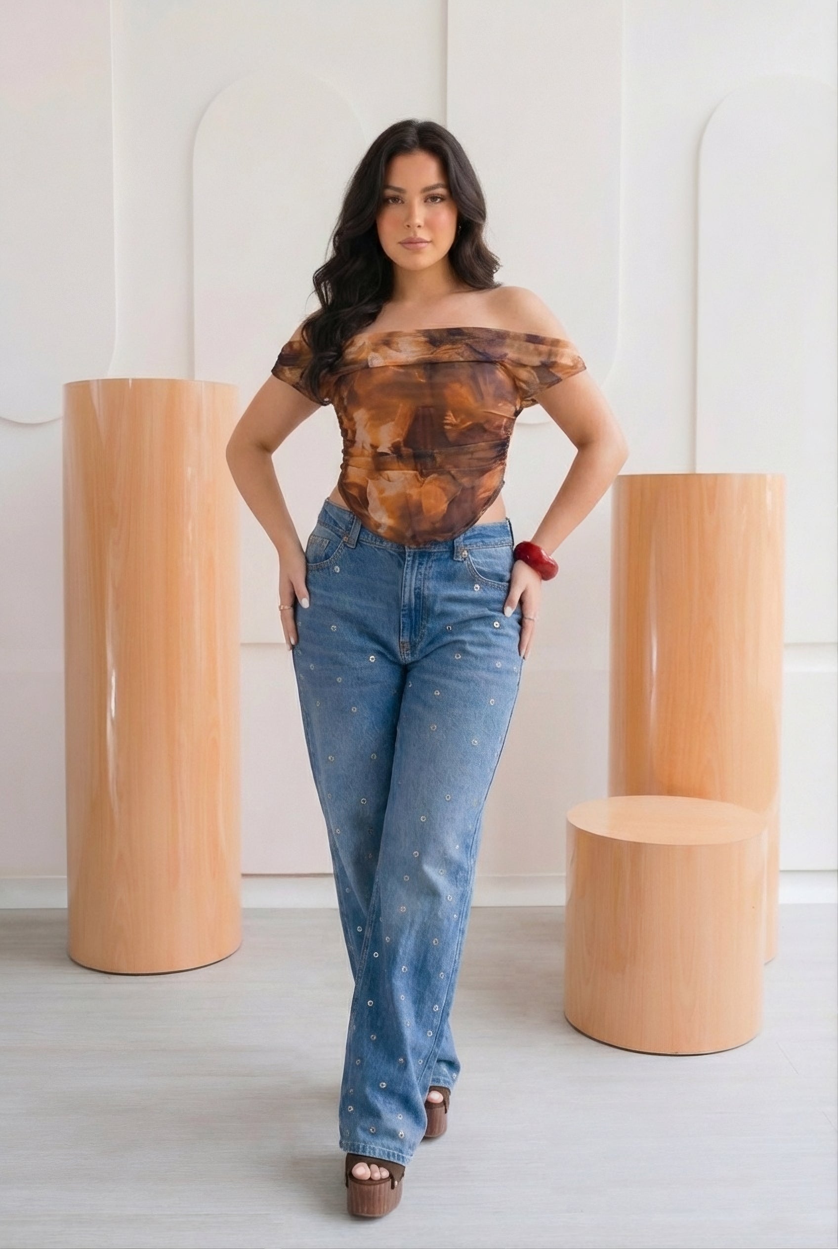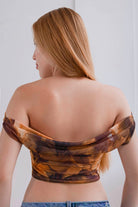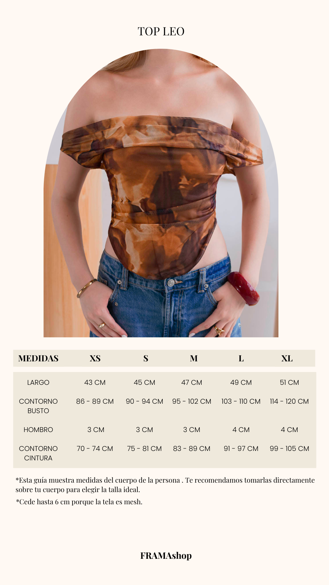 No hay reglas para usar top off shoulders. El detalle de los hombros al descubierto definitivamente le dará ese toque diferente a tu outfit, el cual un top común no te dará. Su estampado en tonos cálidos mezcla de marrones, caramelo y matices tierra haciéndolo una pieza perfecta para acompañarte en tus planes de verano.