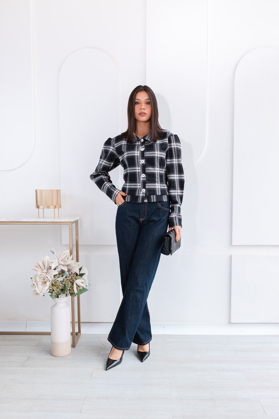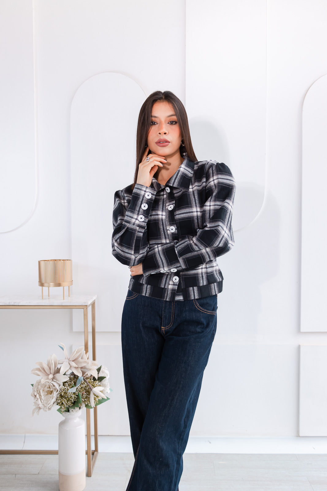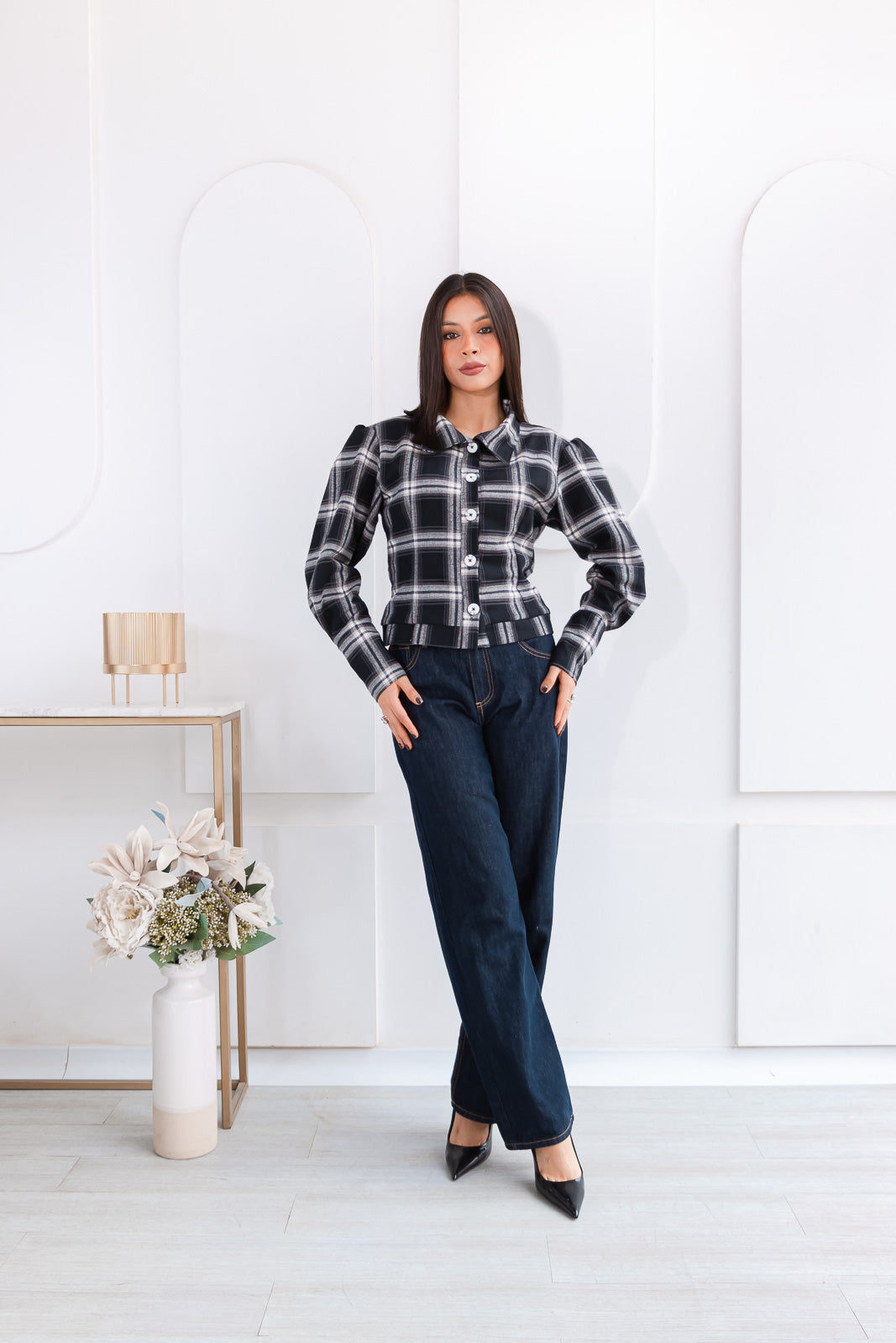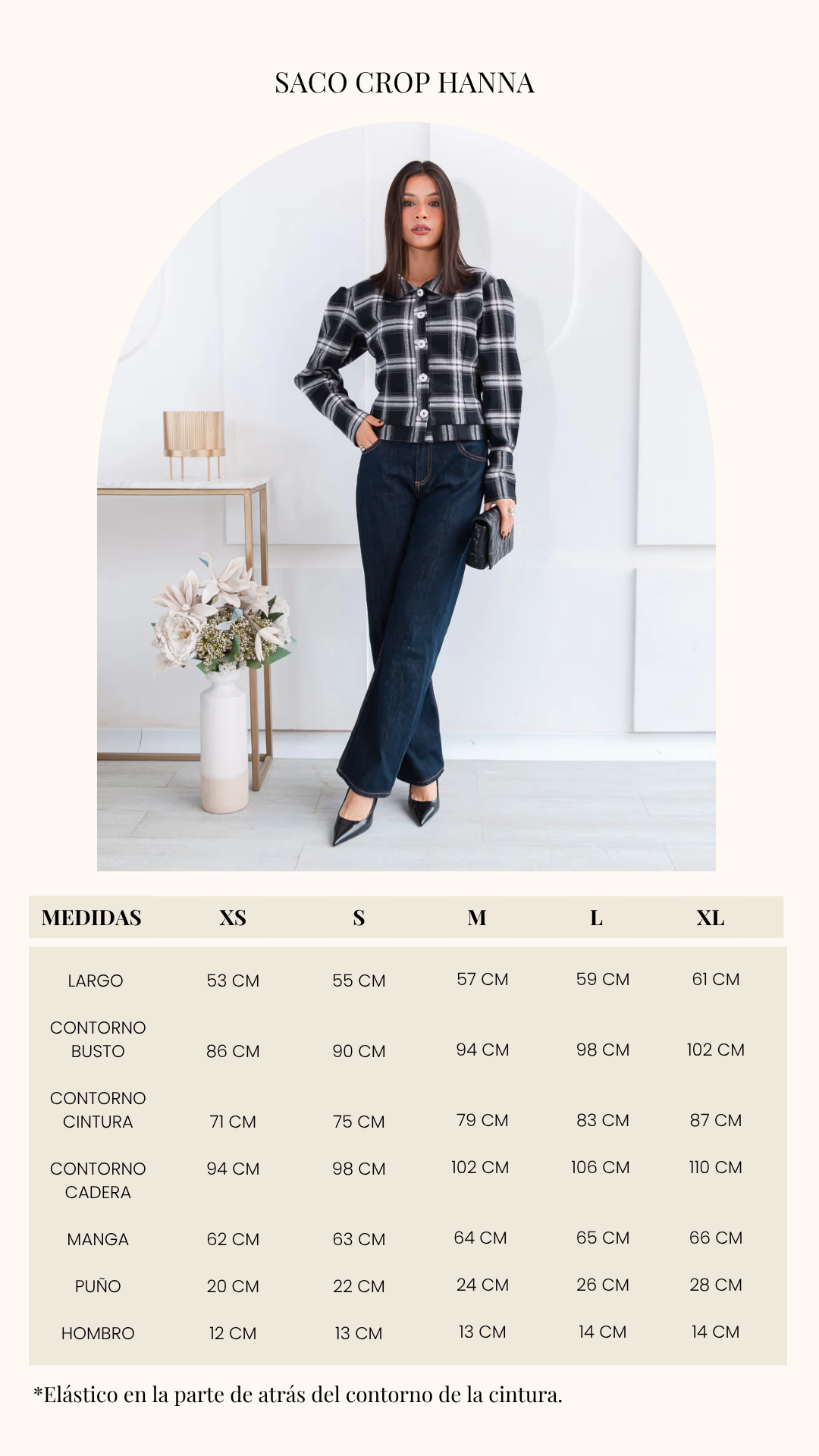 Una versión moderna del clásico estampado a cuadros. Saco Crop Hanna combina el estilo atemporal del tartán en tonos negros, grises y blancos, con detalles que marcan la diferencia: botones frontales grandes y contrastantes, hombros ligeramente estructurados y un fit recto que estiliza la silueta.