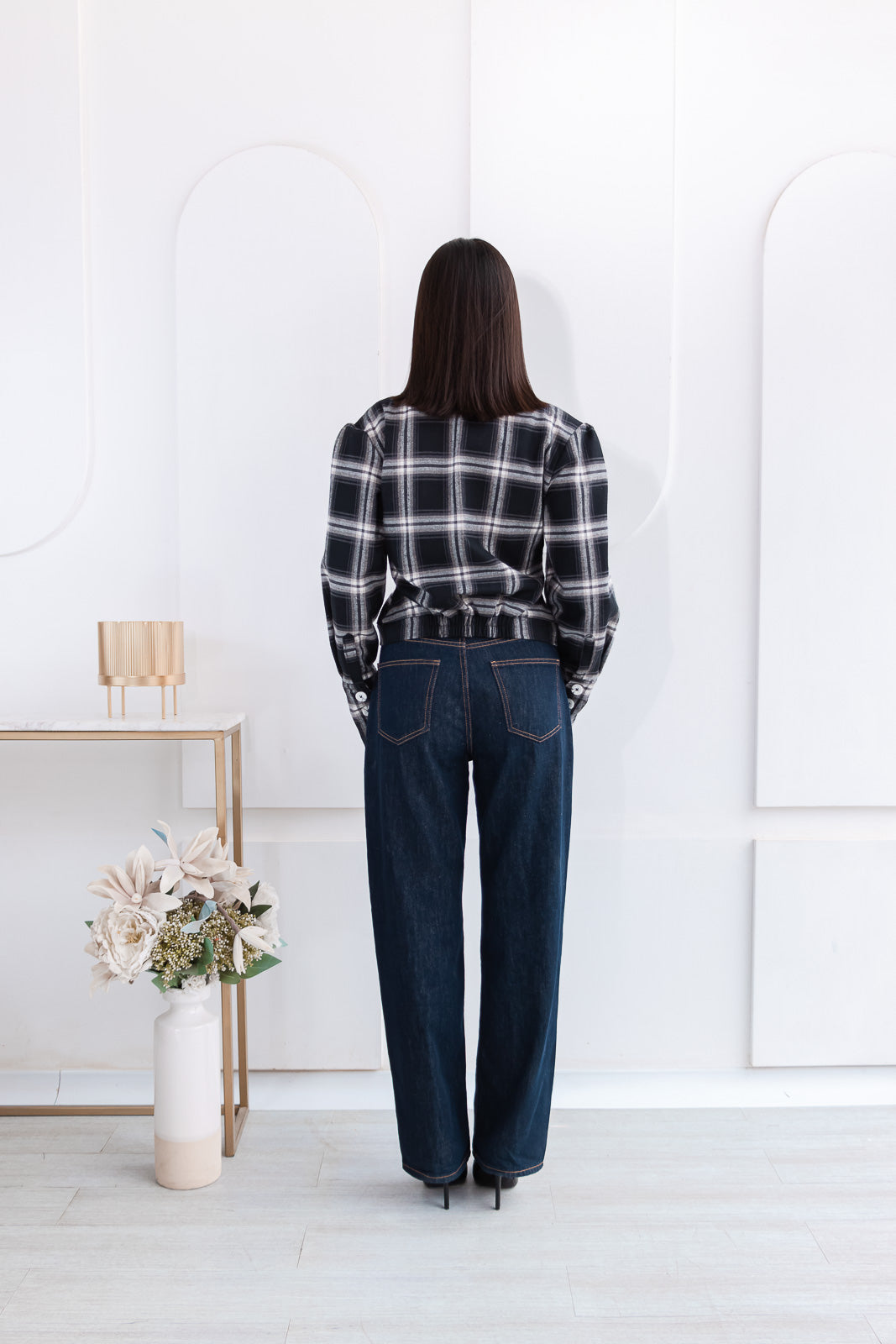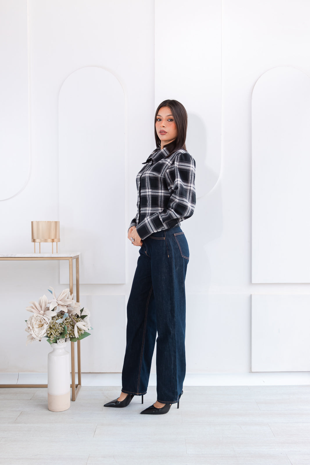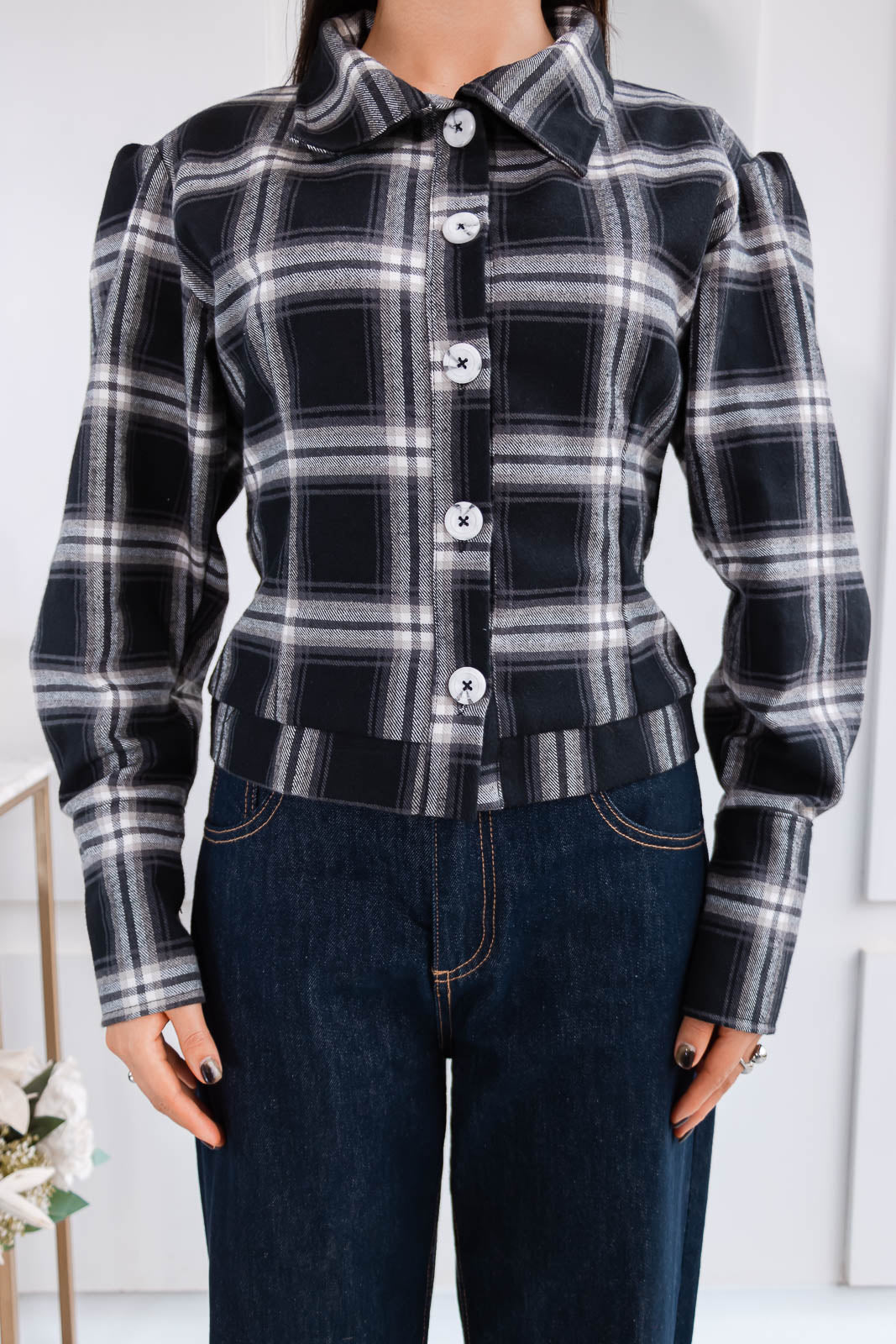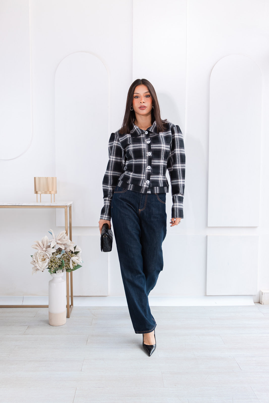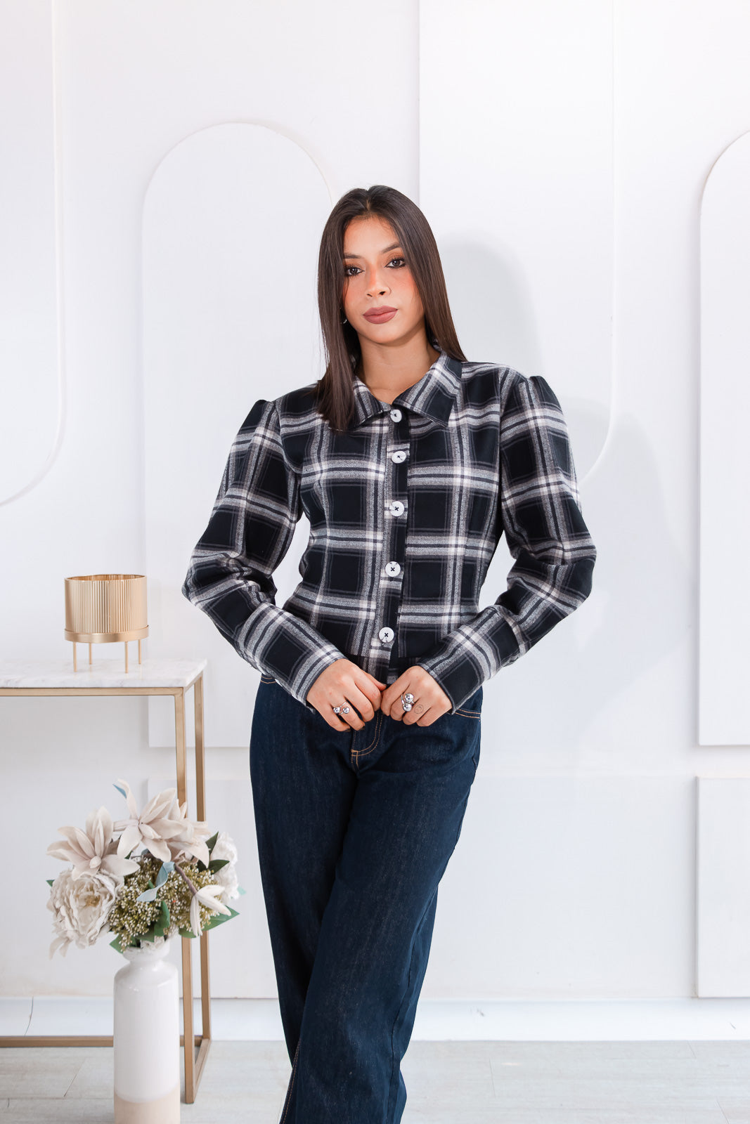 Una versión moderna del clásico estampado a cuadros. Saco Crop Hanna combina el estilo atemporal del tartán en tonos negros, grises y blancos, con detalles que marcan la diferencia: botones frontales grandes y contrastantes, hombros ligeramente estructurados y un fit recto que estiliza la silueta.