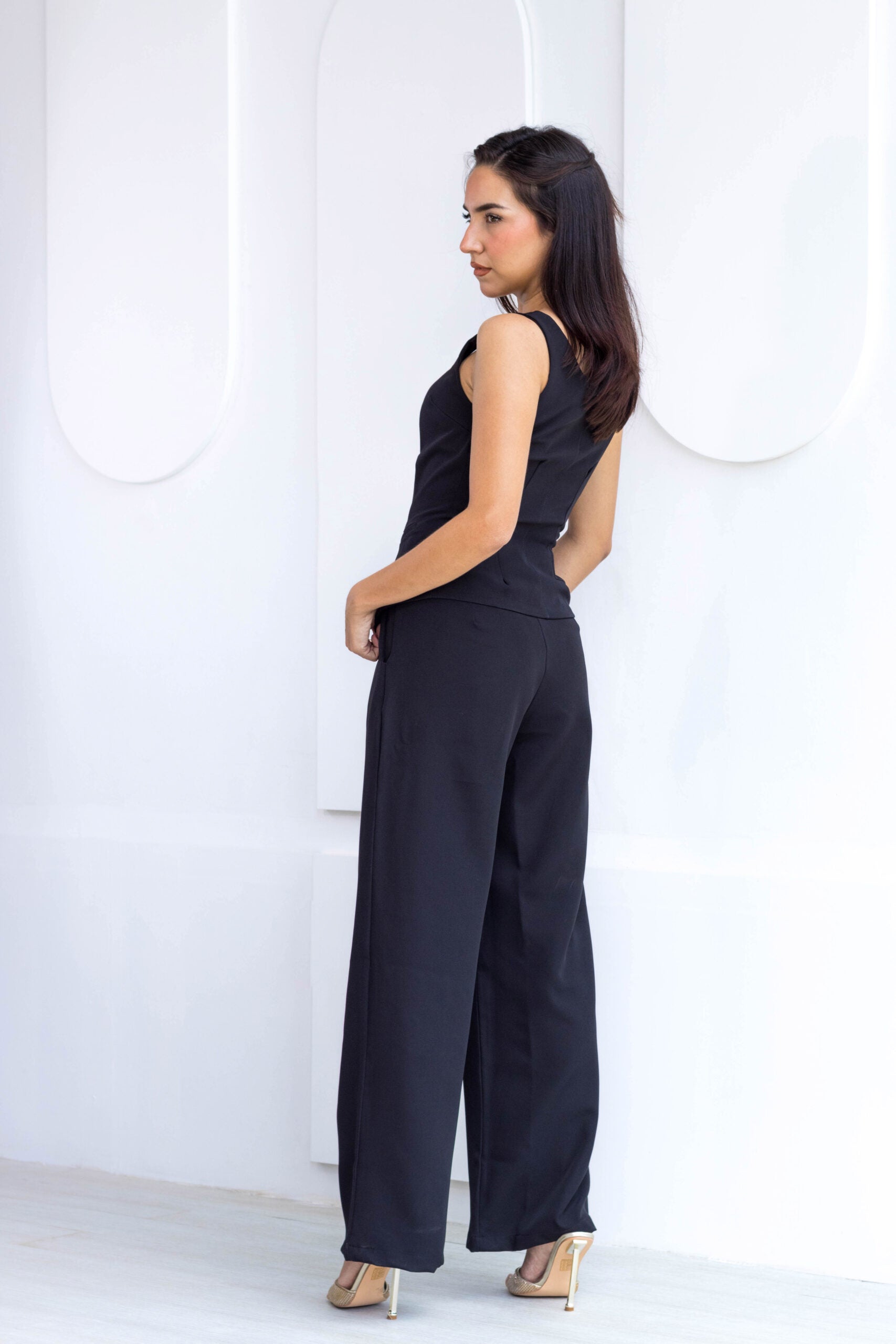 Conjunto de dos piezas. Chaleco con mangas cero, escote cuadrado tipo corset, botones en el centro y borde triangular con bolsillos. Pantalón clásico palazo con pretina ancha, bolsillos y botón en la parte delantera. Se luce muy bien junto o con prendas atemporales.