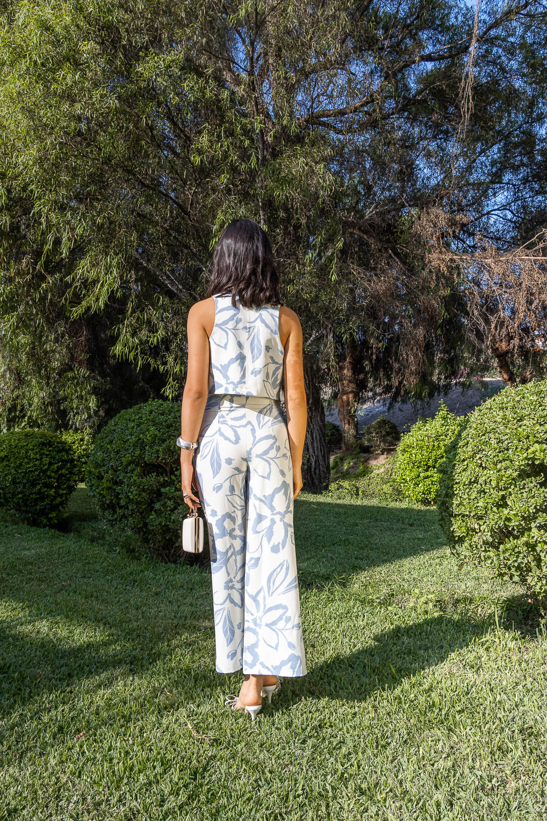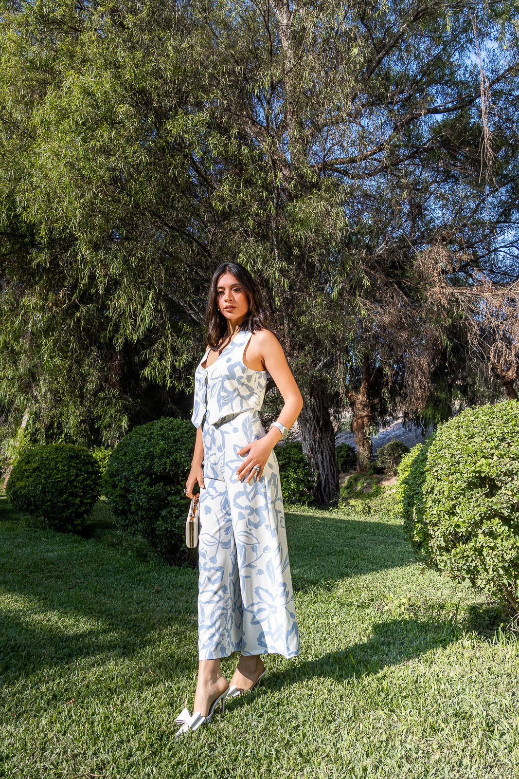 El diseño sin mangas con escote en “V” estiliza la silueta, mientras que el pantalón de pierna ancha aporta movimiento y comodidad. Ideal para un bautizo de día, un matrimonio civil al aire libre o incluso una celebración elegante en la tarde.