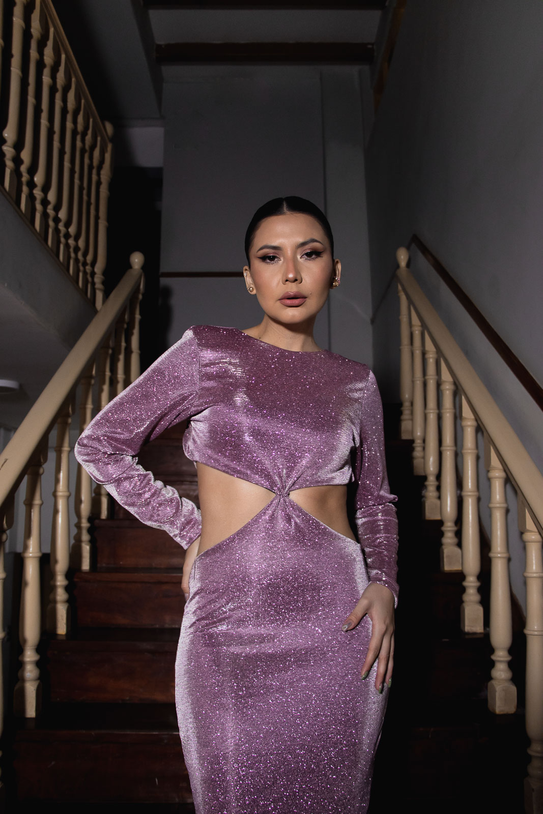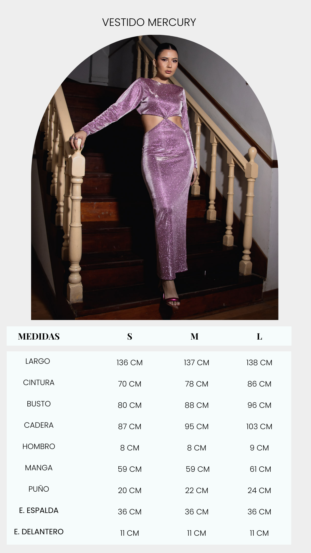 Vestido largo, ceñido al cuerpo con detalle de cut out en la parte del abdomen que realza tu figura y mangas largas.