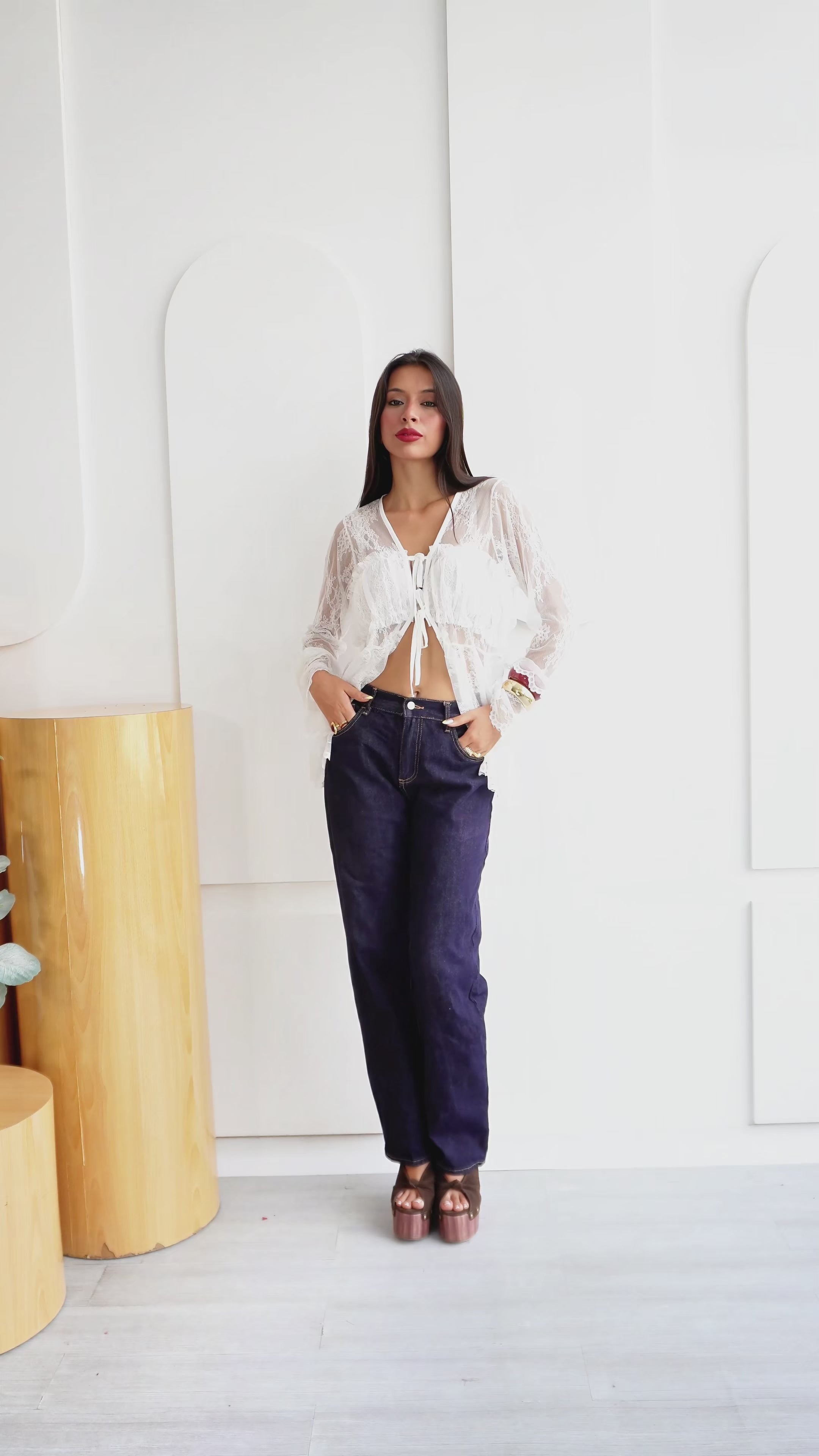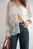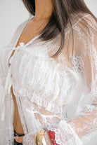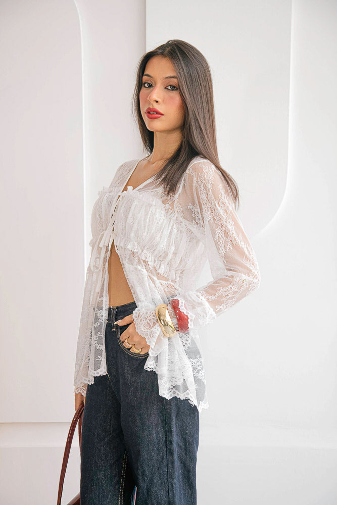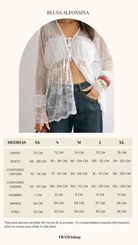 La Blusa Alfonsina destaca por su diseño completamente trabajado en encaje blanco, elegante, delicado y femenino. Su silueta fluida crea un efecto bohemio, mientras que los lazos frontales añaden un toque romántico y ajustable que realza la figura con sutileza.