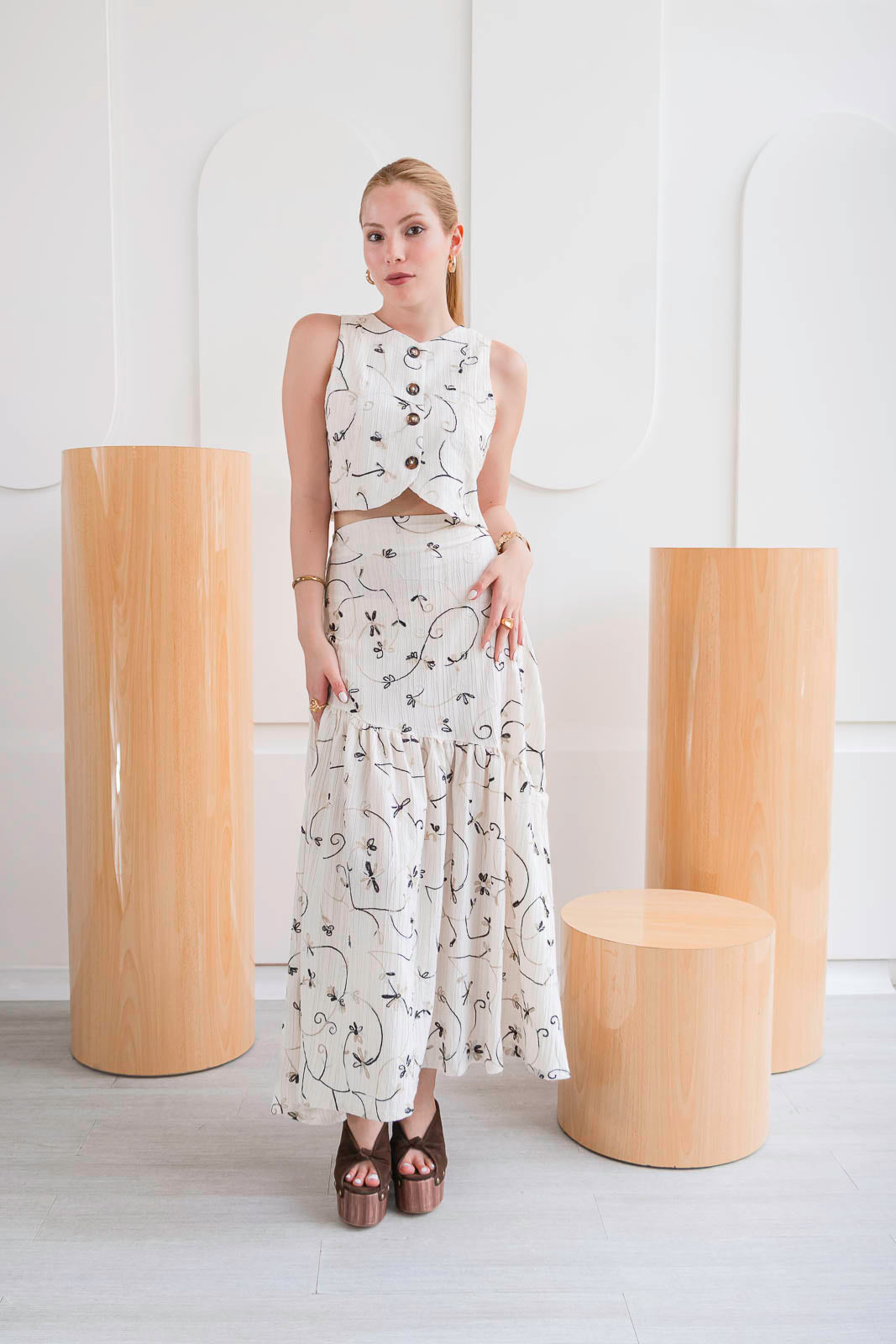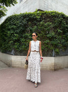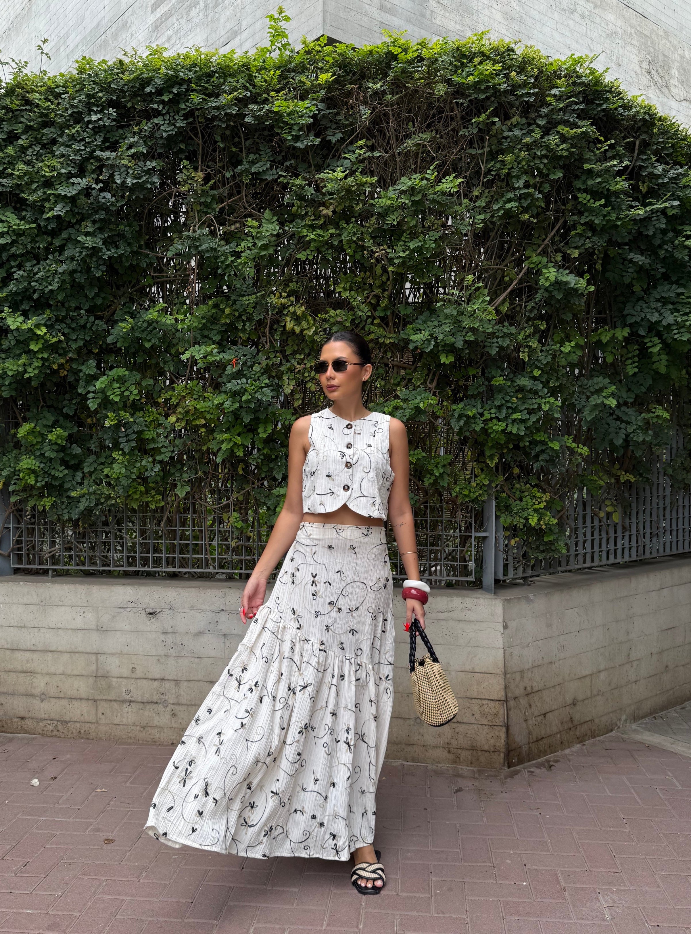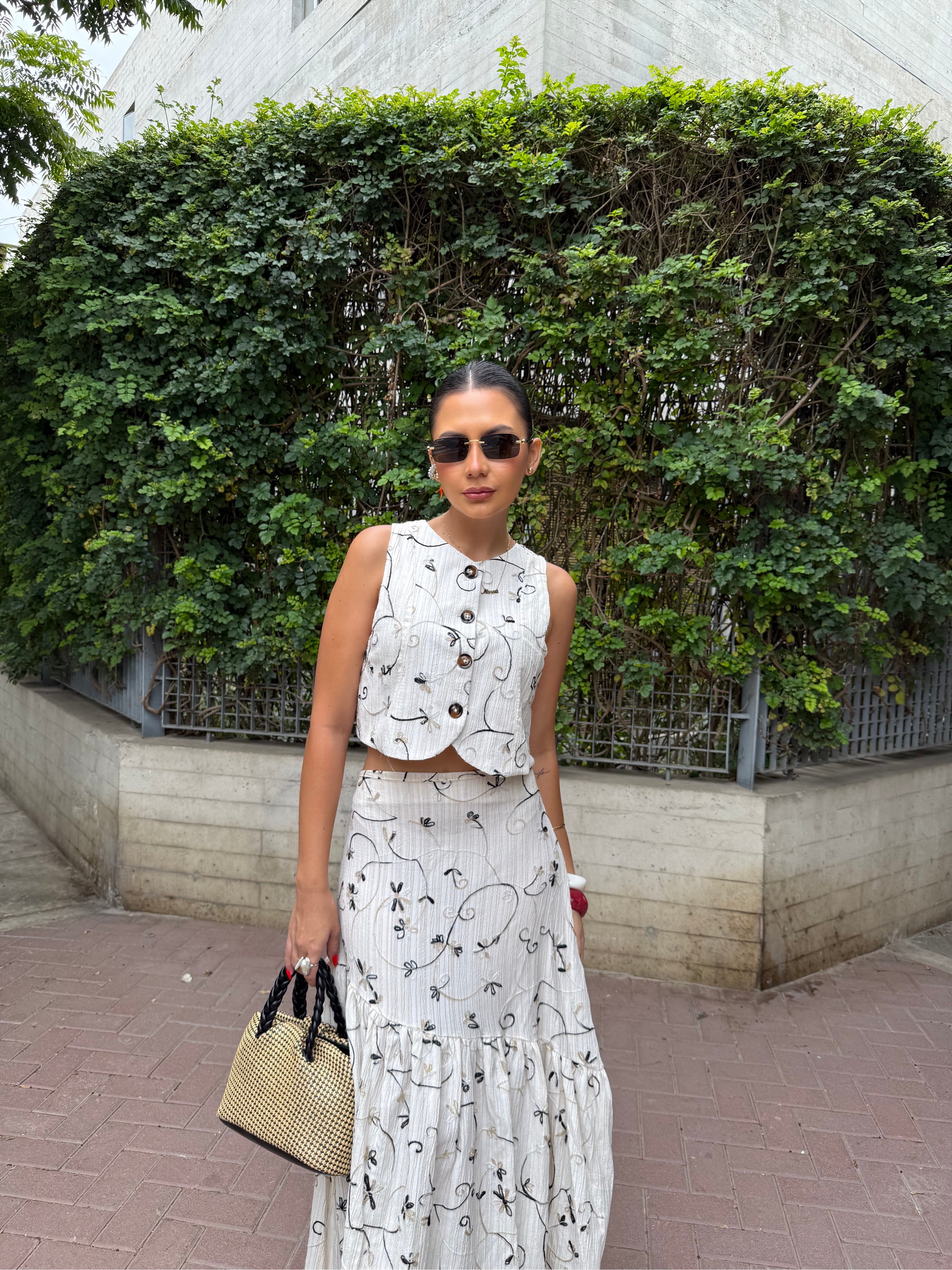 Un conjunto que enamora a primera vista. Set 2 de piezas, en tono marfil con delicado bordado floral en tonos suaves sobre fondo marfil hace de el una pieza romántica. Chaleco + Maxi Falda con detalle de pliegues de caída amplia y movimiento.