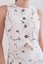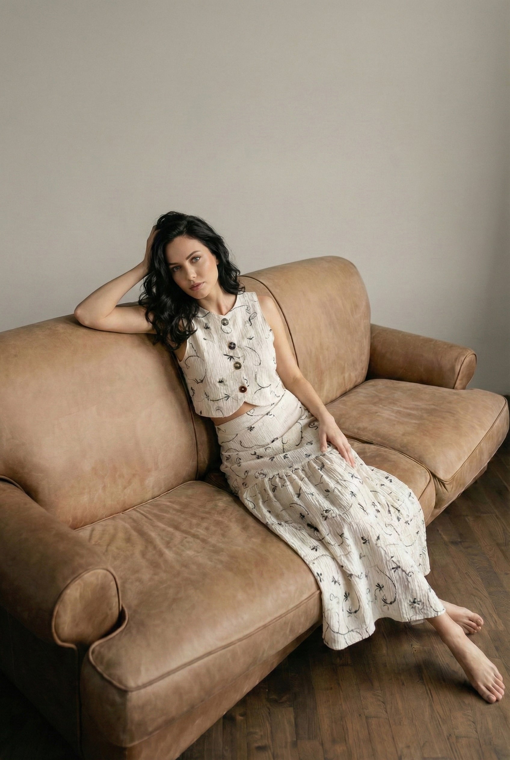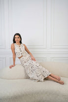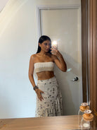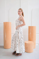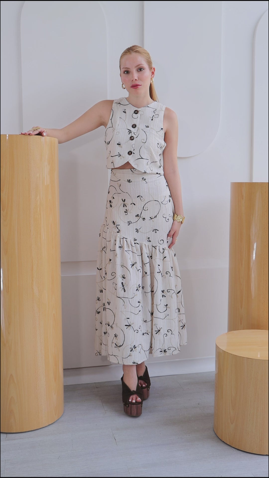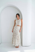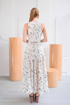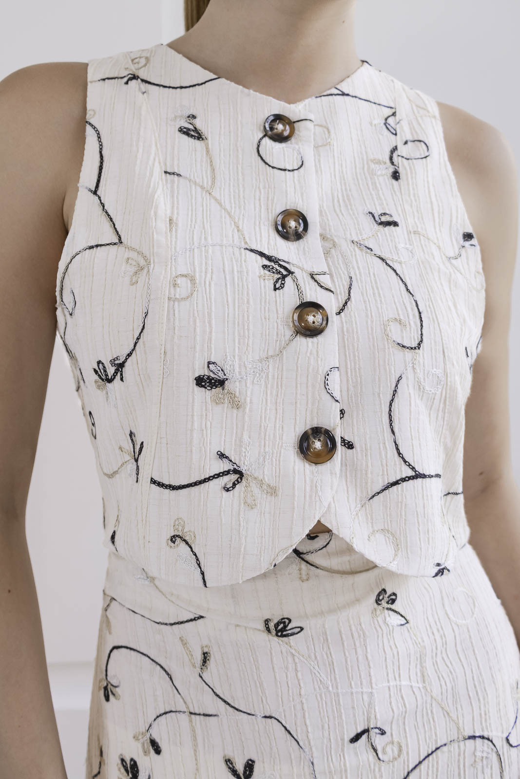 Un conjunto que enamora a primera vista. Set 2 de piezas, en tono marfil con delicado bordado floral en tonos suaves sobre fondo marfil hace de el una pieza romántica. Chaleco + Maxi Falda con detalle de pliegues de caída amplia y movimiento.