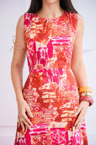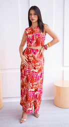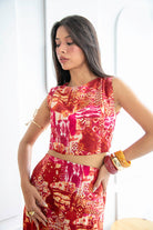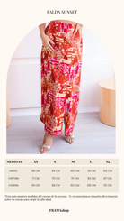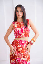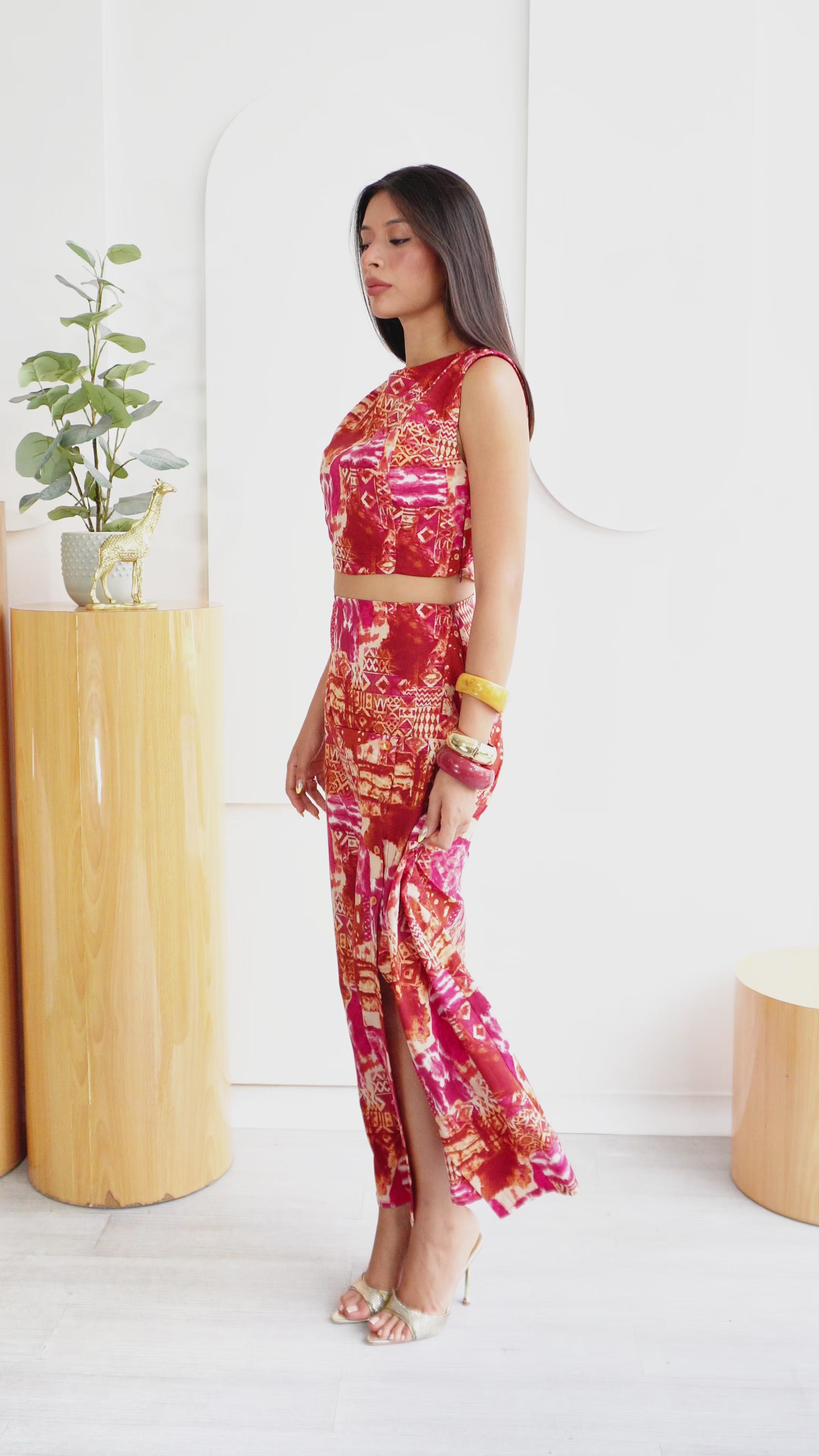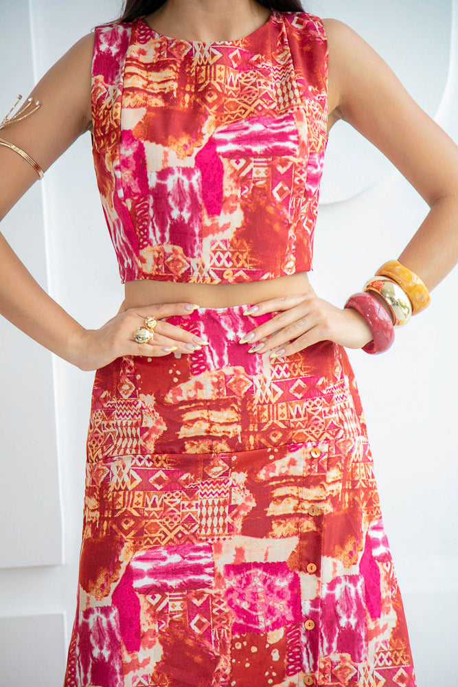 Su combinación de colores intensos rojos, naranjas y toques de fucsia crea un efecto visual llamativo.Set de 2 piezas. El top tipo crop, de corte limpio y estructurado y la falda de tiro alto, caída fluida con detalles de botones en la parte lateral.