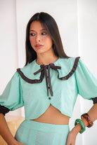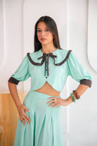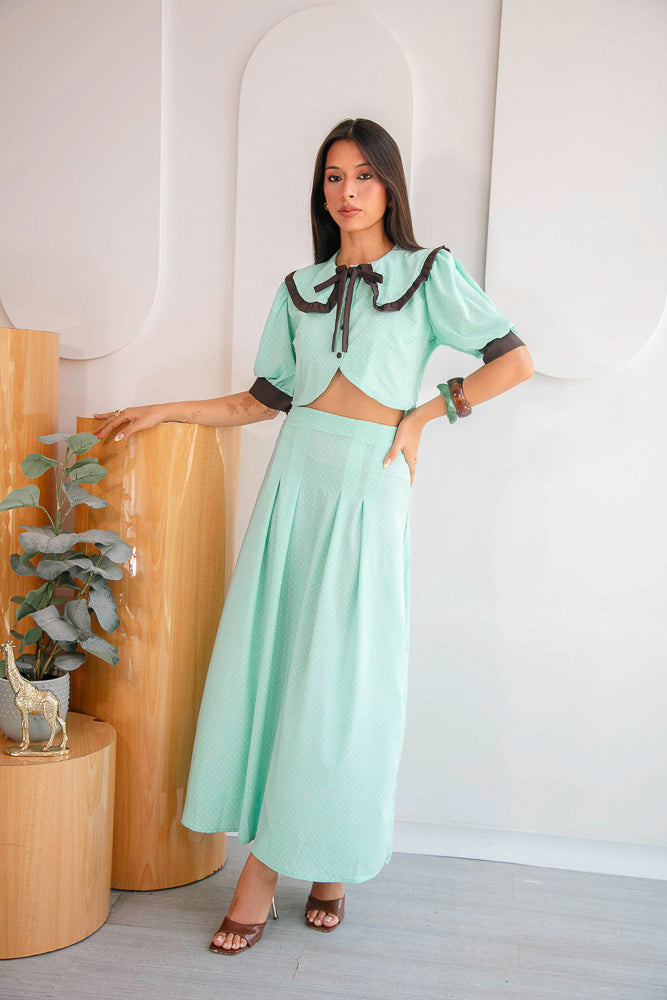 Set de 2 piezas. Camisa crop con detalles en el cuello de bordes color marrón y mangas abullonadas y falda larga de caída fluida con cierre lateral. Su diseño versátil permite llevar las piezas juntas o por separado para múltiples combinaciones.