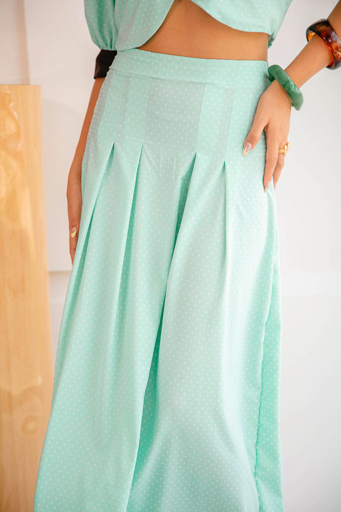 El set Honey Muse es una propuesta encantadora que combina dulzura, feminidad y un aire vintage. Confeccionado en un suave tono verde menta, este conjunto destaca por su delicado estampado de polkadots que aporta textura visual y un estilo romántico.