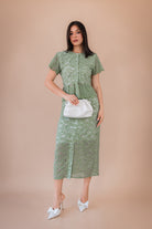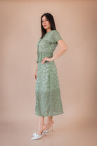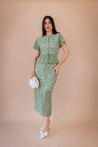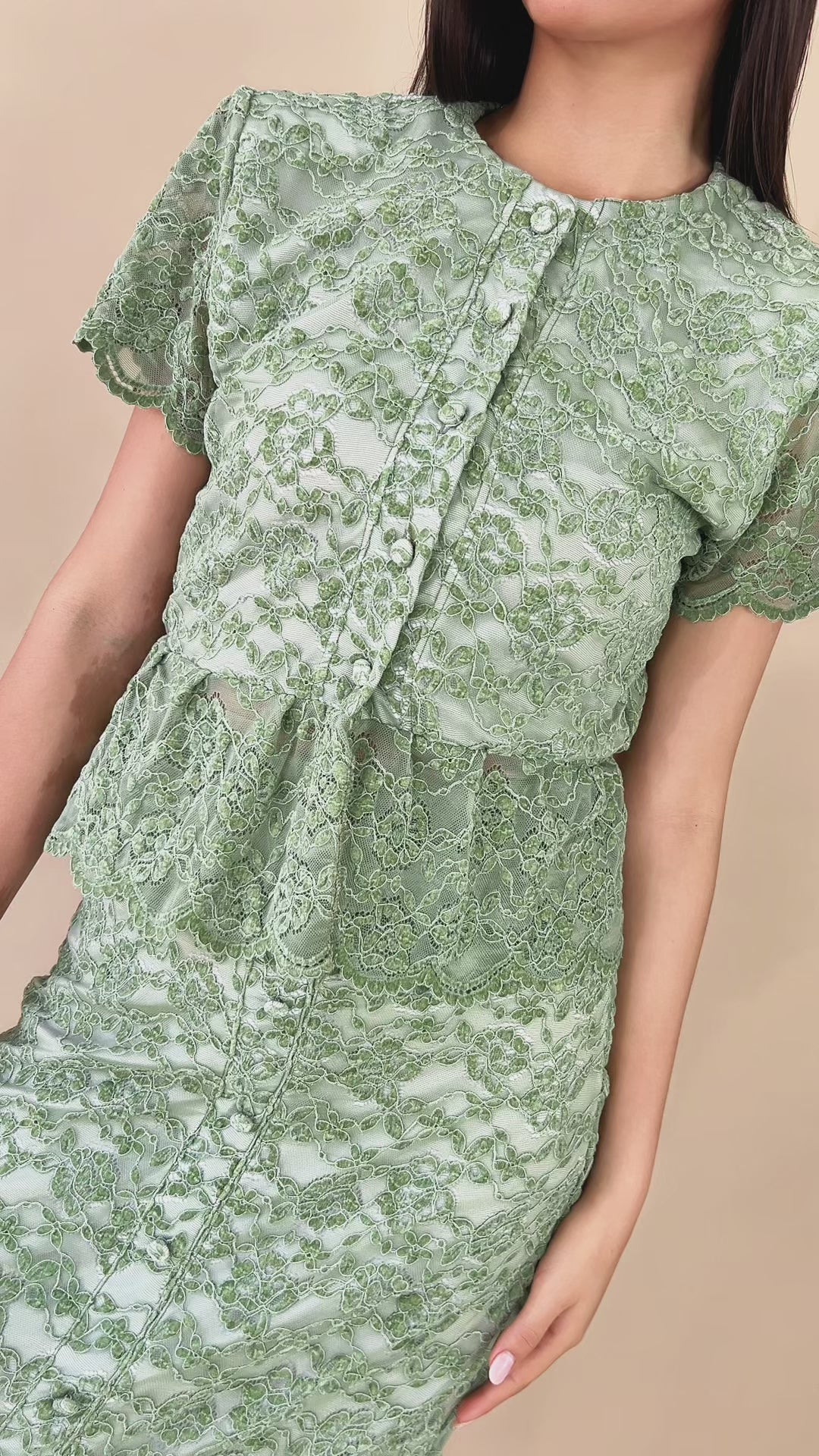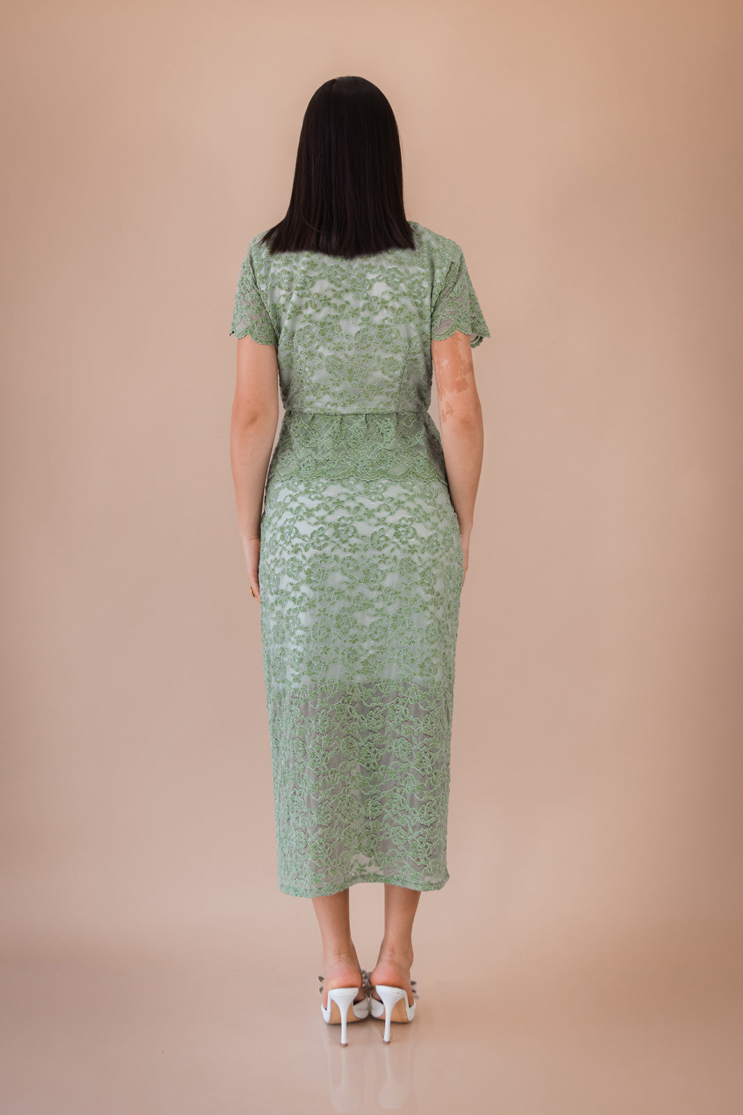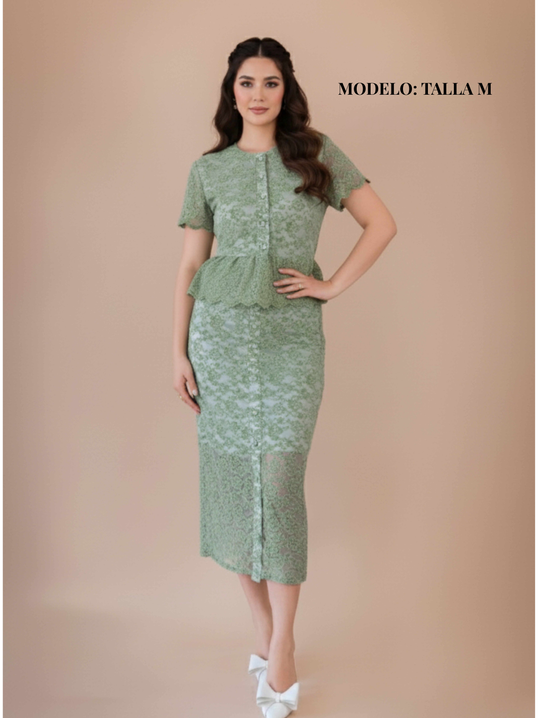 Su tono verde suave lo convierte en una pieza tan delicada como elegante y el encaje detallado lo convierten en una opción versátil para eventos formales como boda civil, primera comunión o eventos al aire libre como un brunch.
