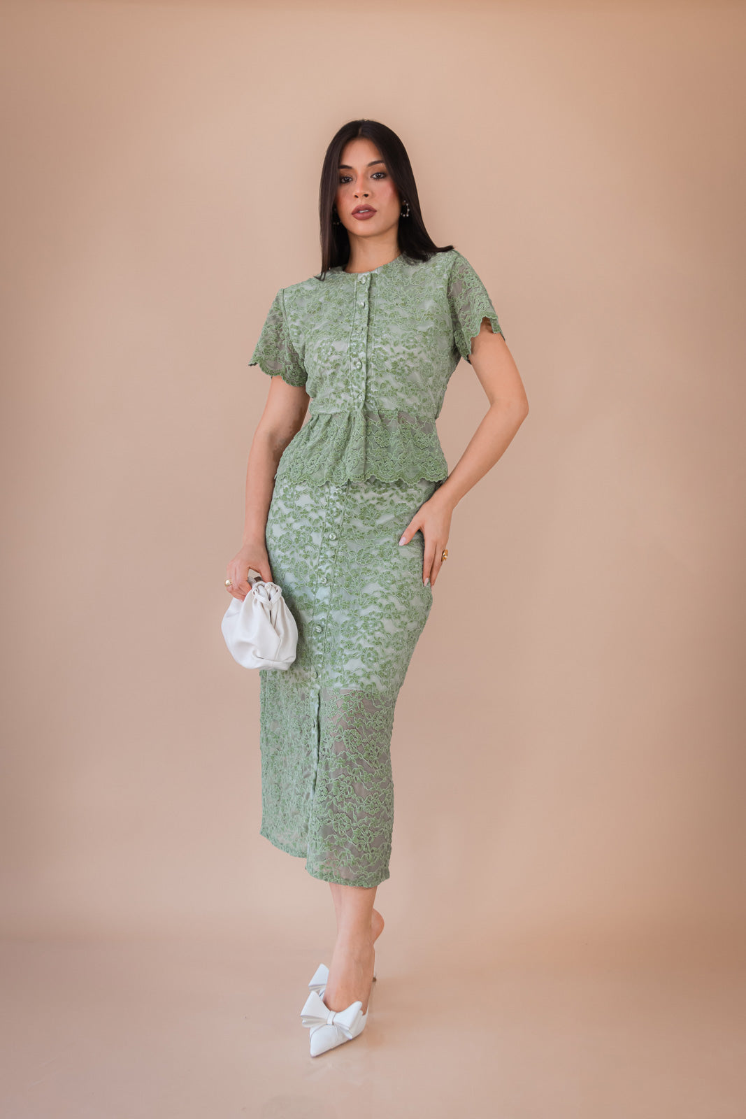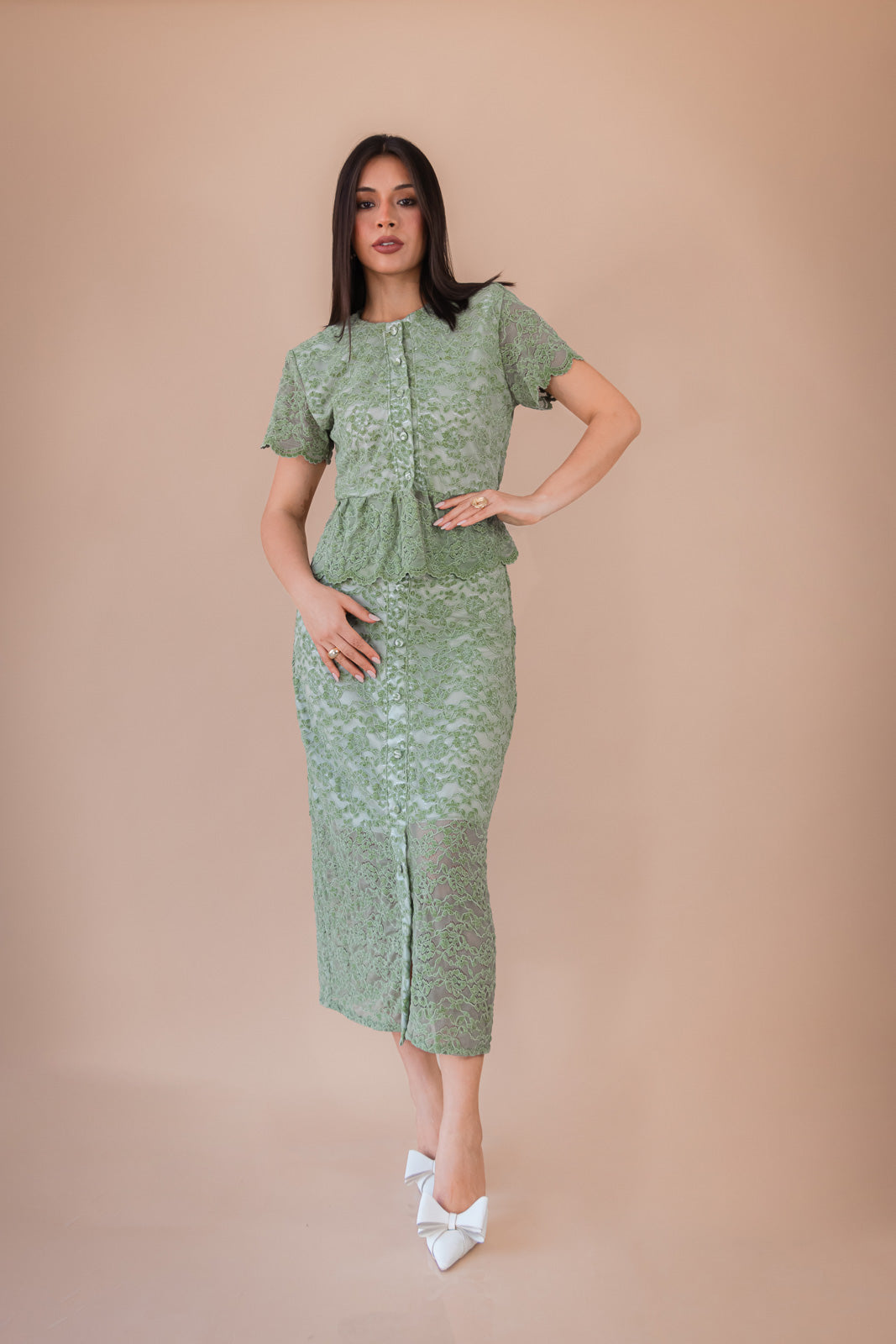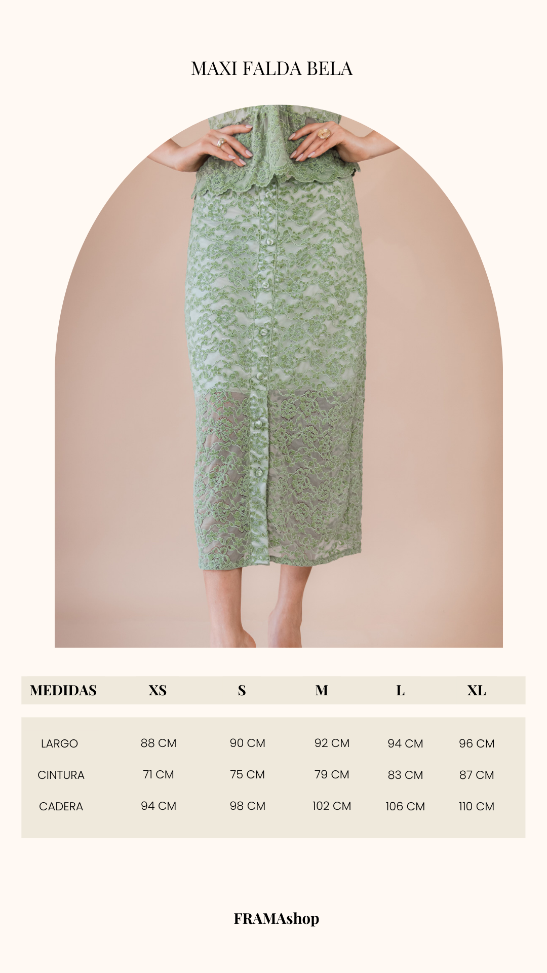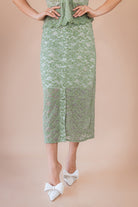 La falda midi, también en encaje, cuenta con un diseño semi-transparente en la parte inferior que aporta un toque sensual.