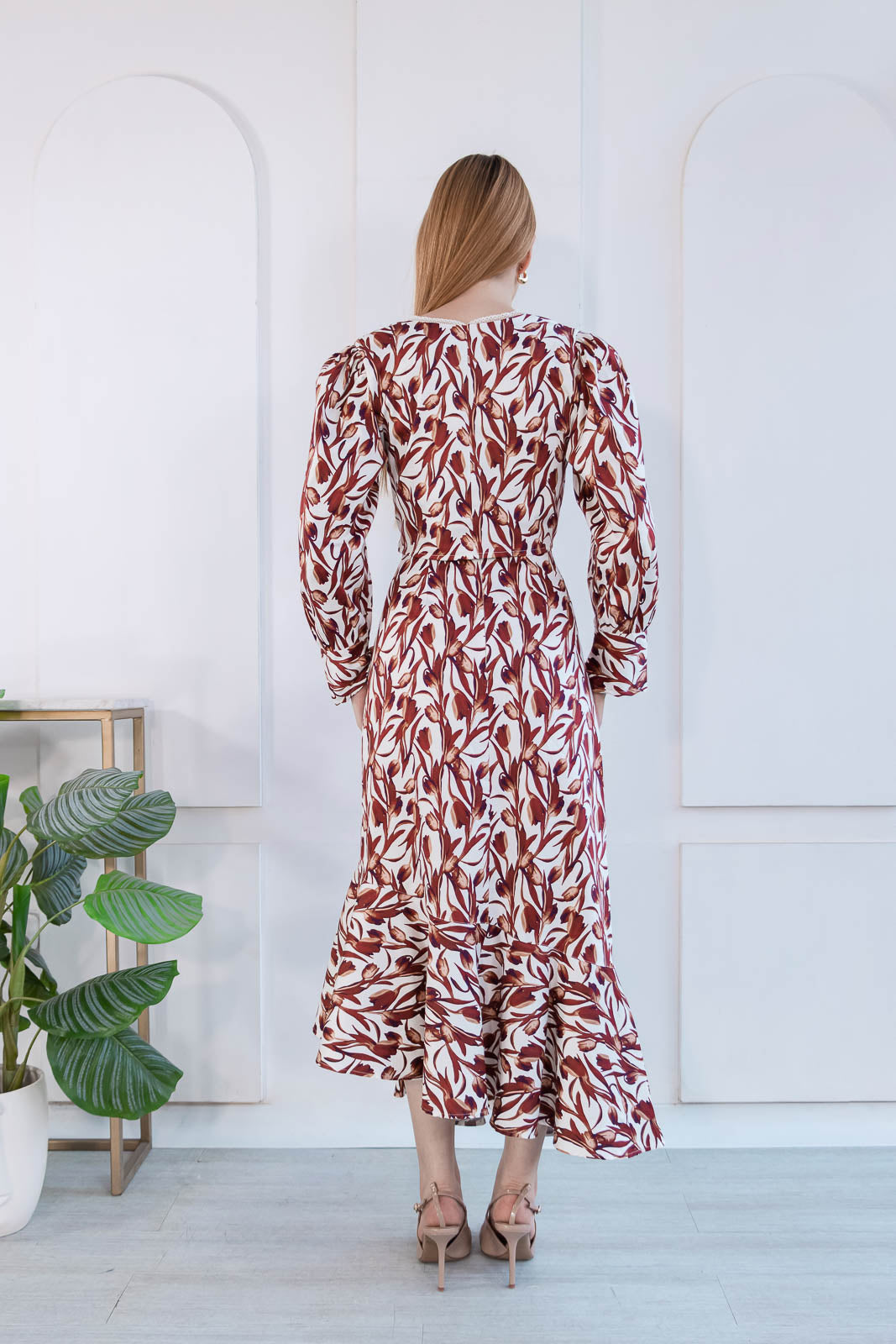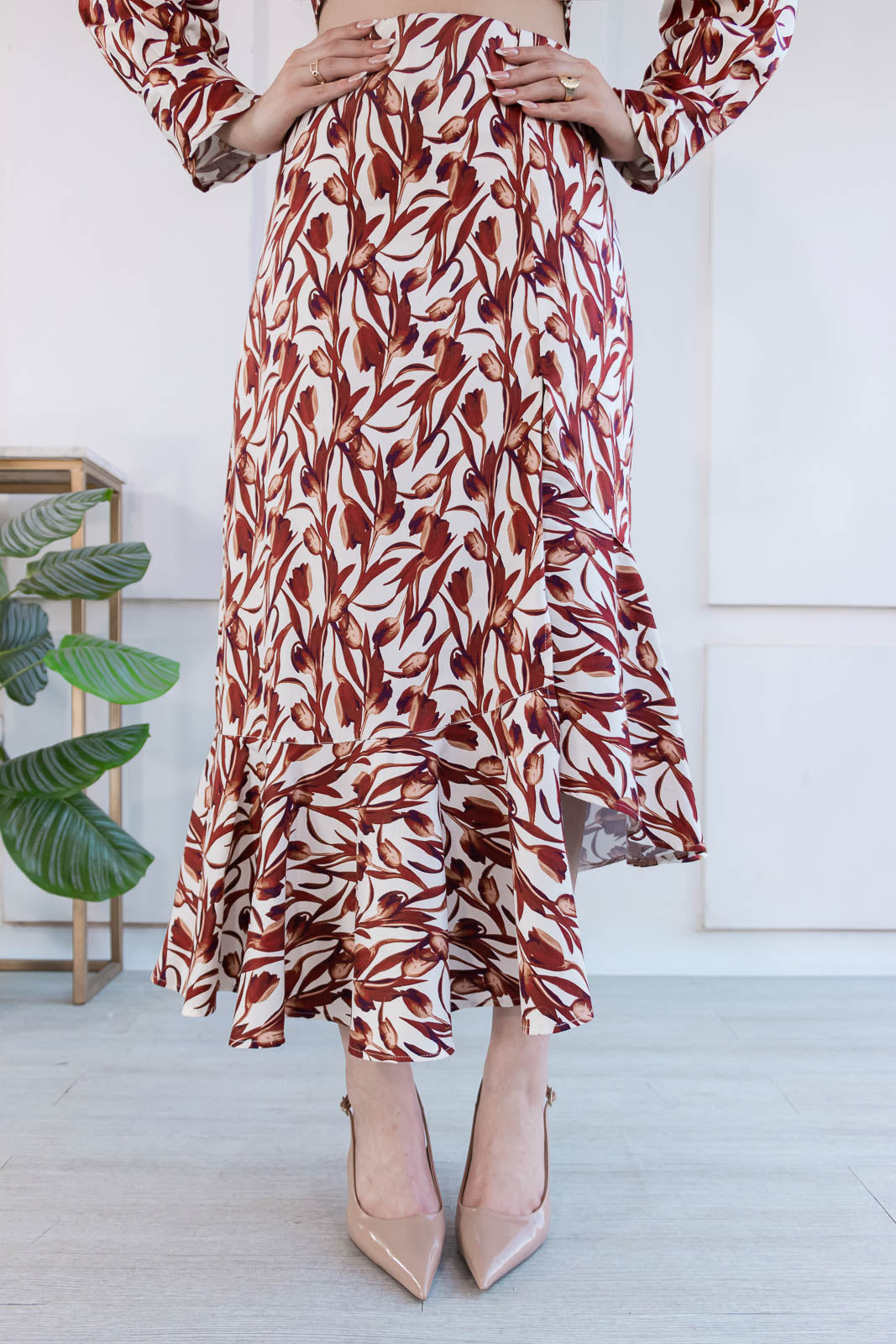 Set de dos piezas de estampado floral en tonos estampado en tonos marrón y marfil evoca la delicadeza femenina.