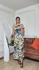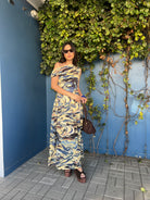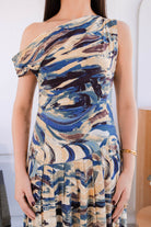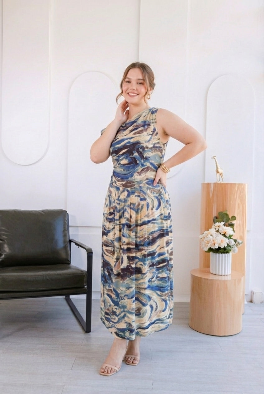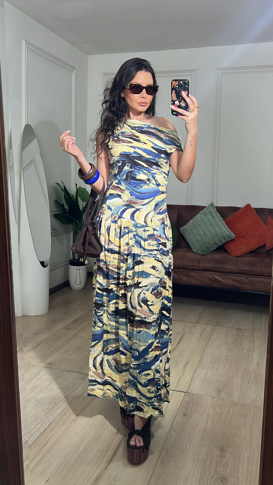 Un vestido que destaca por su estampado abstracto en tonos azules, beige y matices profundos crea un efecto visual envolvente, inspirado en pinceladas orgánicas que aportan personalidad a la prenda.
