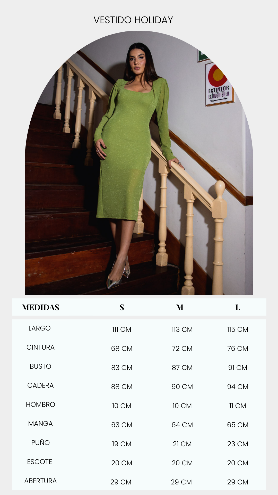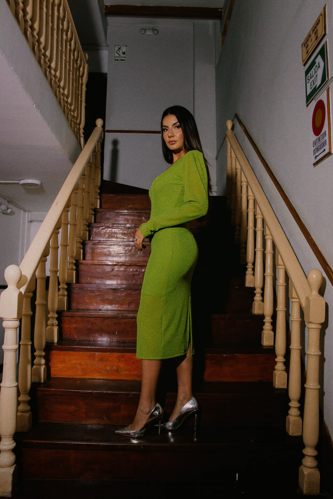 El verde manzana es un tono elegante que simboliza la prosperidad y el comienzo de un nuevo periodo. Además los vestidos midi tienen el equilibrio perfecto entre el largo y la comodidad son la clave oculta del look perfecto ya que fusiona elegancia con un toque contemporáneo que nunca pasa de moda. Vestido midi color verde con destellos de brillos, escote cuadrado y mangas largas con detalle de hombros bombachos.