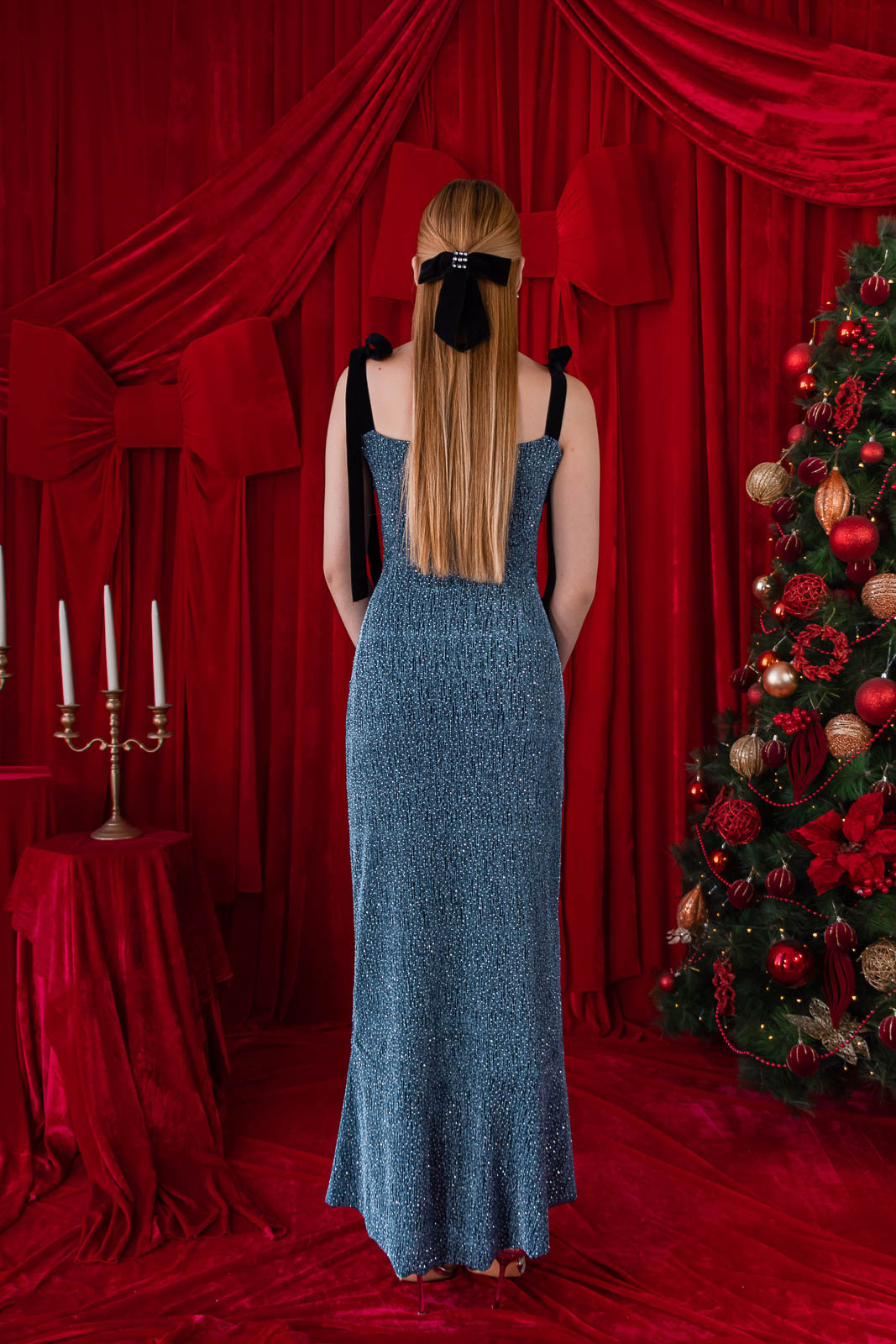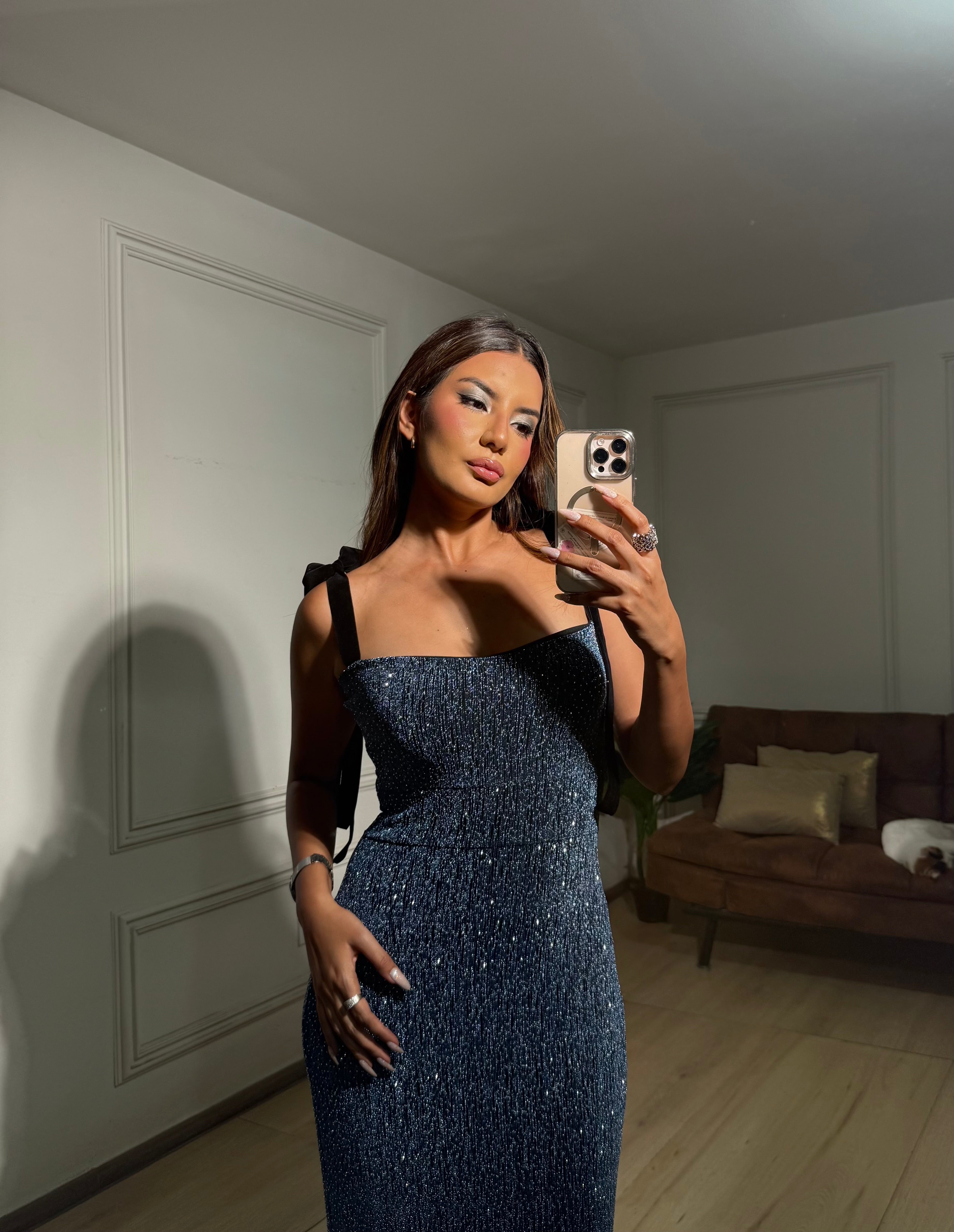 El Merry Belle es un vestido pensado para las noches especiales. Confeccionado en lycra lamé Swarovski en un tono azul profundo, es ideal para destacar con elegancia sin exagerar.