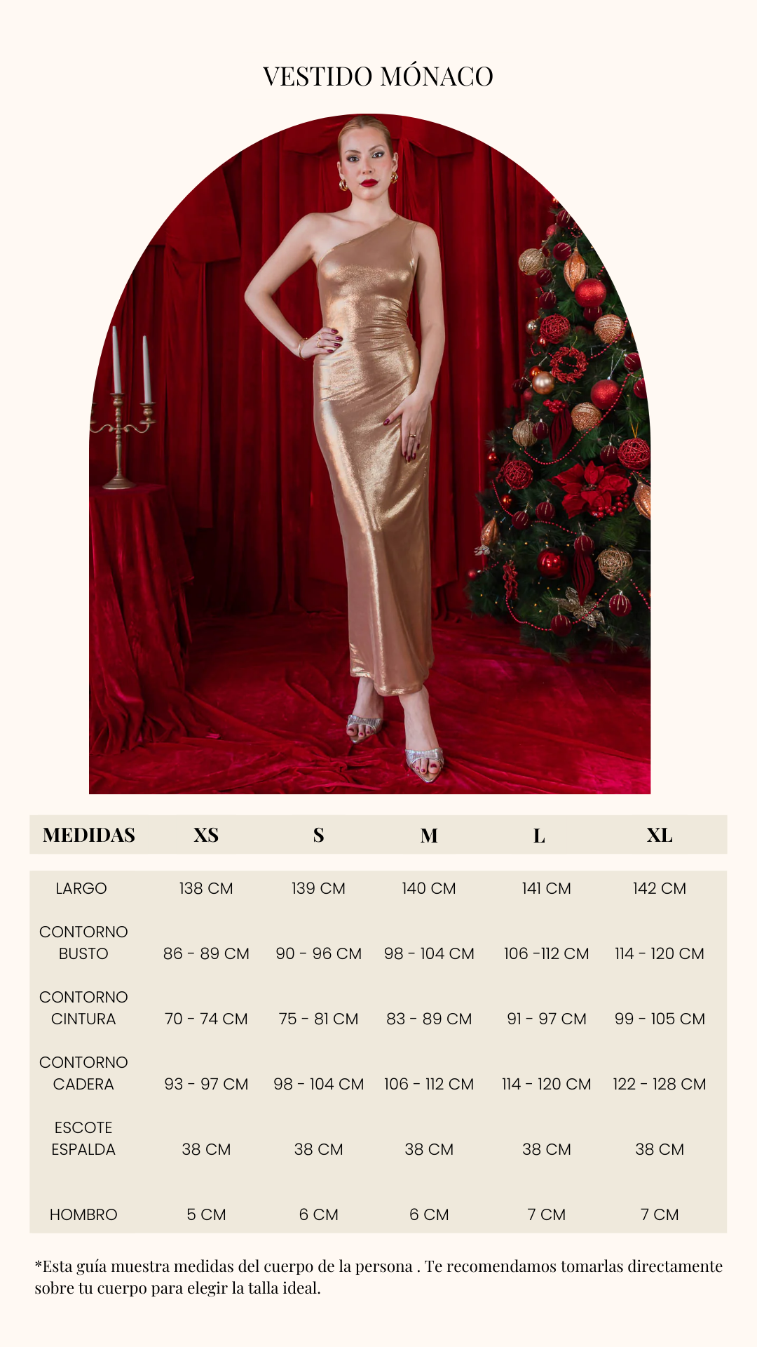 Con un diseño largo, de silueta entallada y escote asimétrico, este vestido resalta la figura femenina con sutileza y carácter. Su tono dorado, ideal para destacar en cualquier celebración, es lo suficientemente llamativo como para brillar por sí mismo; por eso luce perfecto combinado con tacones del mismo color o en tono nude.