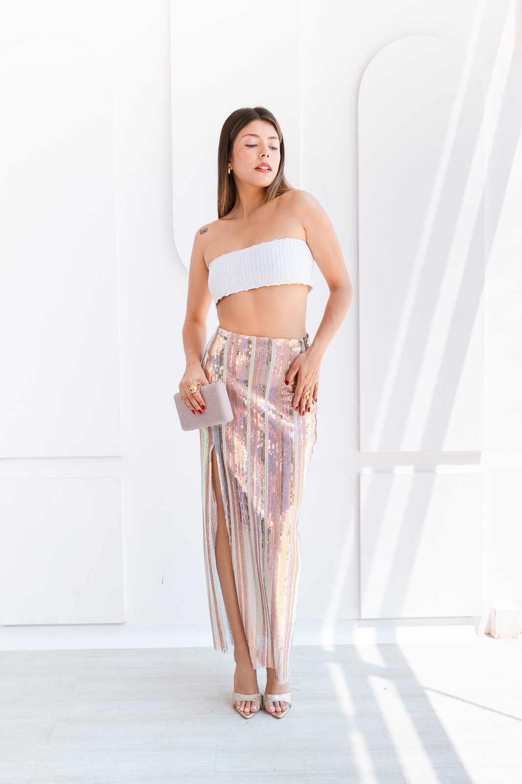 Combínala con top strapless en color blanco y accesorios en tonos dorados o nude que complementen el color de la falda.
