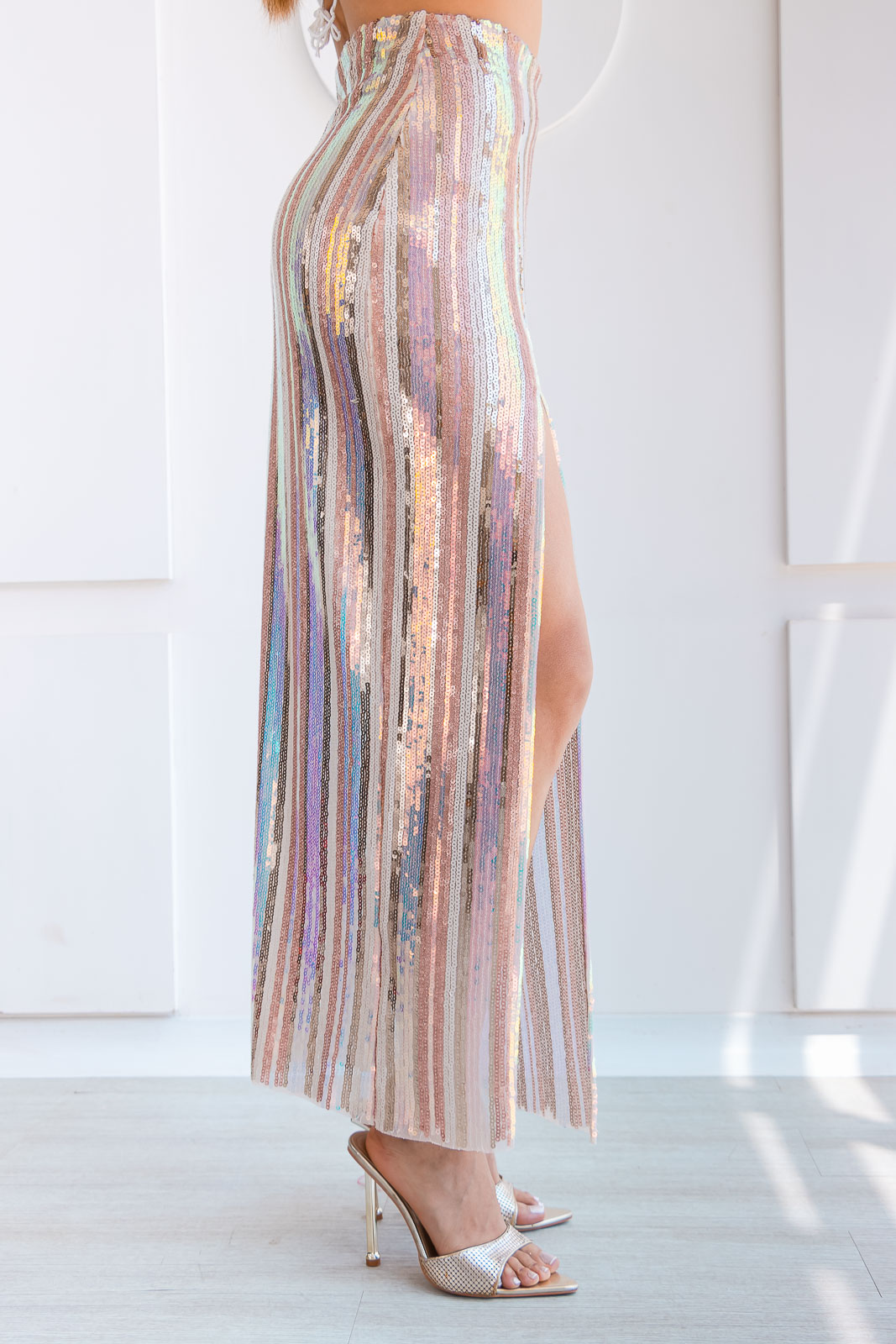 Sirena es la prenda perfecta para deslumbrar en esta temporada. Su corte fluido, tiro alto y abertura lateral agregan un toque sofisticado y sensual. Las lentejuelas en tonos pastel y dorados la convierten en un must - have para celebraciones especiales.