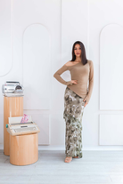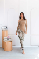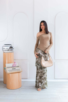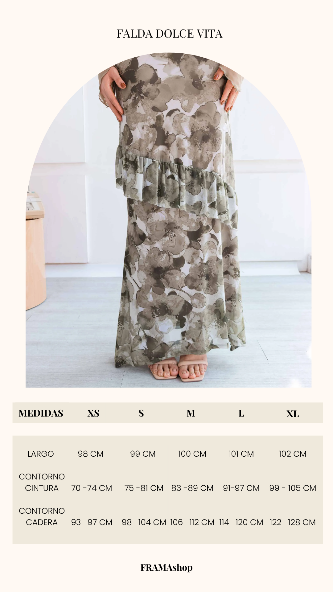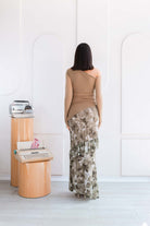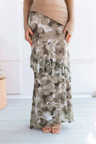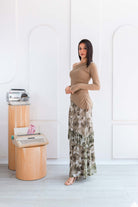 Falda larga: una pieza fluida y romántica, con un delicado estampado floral en matices verdes y beige que evocan frescura y naturalidad. Su diseño con ligeros volantes en capas añade movimiento y gracia.