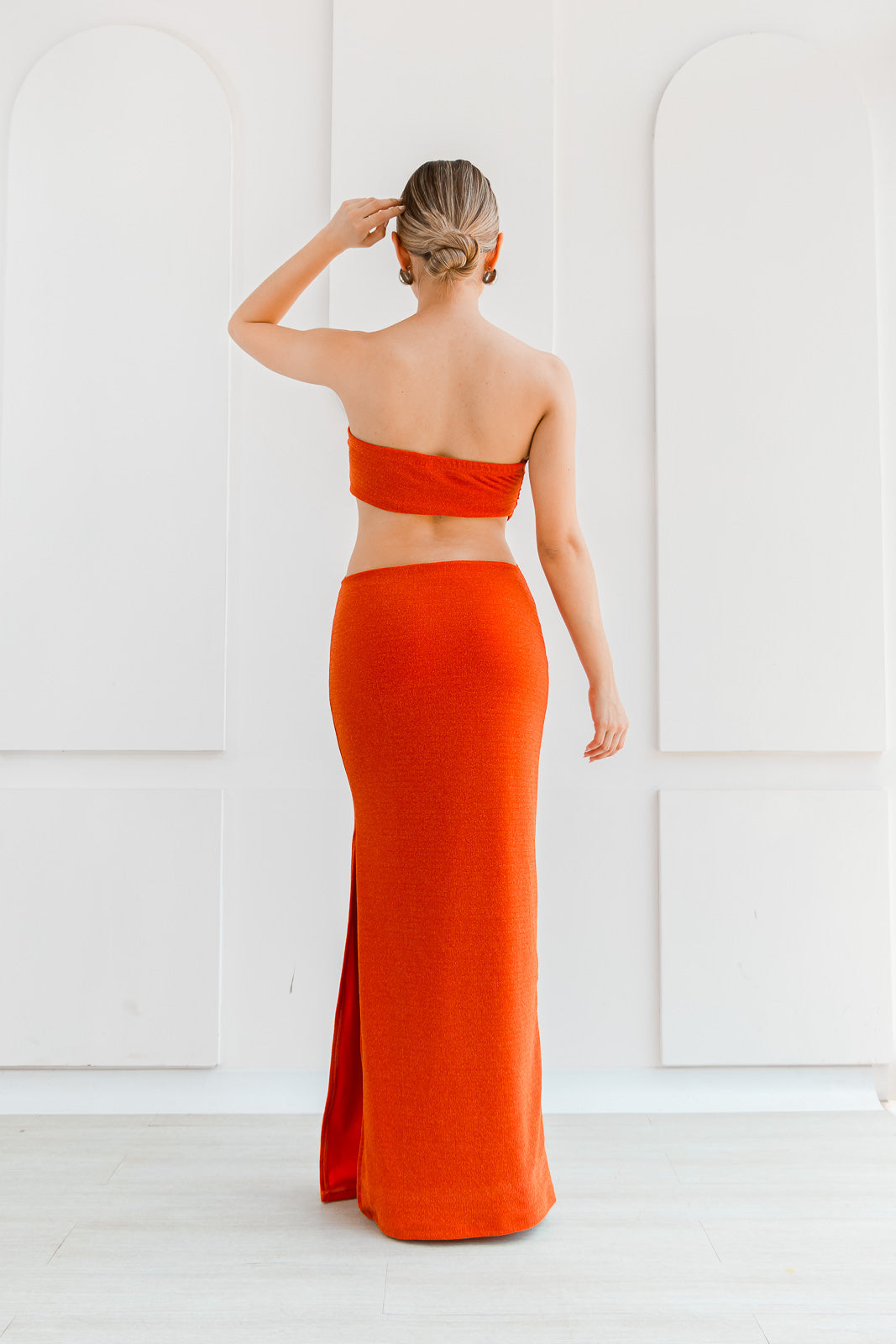 Vestido largo, ceñido al cuerpo con escote strapless, cut out en la cintura y abertura en la pierna.